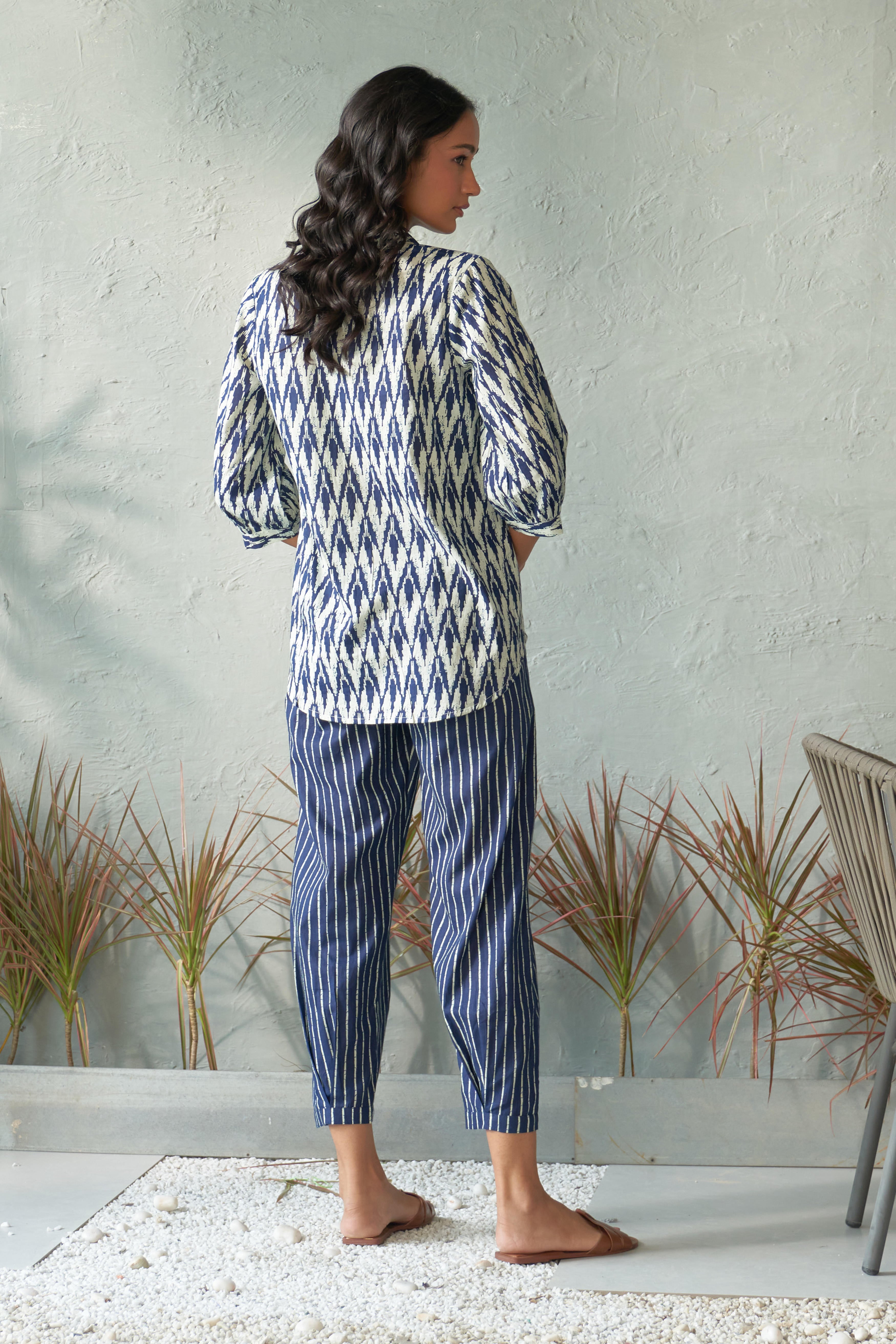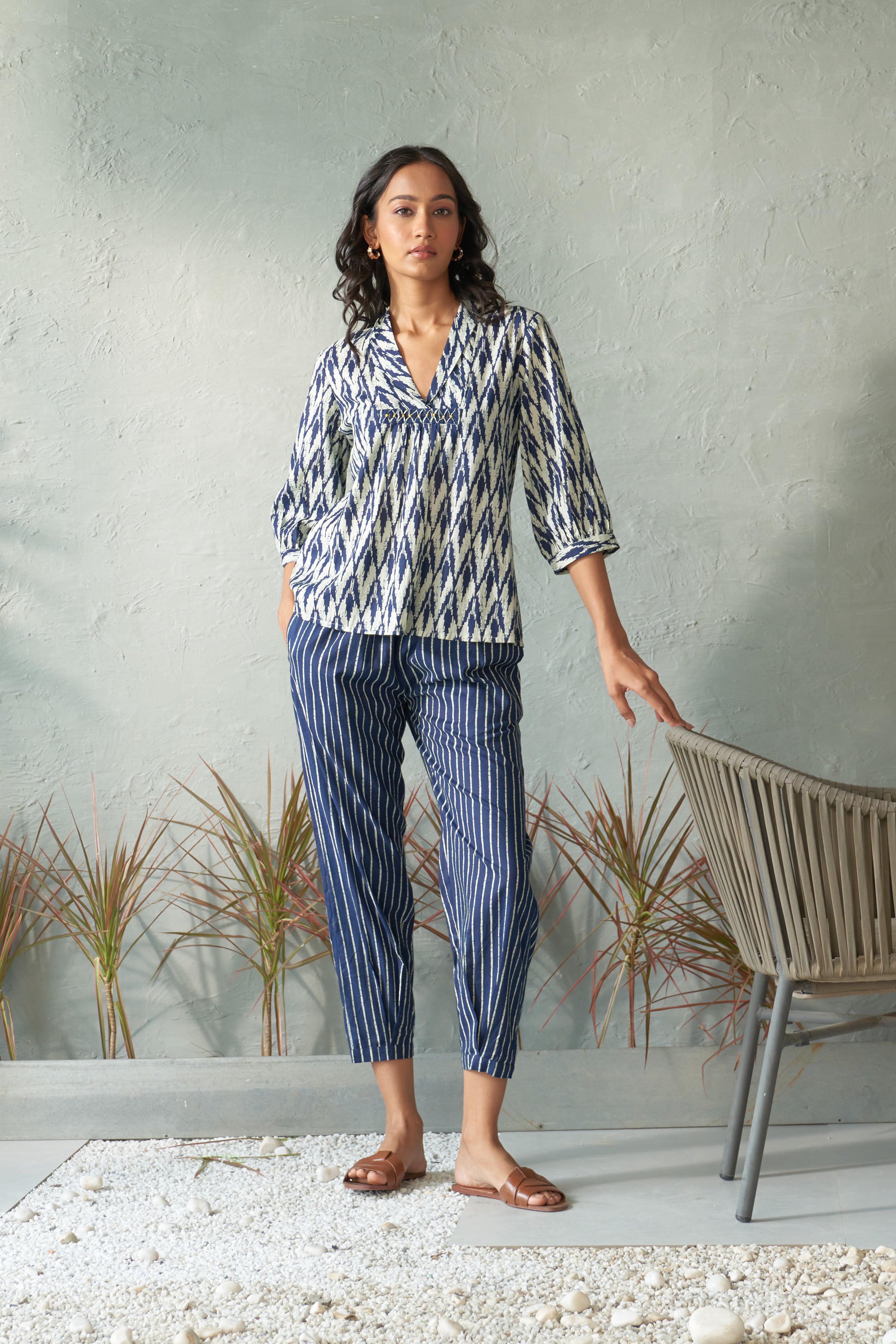 The Cascade set is the perfect combination of relaxed sophistication and chic styling. The Breeze Top, crafted from lightweight cotton with a delicate chevron print, showcases a flattering V-neckline, subtle smocking details at the front, and 3/4th sleeves for an elegant yet casual look. Paired with complementing pleated stripe pants, this co-ord set strikes the perfect balance between structure and comfort. The elasticated waistband and drawstring on the bottoms ensure a customizable fit, making it an ideal outfit for effortless day-to-night transitions.