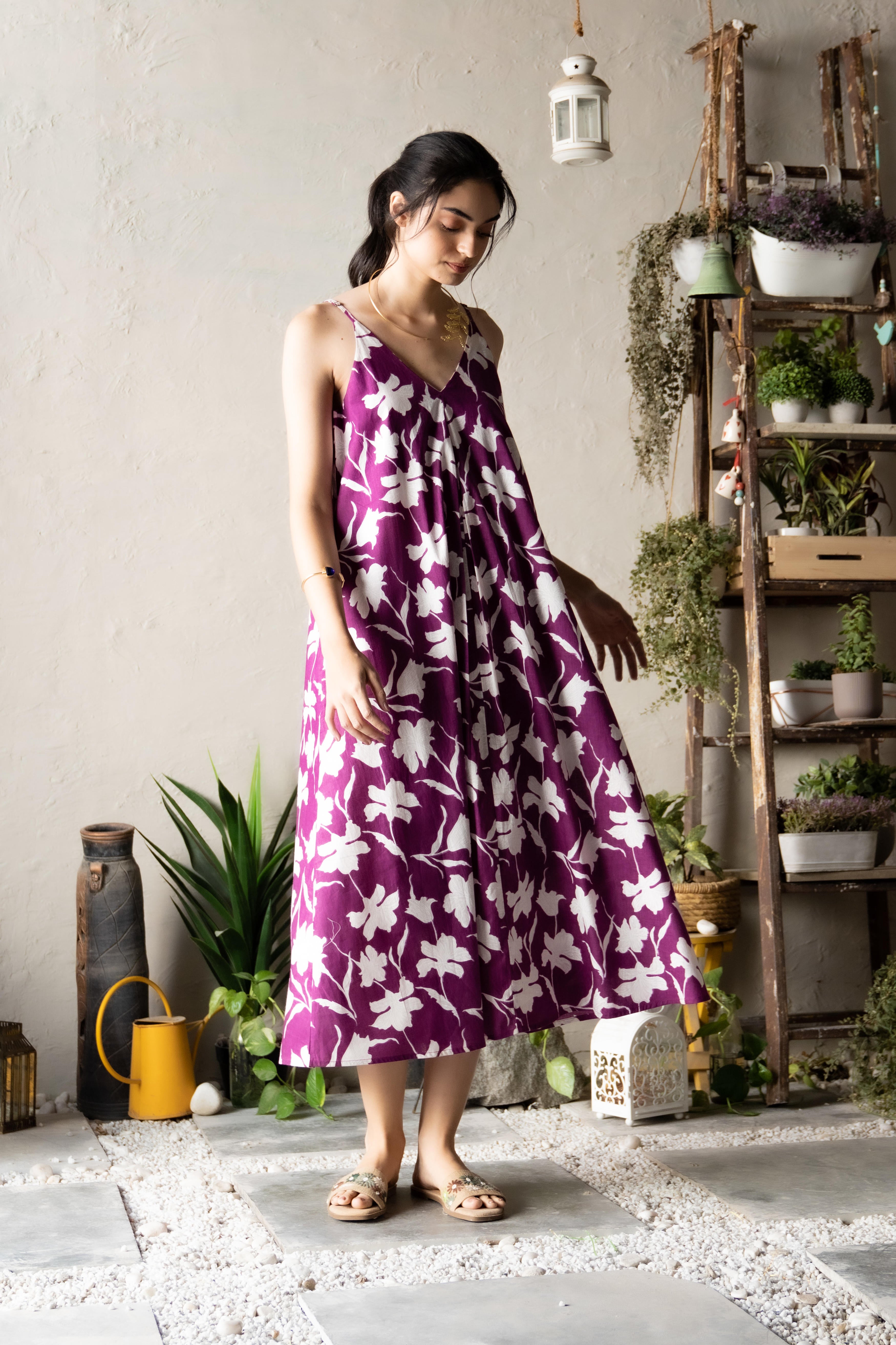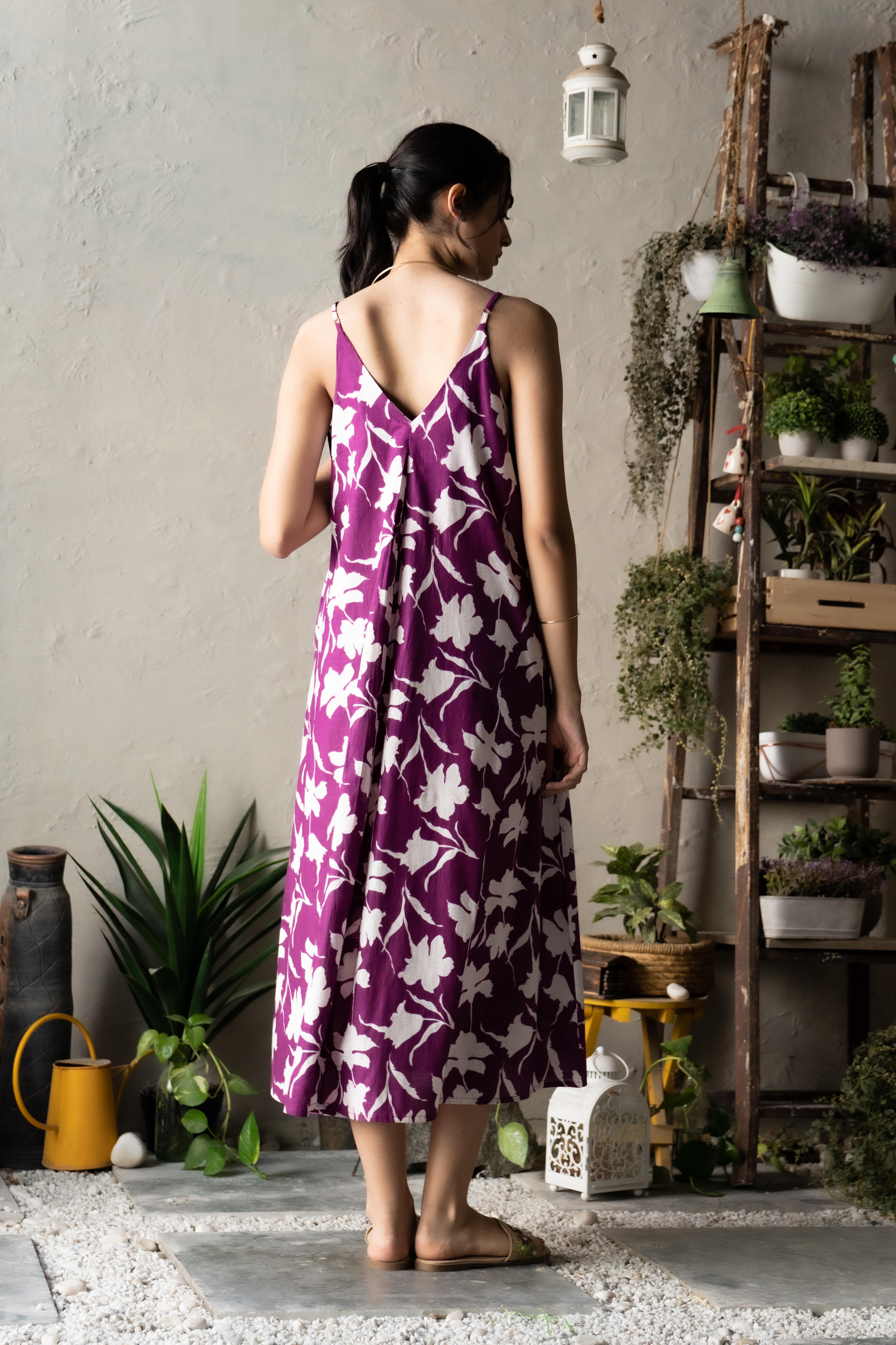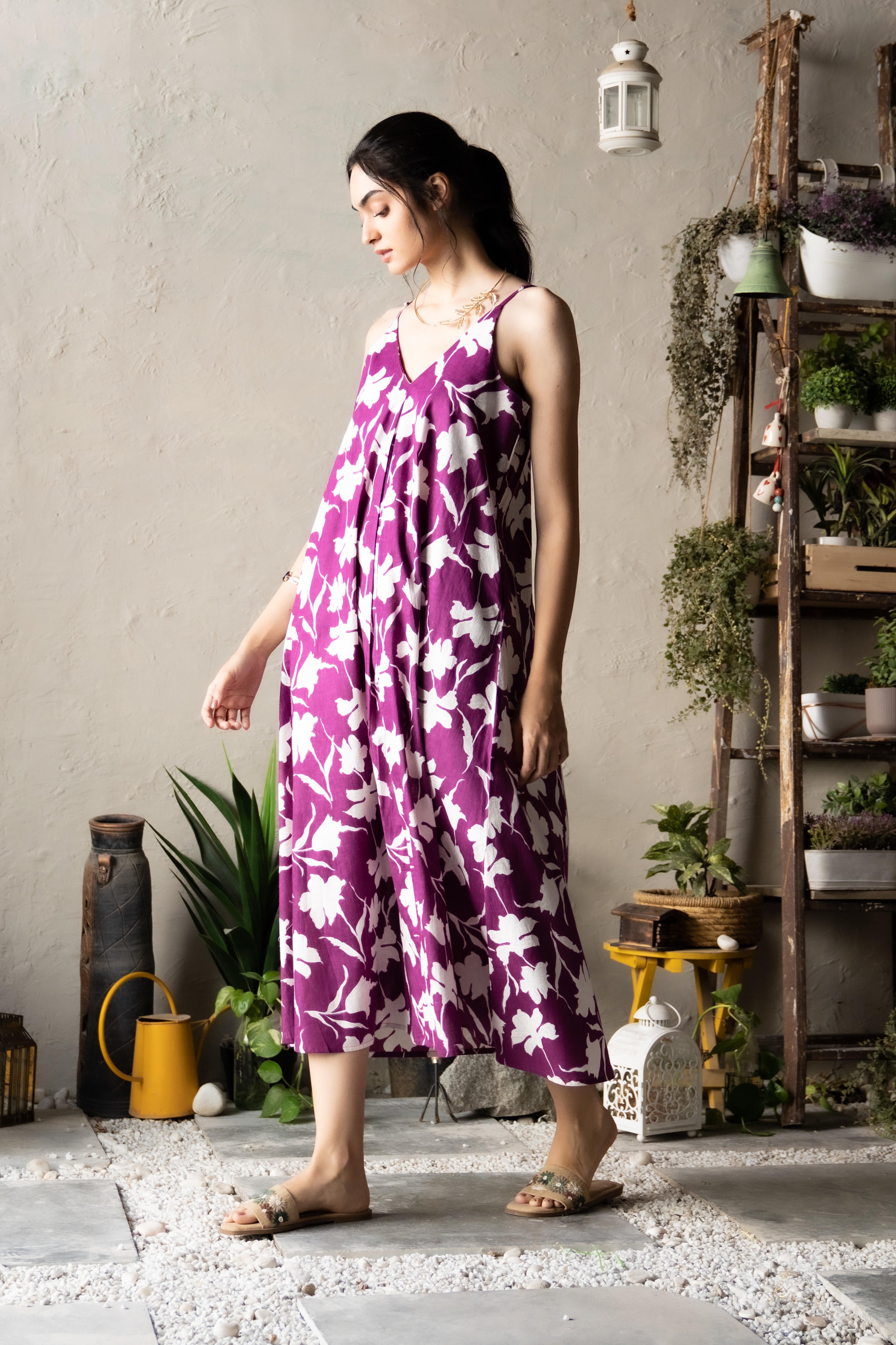 Step into effortless elegance with the Courtyard Charm Dress. Crafted from soft, breathable fabric, this dress in a rich orchid hue features delicate leaf shadow patterns, evoking the calm of moonlit gardens. Its flattering A-line silhouette, gathered V-neckline, and flowy skirt make it perfect for day-to-evening transitions.
