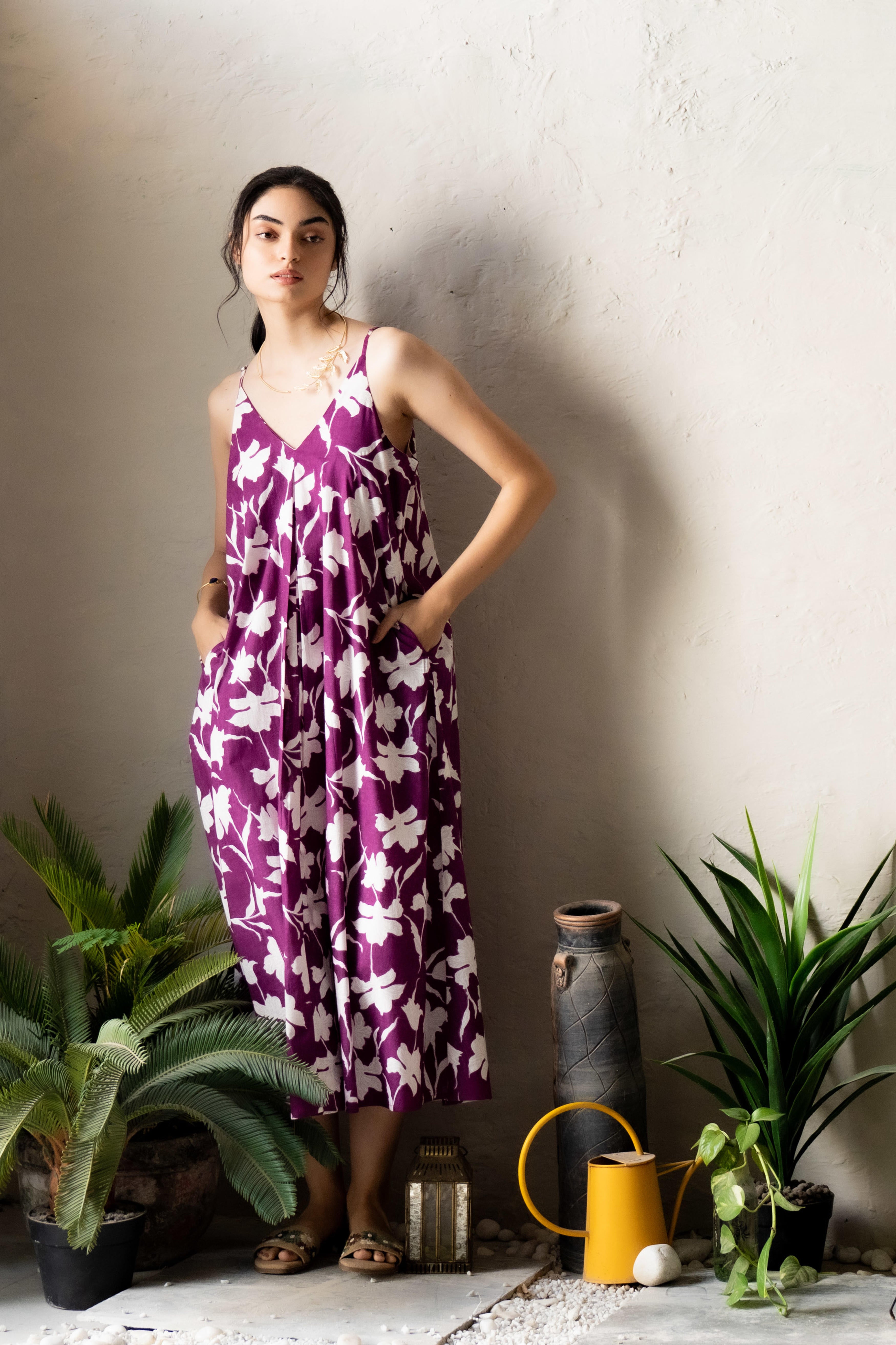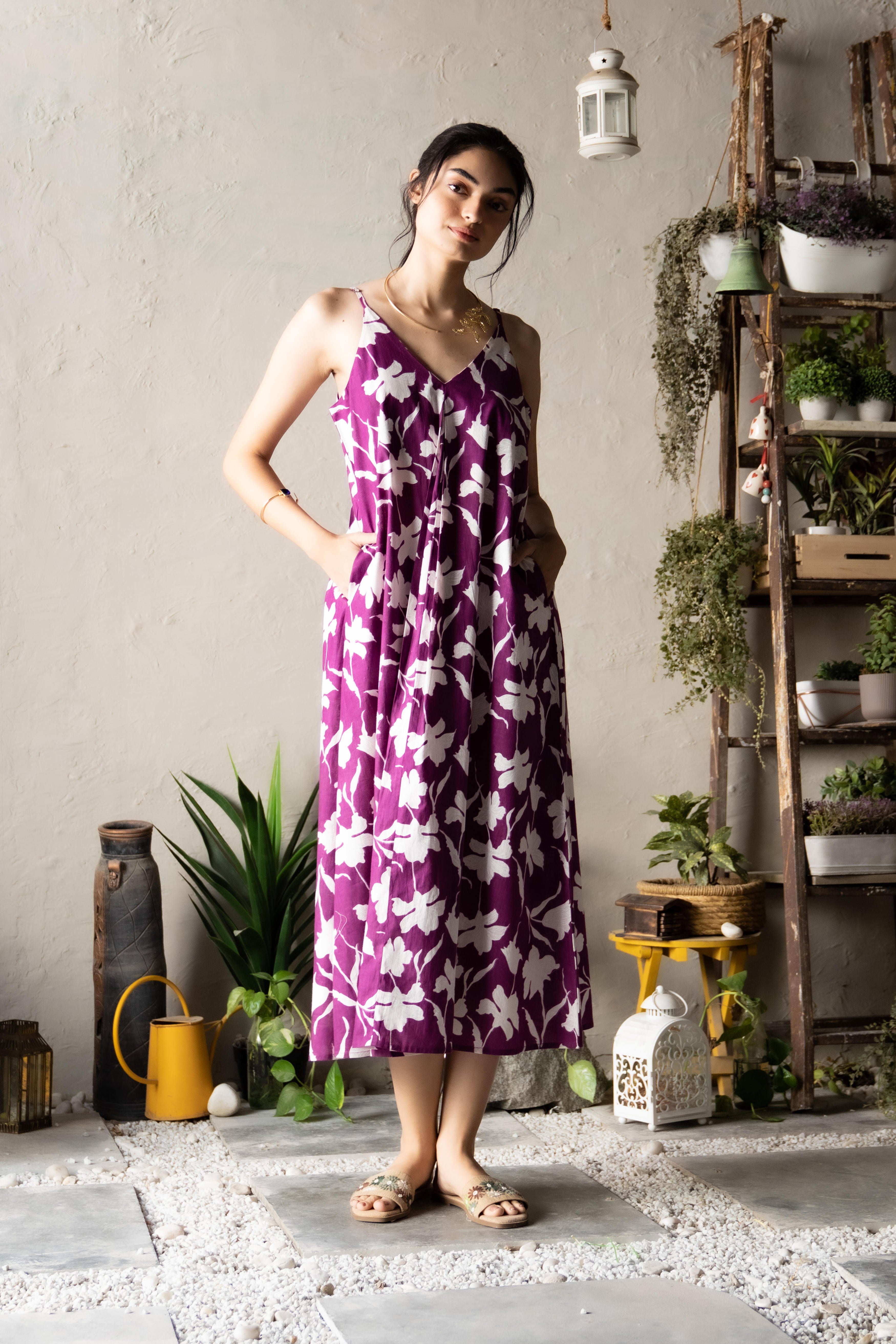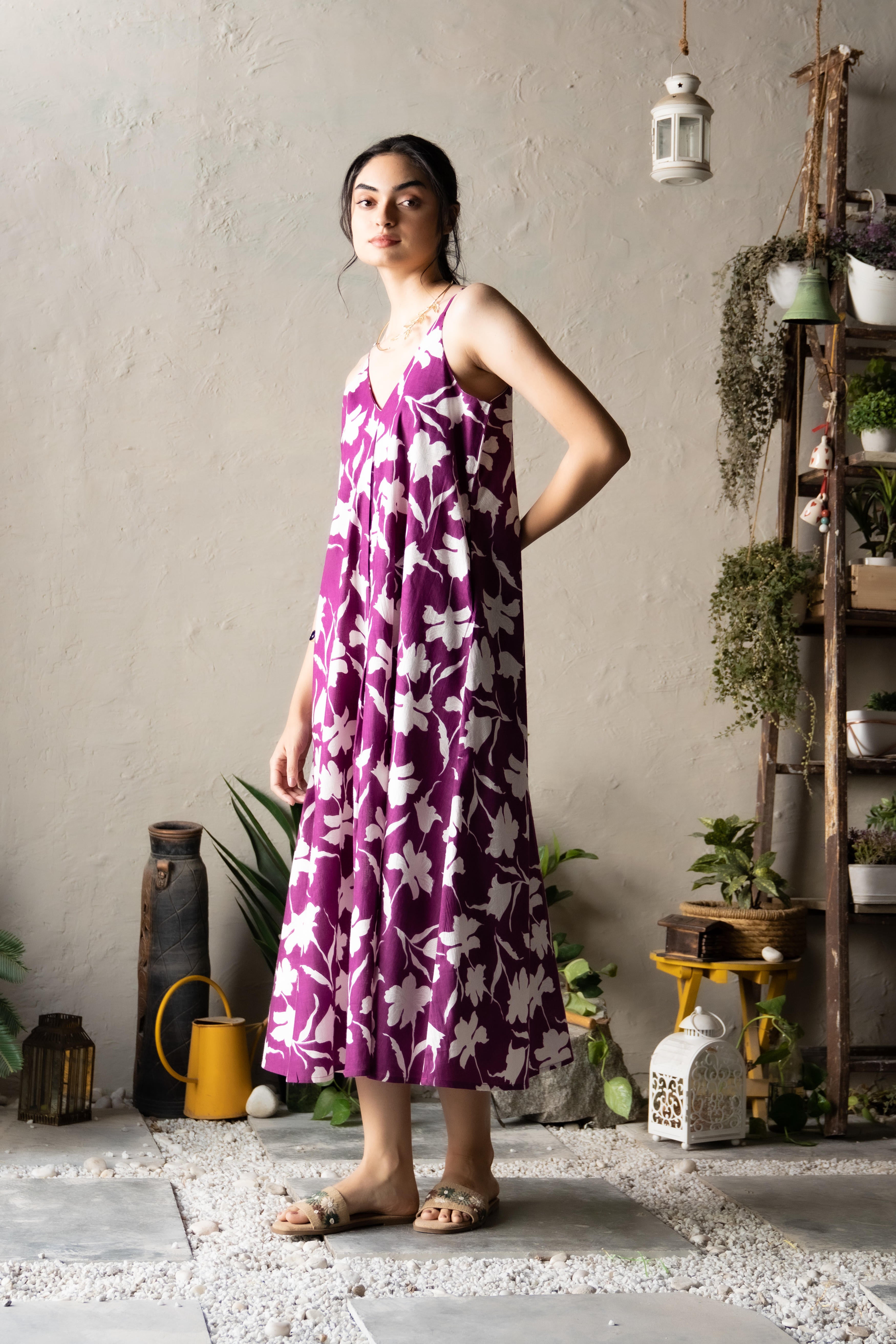 Step into effortless elegance with the Courtyard Charm Dress. Crafted from soft, breathable fabric, this dress in a rich orchid hue features delicate leaf shadow patterns, evoking the calm of moonlit gardens. Its flattering A-line silhouette, gathered V-neckline, and flowy skirt make it perfect for day-to-evening transitions.