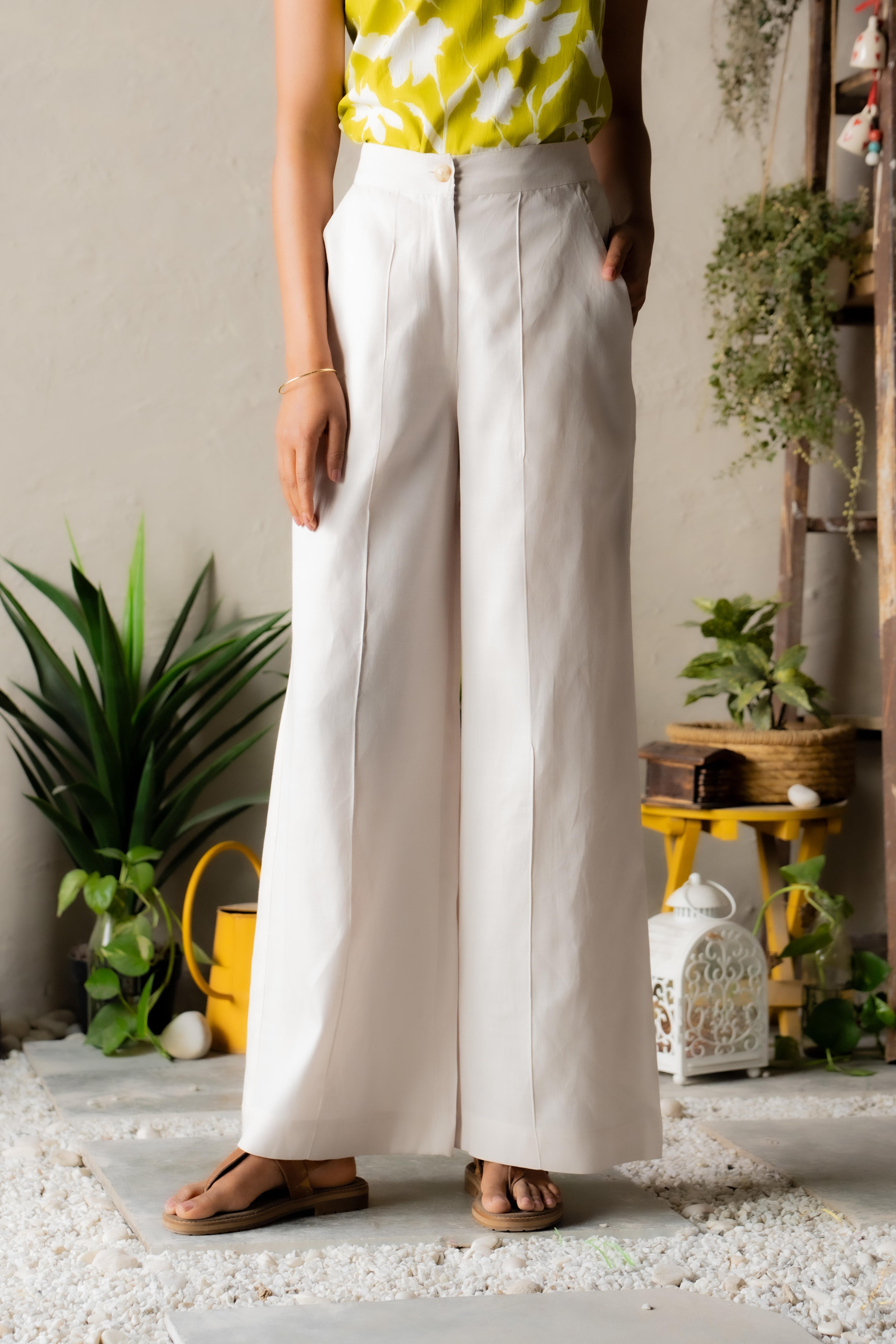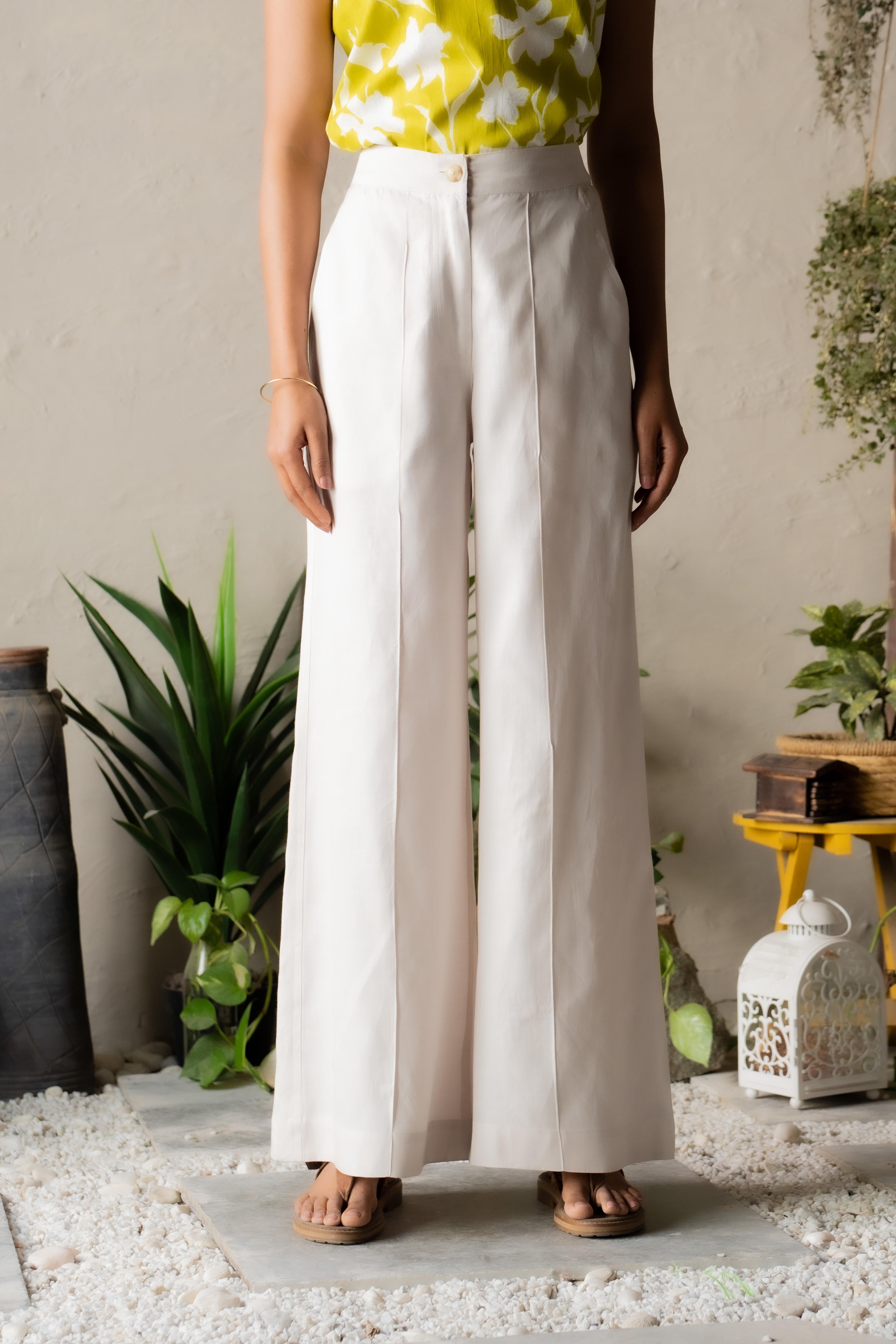 Elevate your style with the Glazed Whisper Pants, designed in a chic white hue with a subtle glaze of grey. These fitted flared bottoms seamlessly combine a sleek, form-fitting design with a stylish flare at the hem, creating an elegant, elongated silhouette. The front stitch detailing adds a polished touch, making these pants a versatile addition to your wardrobe.