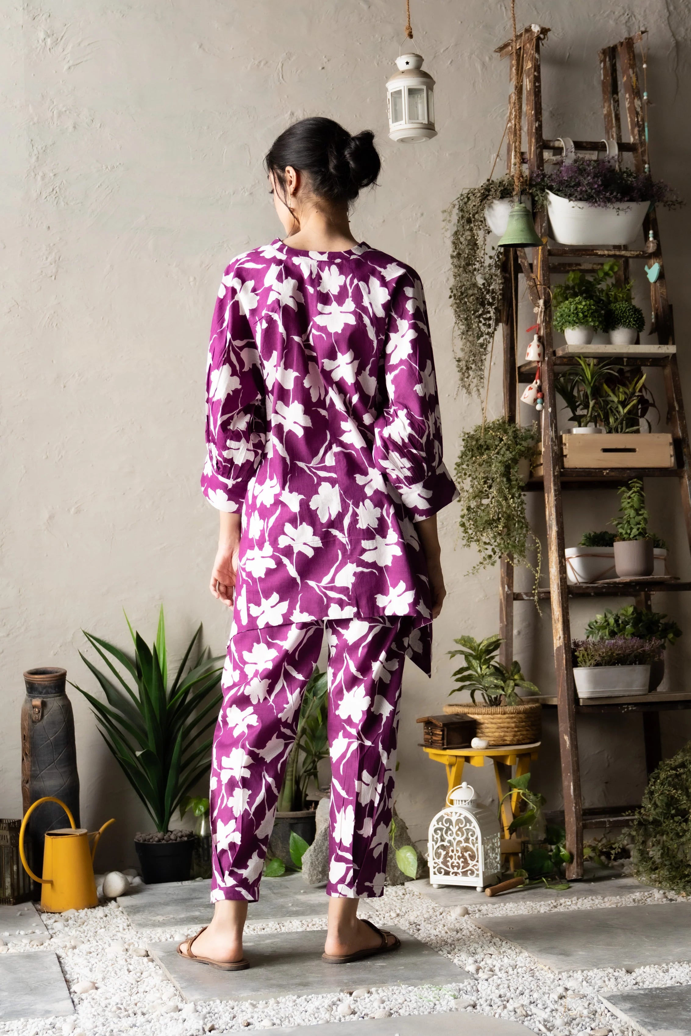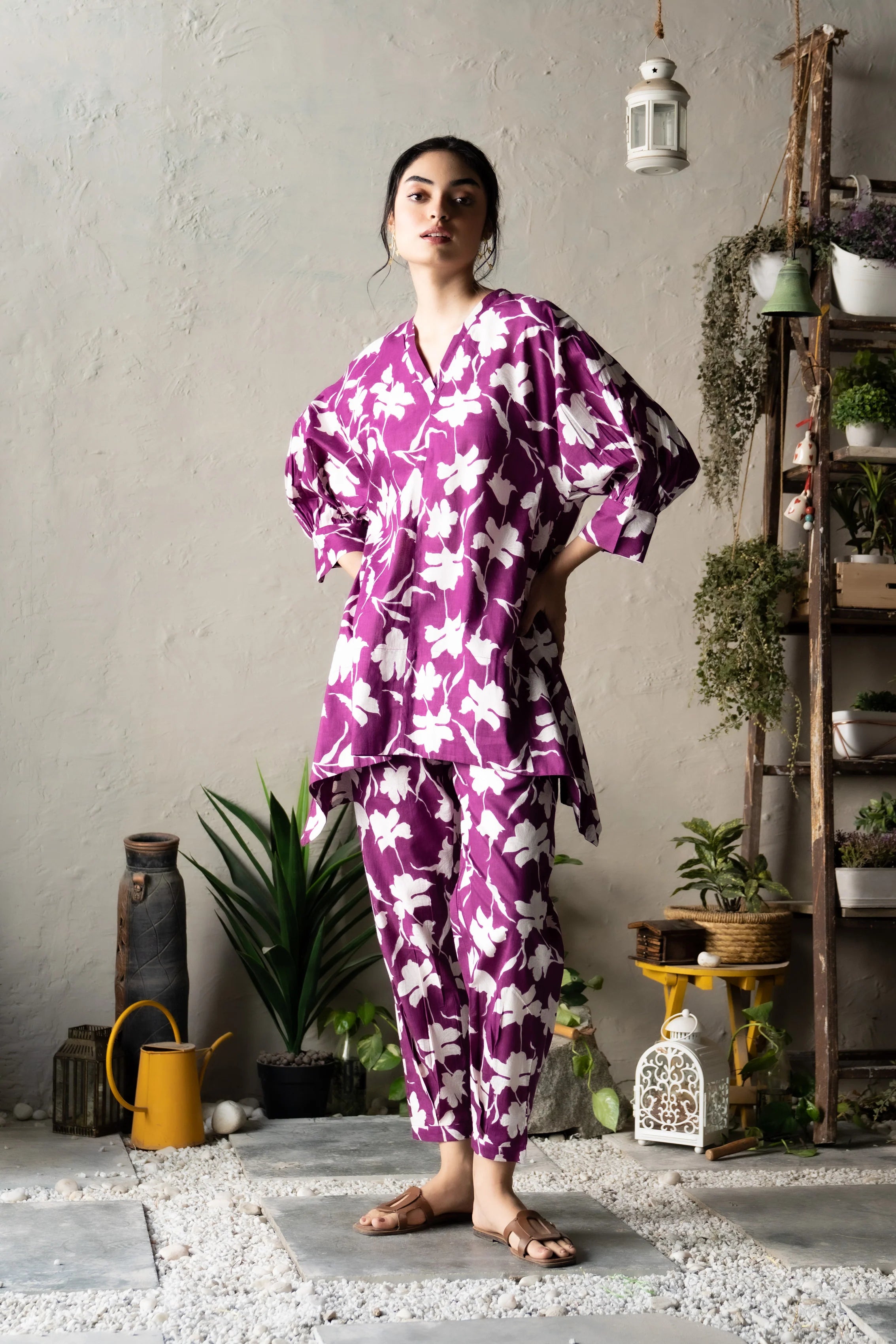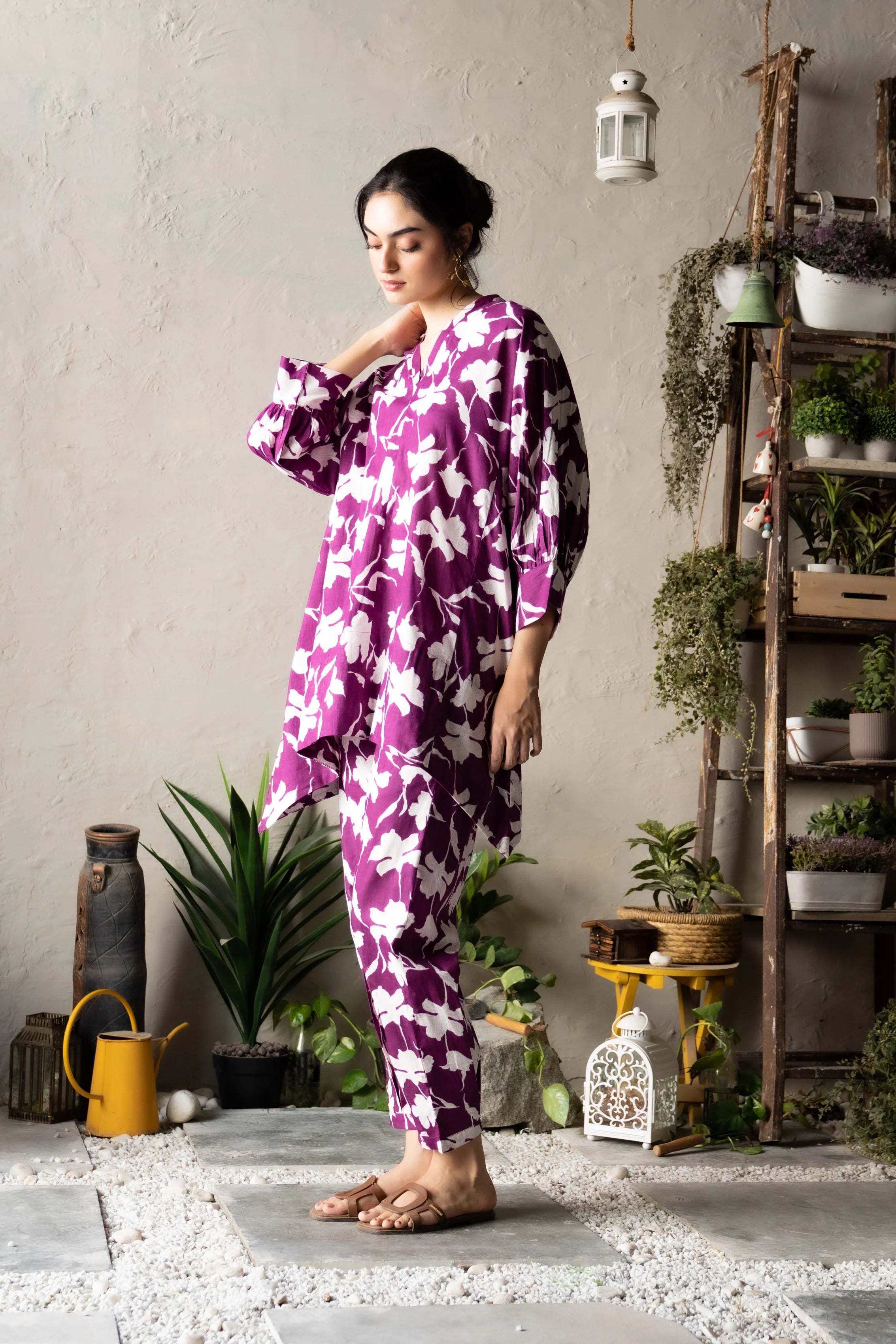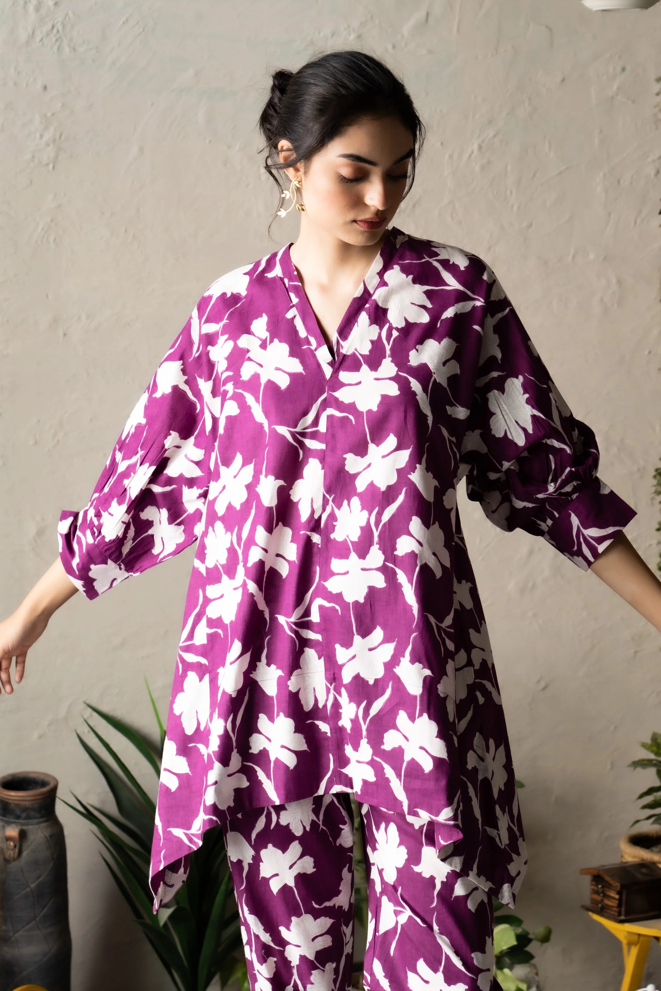 Step into effortless elegance with the Alcove Bliss Set, a popular Canoopi design that combines modern style with ultimate comfort. The top features a unique asymmetrical hem for an easy-breezy vibe. Its voluminous raglan sleeves with cuffs and a contemporary V-neckline enhance the relaxed silhouette. Paired with perfectly tailored pleated pants, this coord set in a refreshing orchid hue is a must-have addition to your discovery wardrobe.