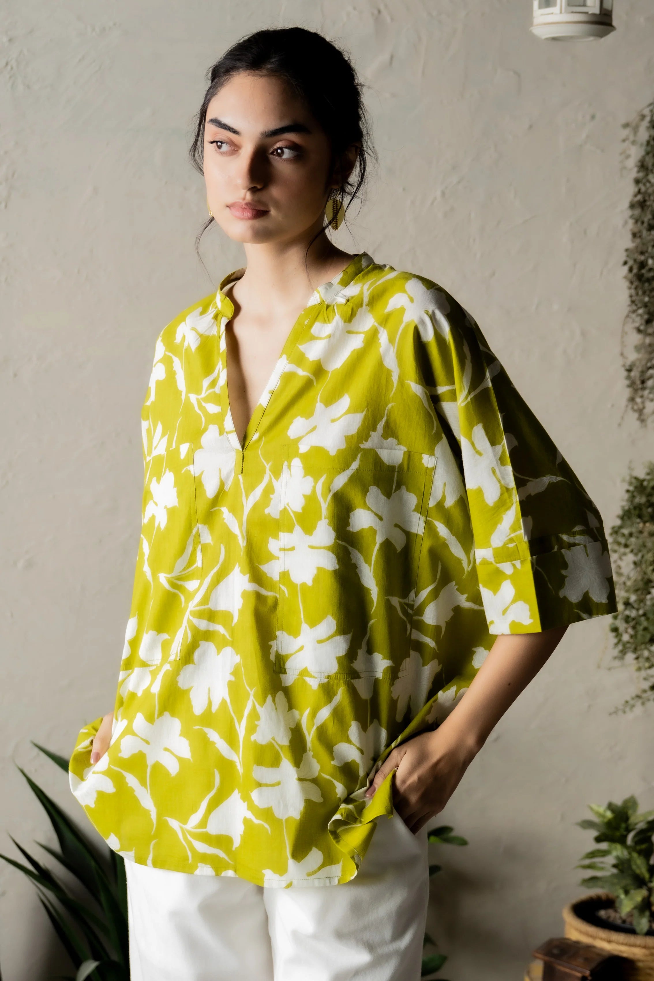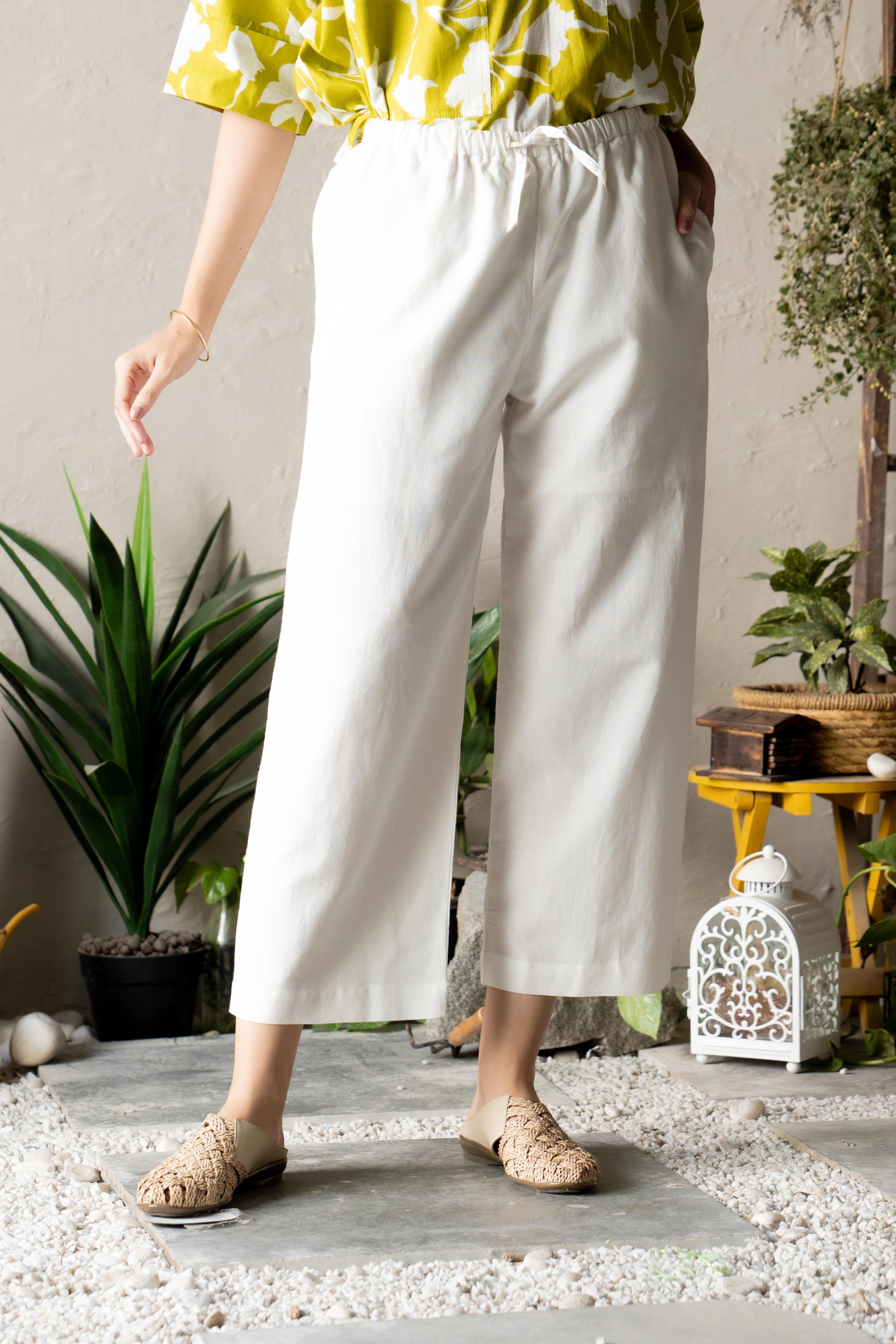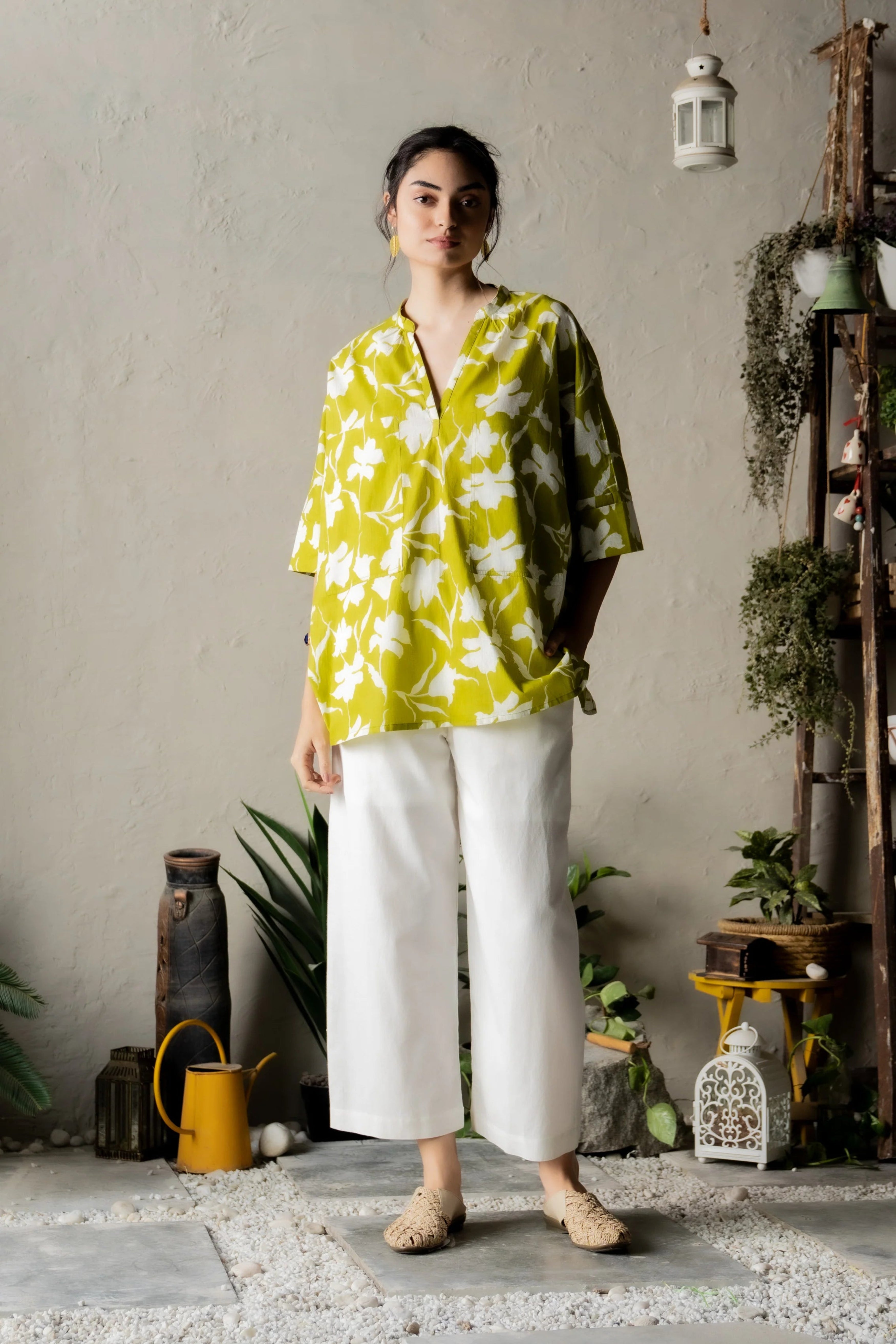 Discover the carefree charm of the Pergola Charm Set, featuring a lime green top and classic white pants. The top is designed with a relaxed silhouette, a flattering V-neckline, and bold front pockets for a blend of style and functionality. Crafted from lightweight cotton, it provides a barely-there feel, ensuring comfort throughout the day. Paired with white pants that boast a narrow elastic waistband, an adjustable drawstring, and practical side pockets, this set effortlessly balances elegance with everyday ease. Perfect for casual outings or laid-back afternoons, it's a wardrobe essential.