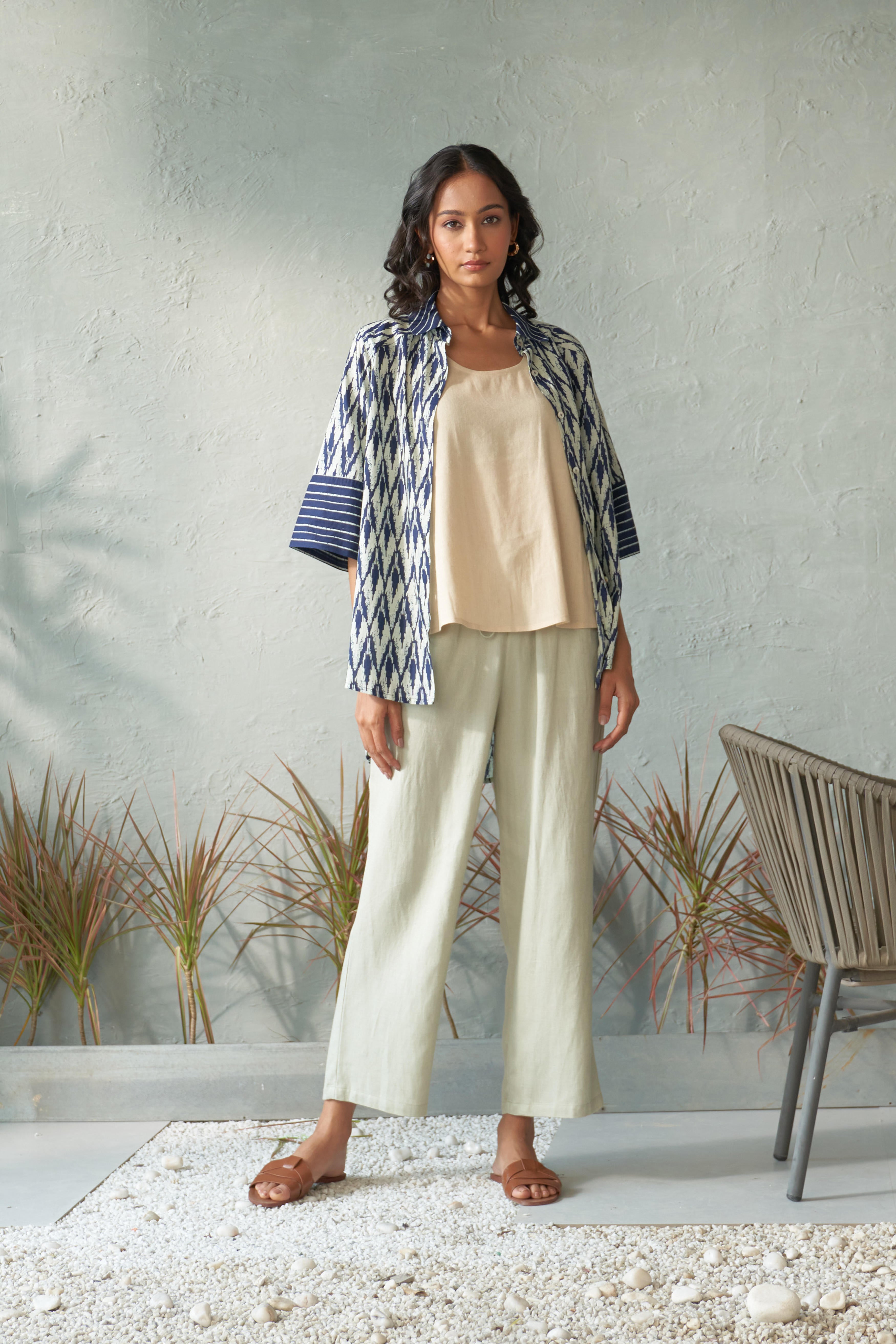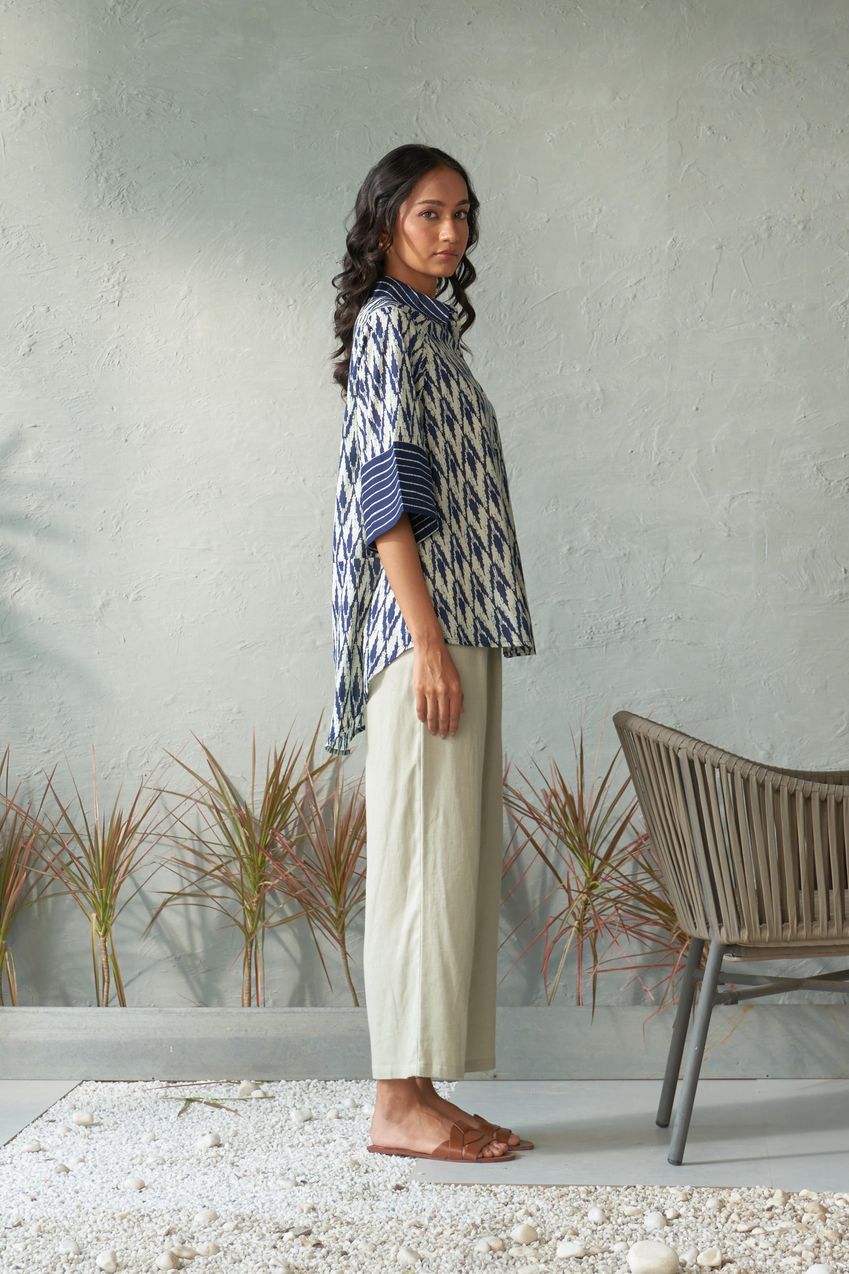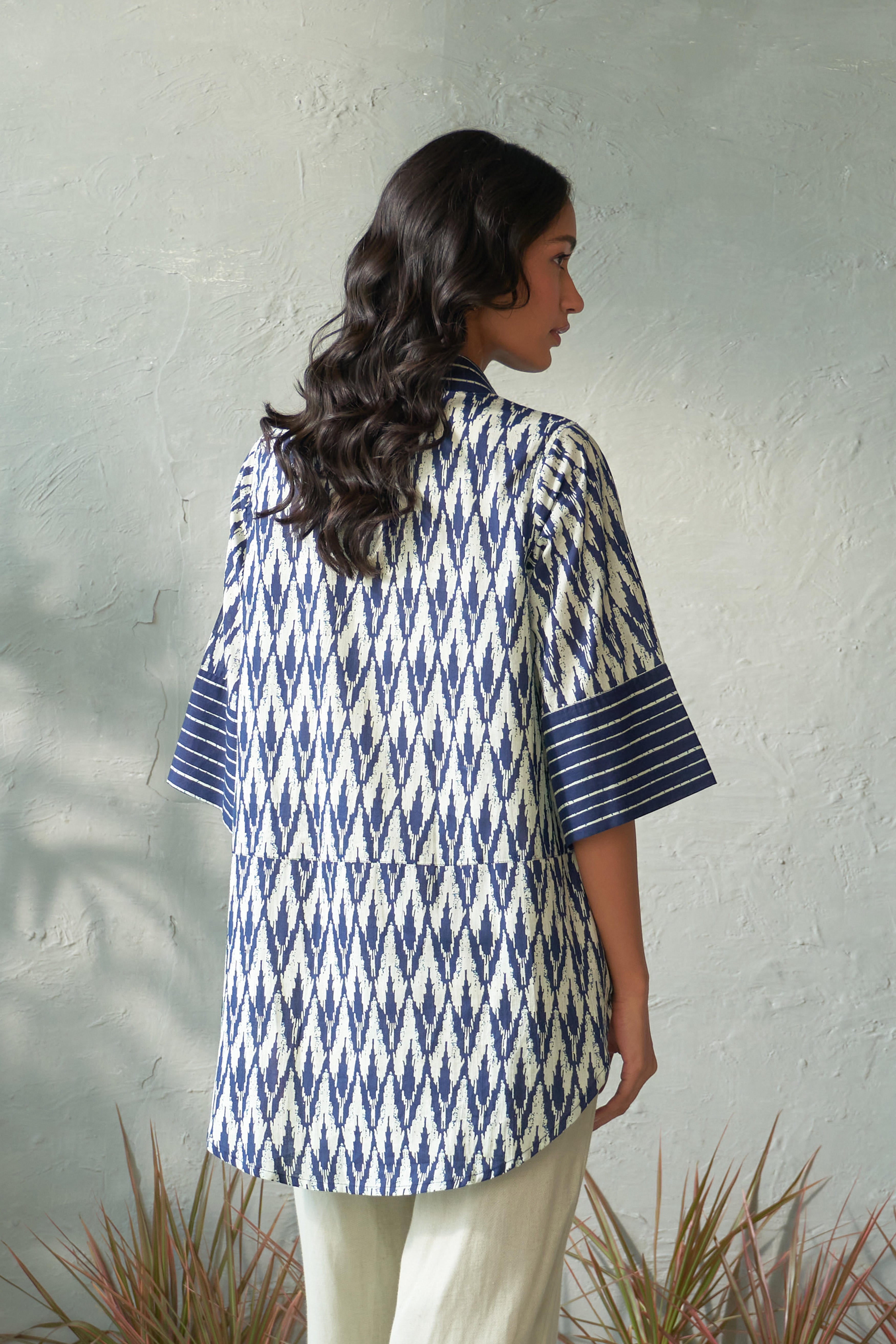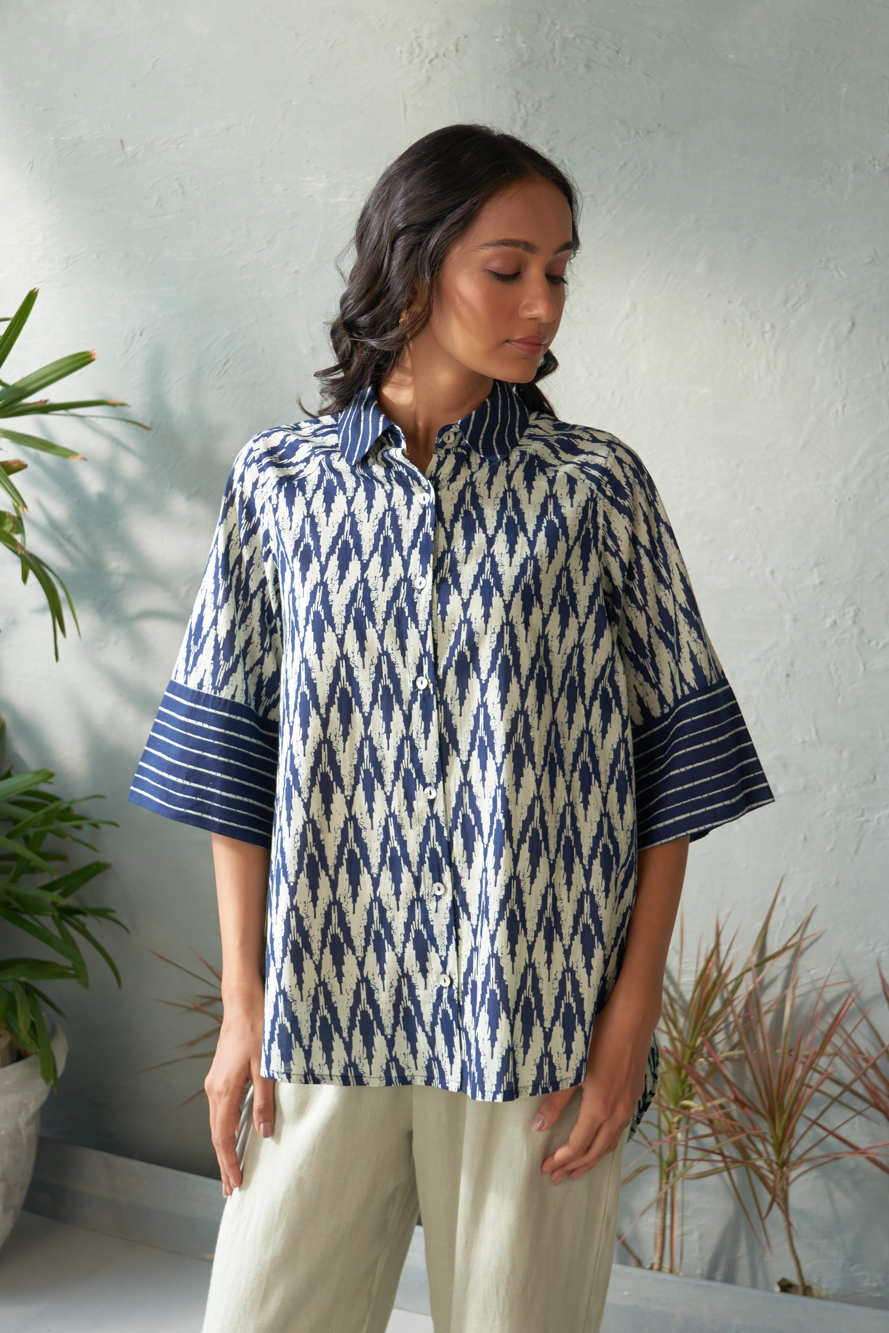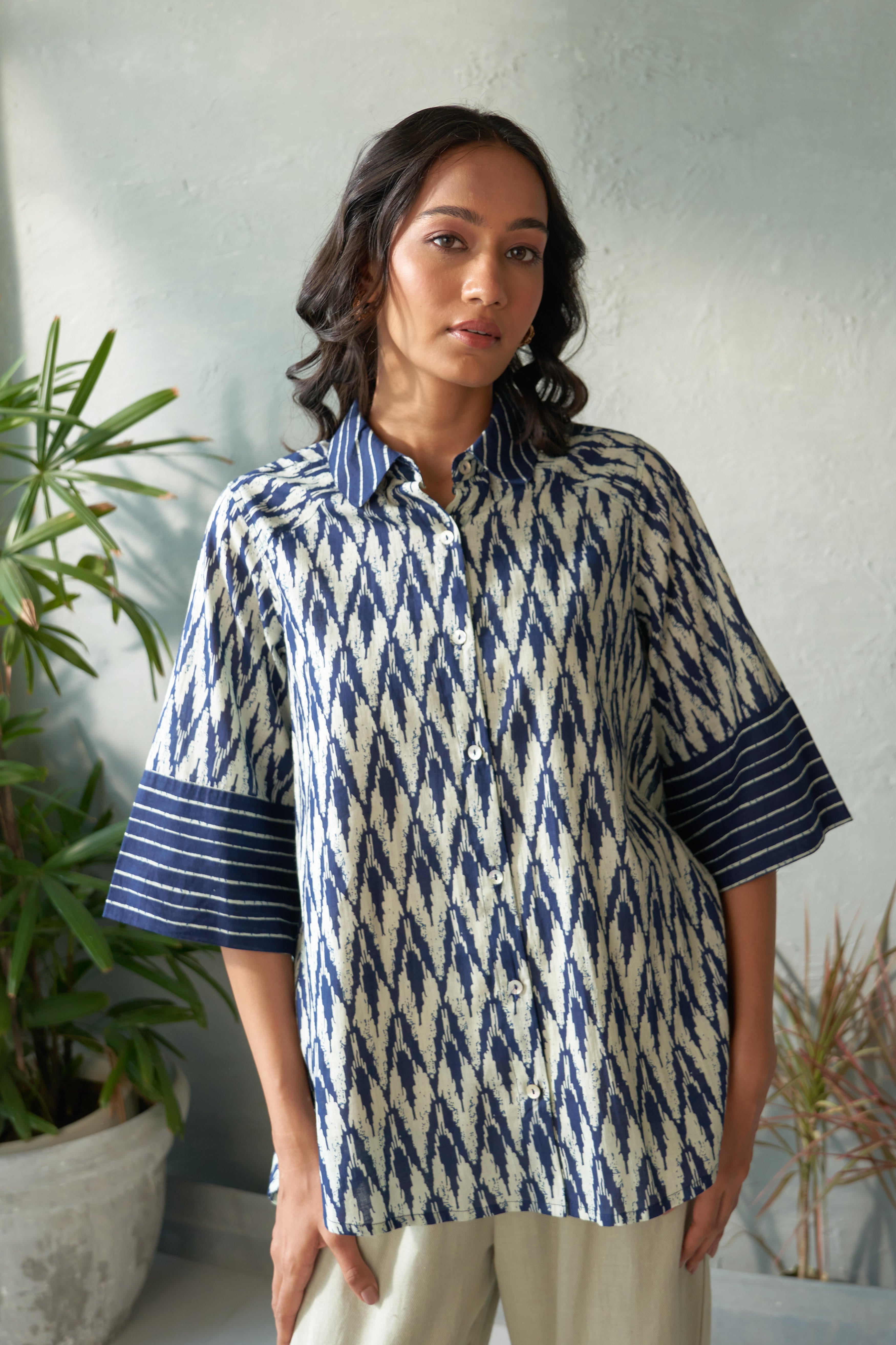 Elevate your everyday style with the Printide Shirt, a long, lightweight cotton design that's both breathable and chic. Featuring a classic indigo chevron print on a crisp white base, this shirt exudes timeless elegance. The creative play of stripes on the sleeves and collar adds a touch of modern sophistication, making it a versatile choice for casual outings or semi-formal occasions. Stylish, comfortable, and effortlessly striking, the Printide Shirt is a wardrobe must-have.