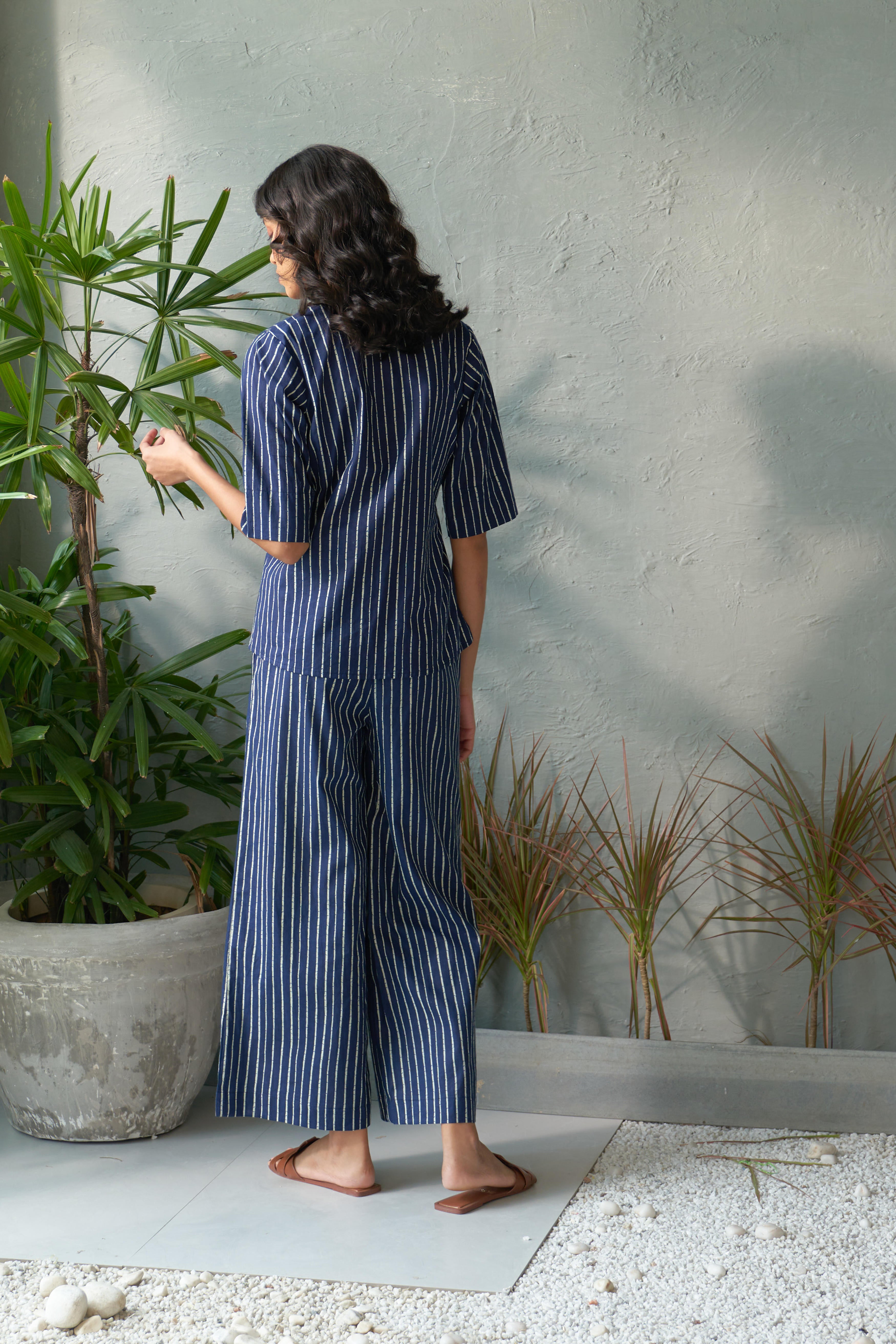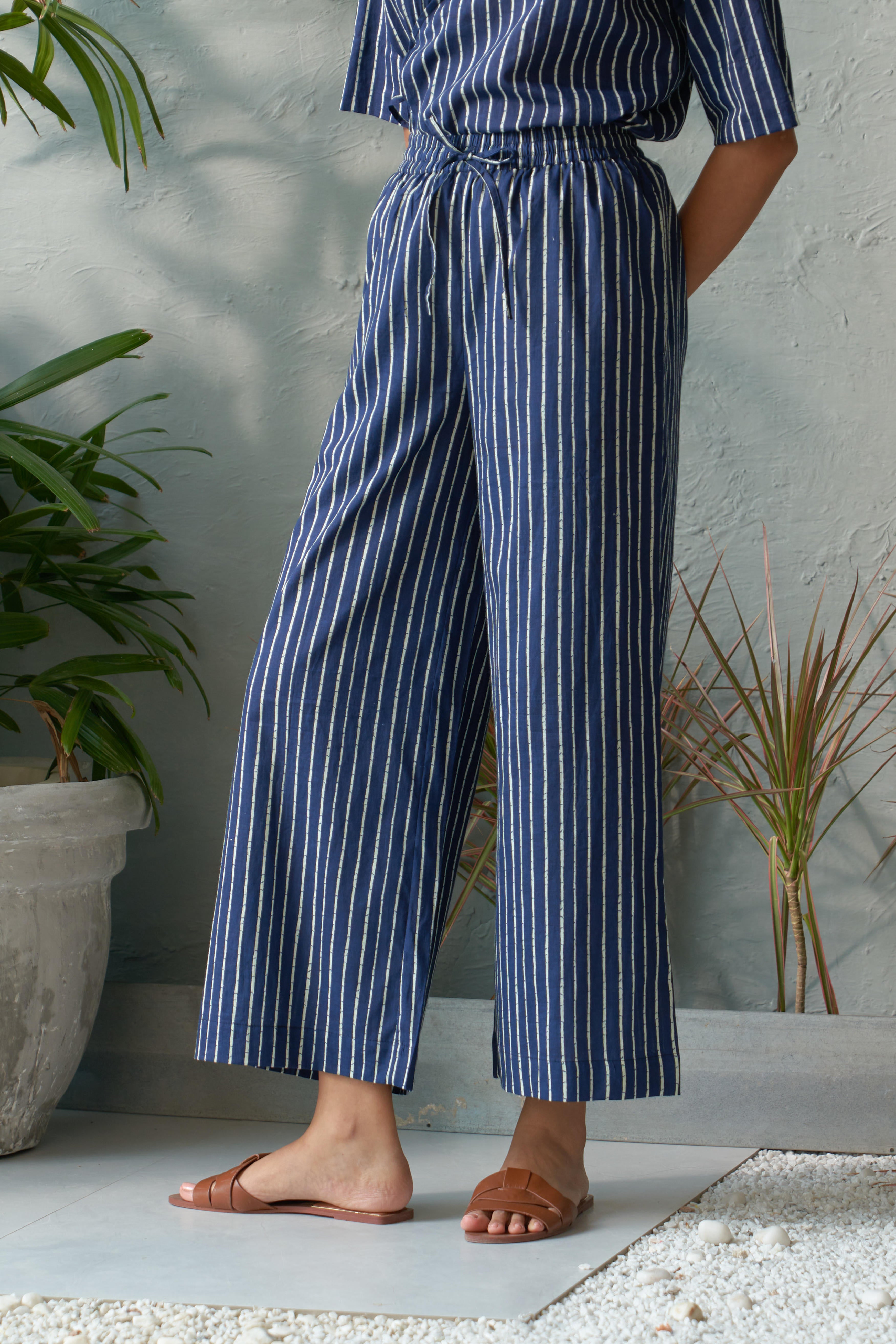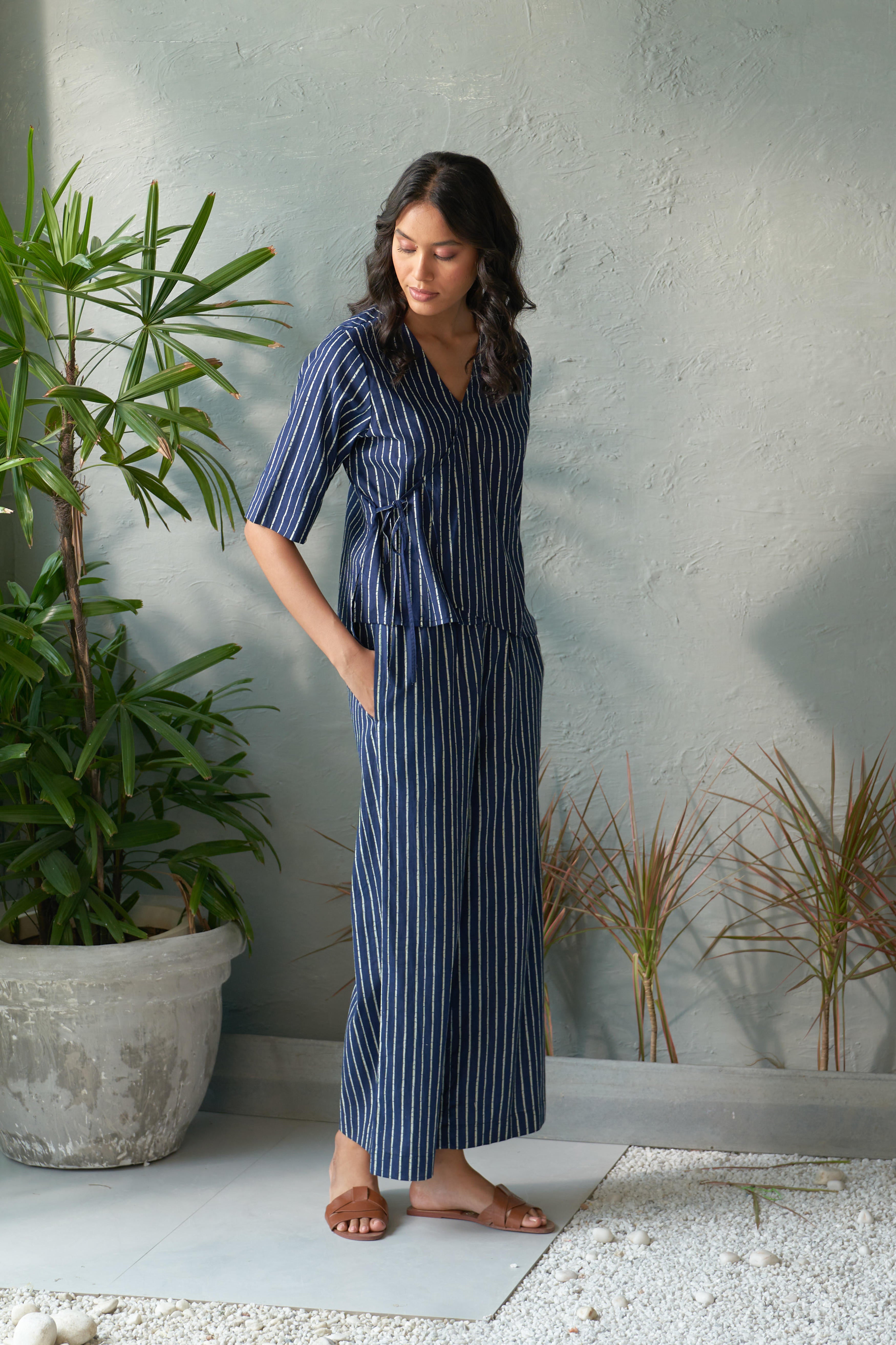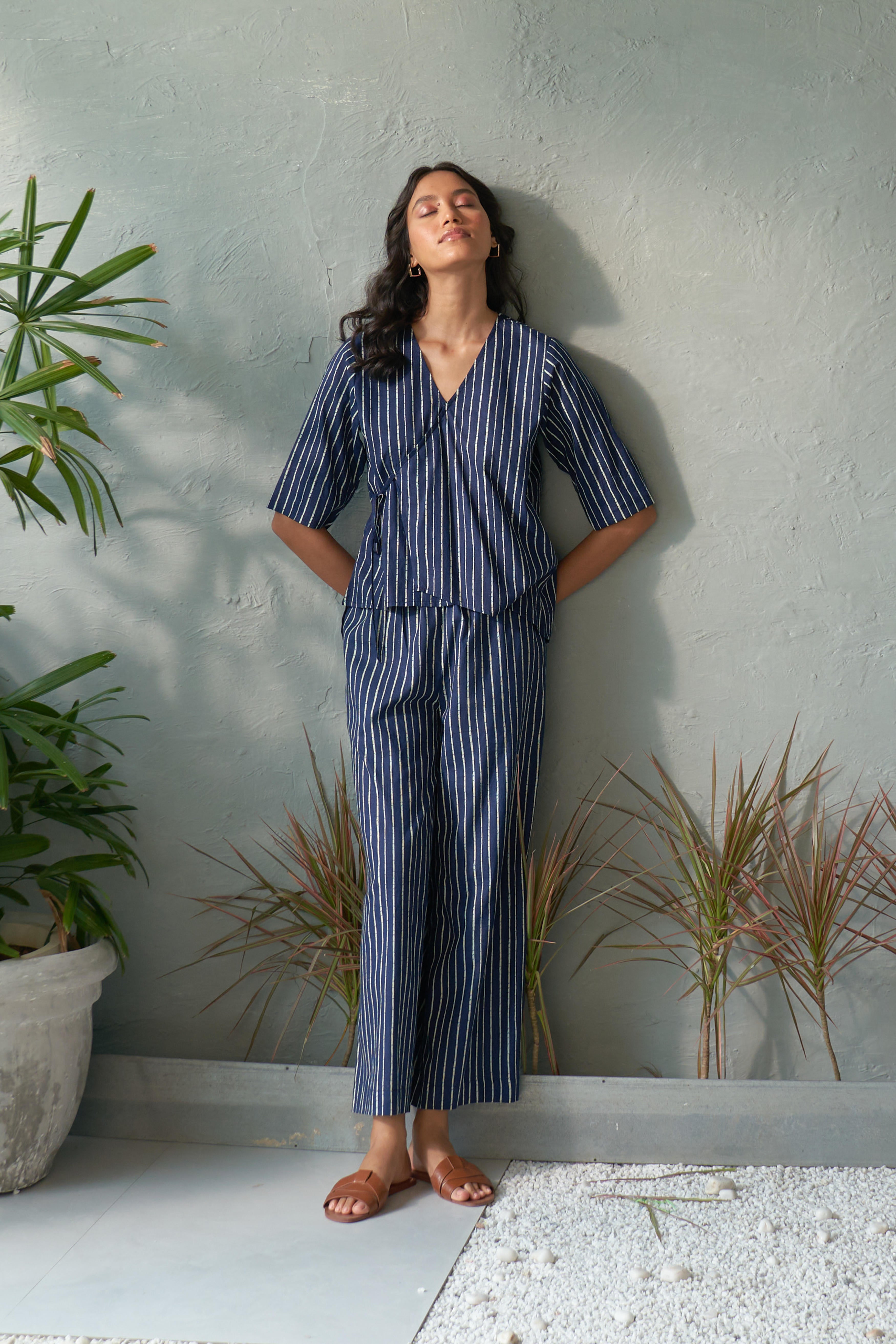 Elevate your style with the Indigo Harmony Wrap Set, crafted from lightweight cotton for all-day comfort. The wrap top features a flattering V-neckline and a side string tie-up, allowing for an adjustable and figure-enhancing fit. Complementing the top are matching pull-on pants in an indigo stripe print, designed with an elasticated waistband and drawstring for a perfect blend of style and ease. This set is a timeless addition to your wardrobe, ideal for both casual and refined occasions.