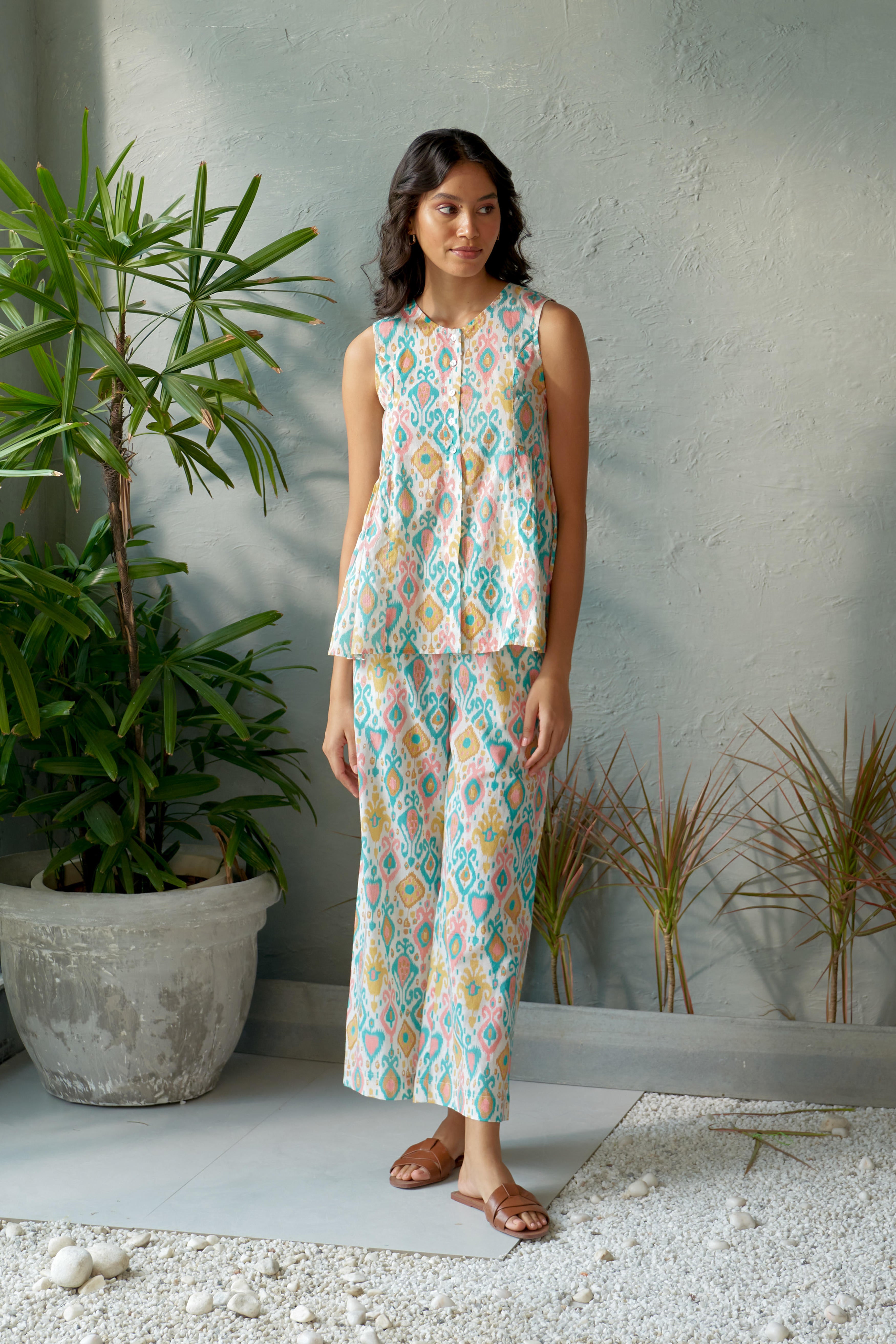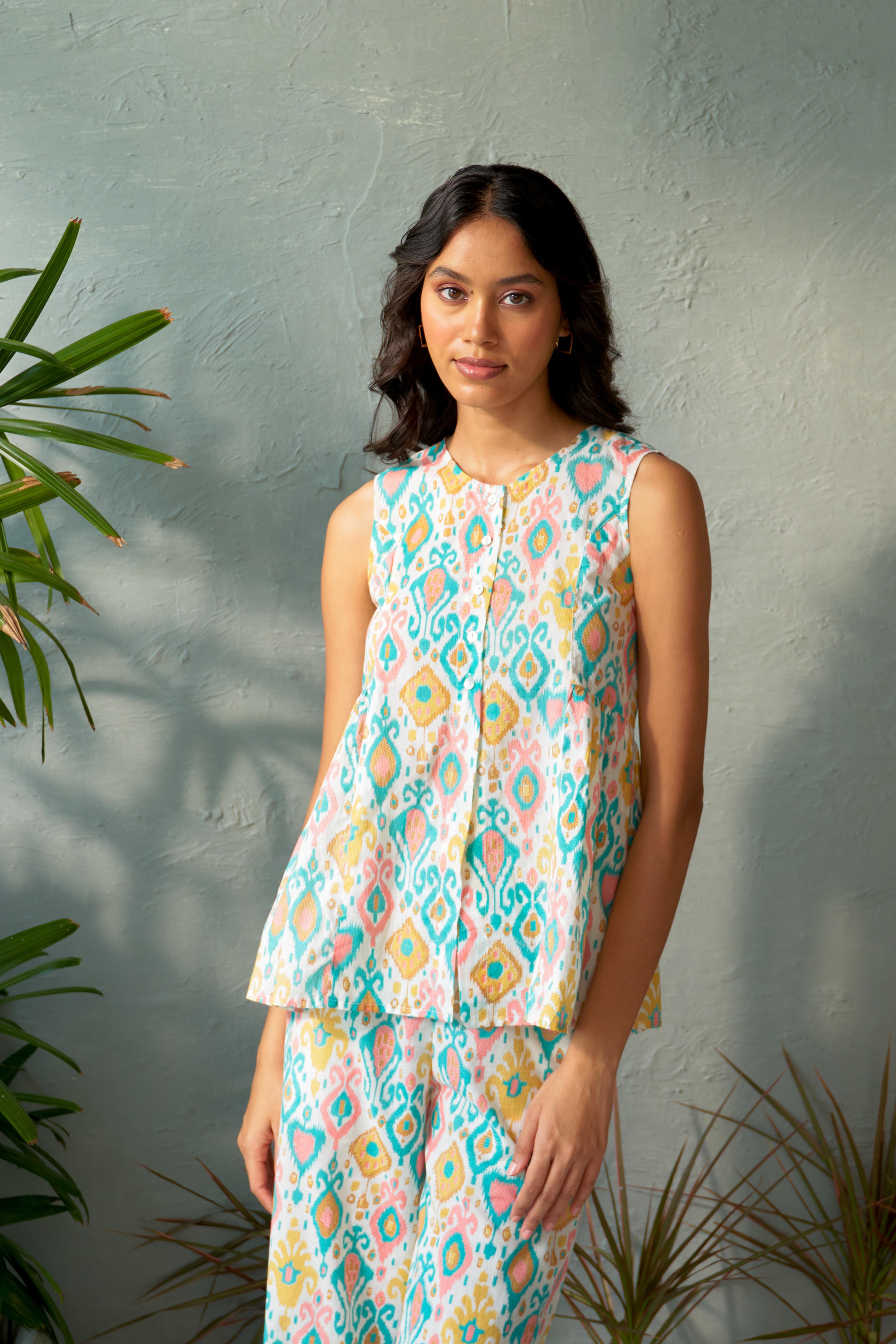 Designed to move with you, the Sway Top blends comfort with a dash of flair. Crafted from lightweight cotton in a vibrant print, this sleeveless top features a gentle round neckline, side gathers for a soft flare, and front buttons that add structure and charm. Its easy silhouette makes it ideal for warm days – wear it tucked in, layered, or left loose for a breezy, carefree look. The Sway Top is where effortless meets everyday chic.