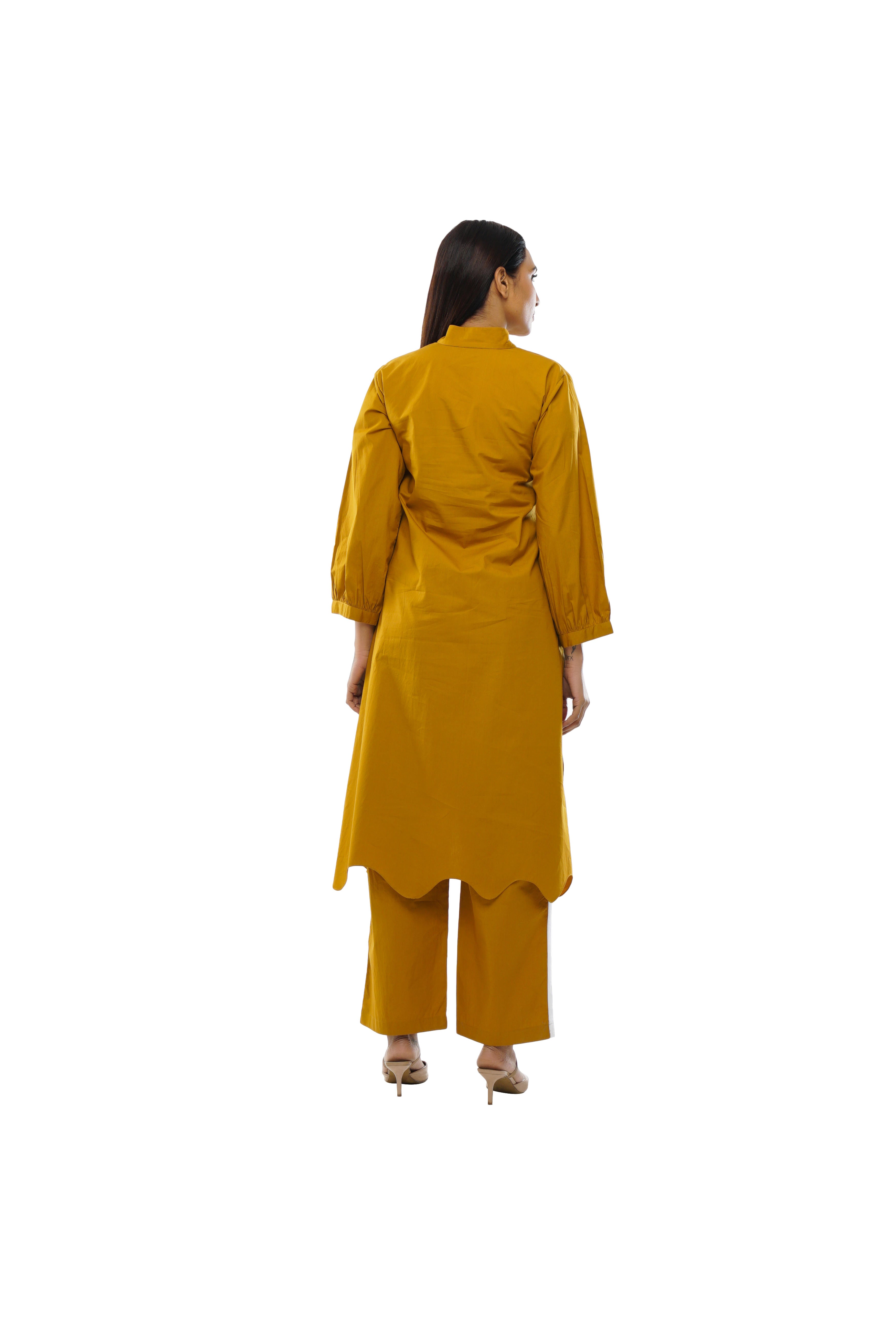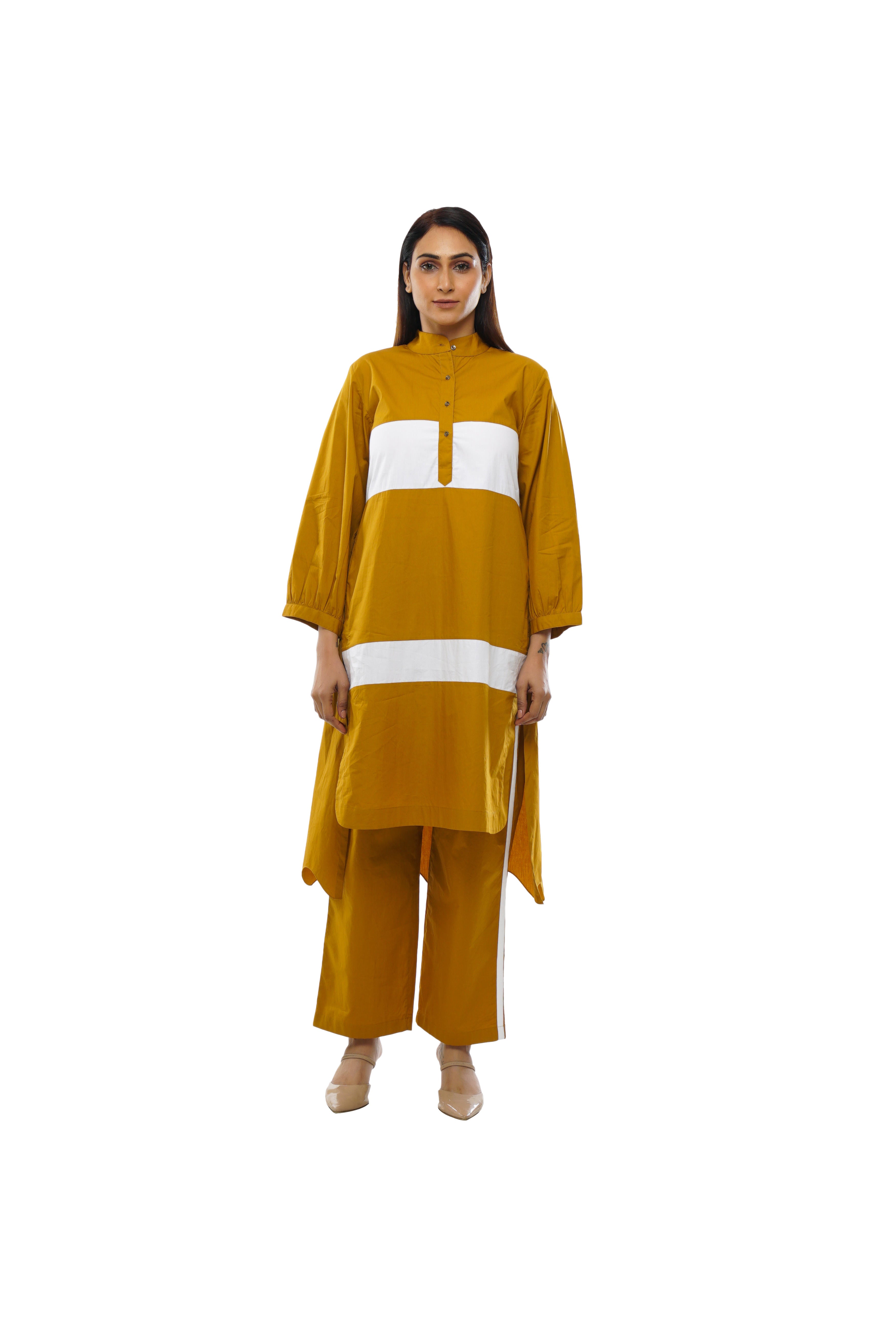 This Mustard Three-Piece Set brings effortless elegance. The striped top with cuff gathers is paired with comfortable pants and a lightweight scarf, all in soft Poplin cotton. Perfect for those who love versatile styling.