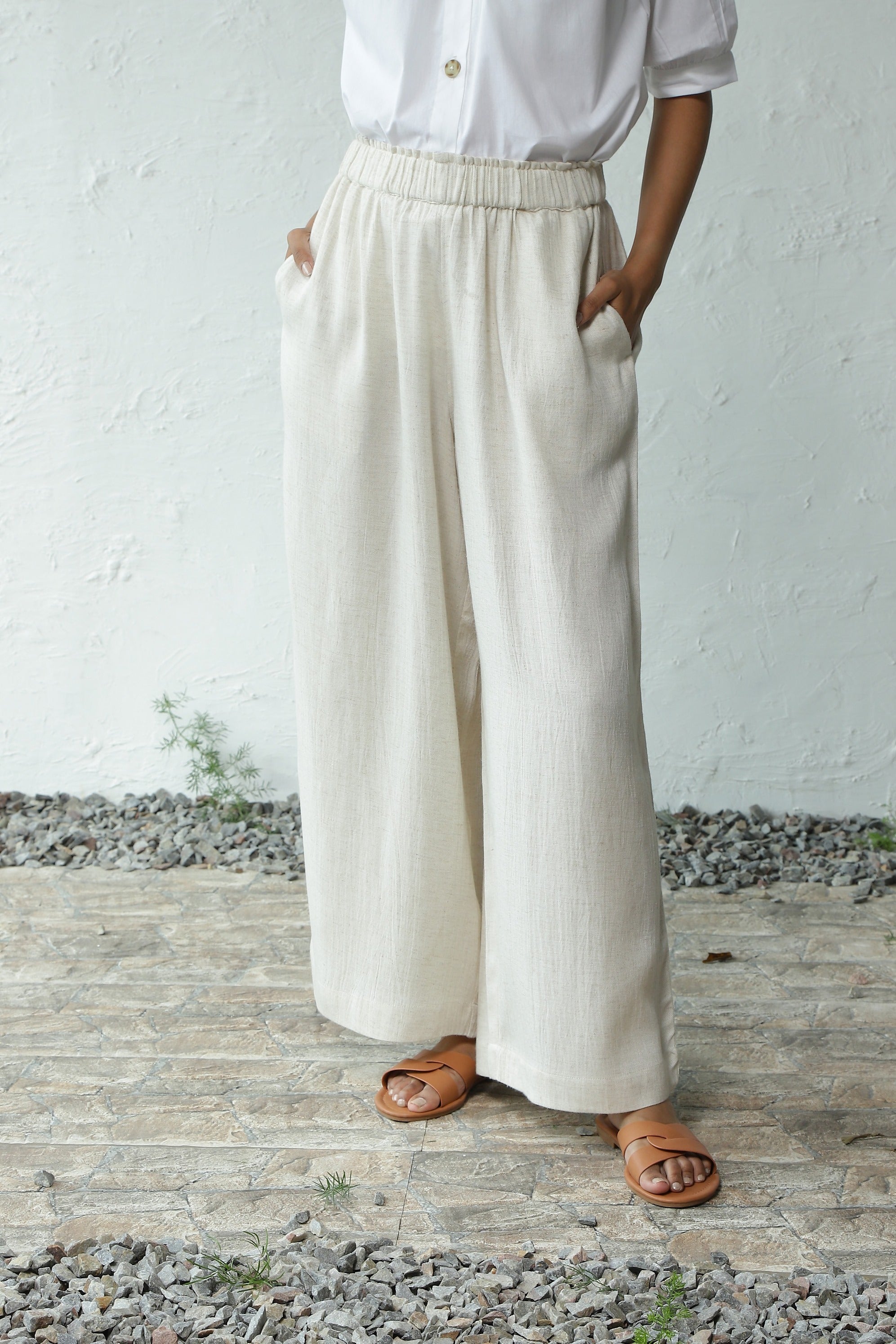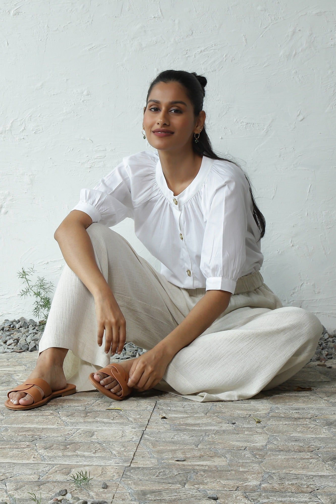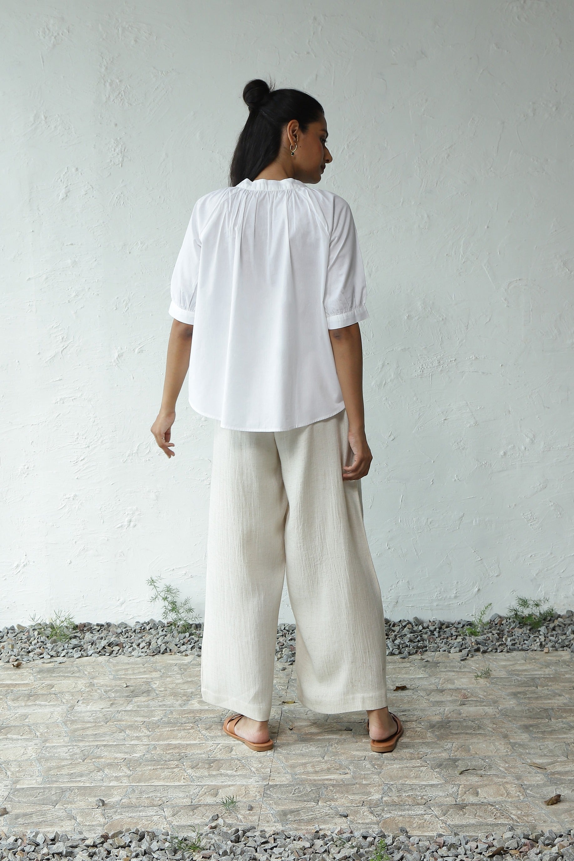Explore the City in Style with our Wander the City Co-ord Set. The top showcases elegant gathers around the neckline and front placket, highlighted by marble-patterned buttons, providing the option to style it as an open shirt. This versatile top effortlessly complements Canoopi's favorite Flex Rayon Breathable Flared Pants. The crushed-look pants, featuring an elasticated waistband, drawstring, and side pockets, ensure ease and comfort as you roam the streets, discovering more and more.