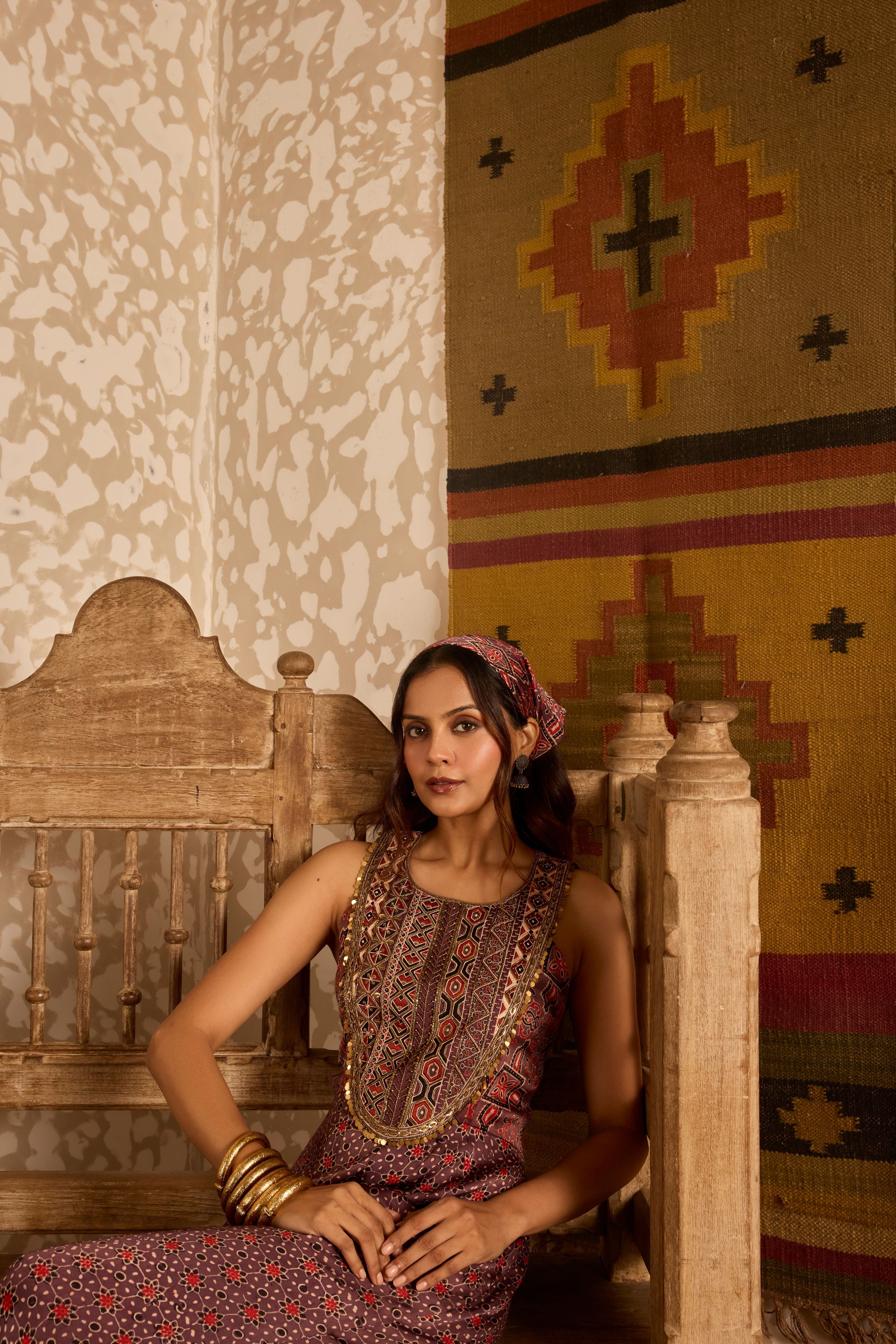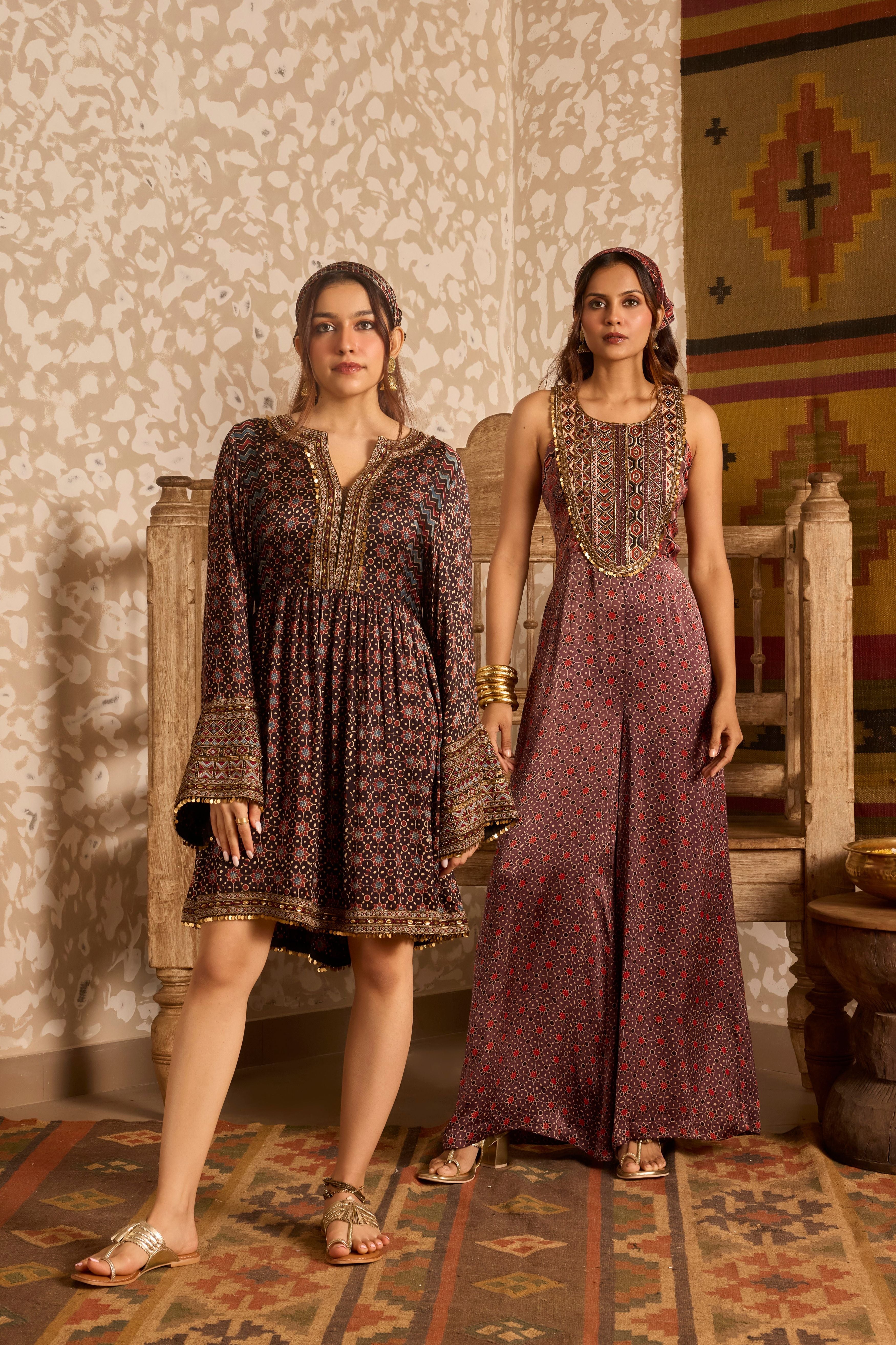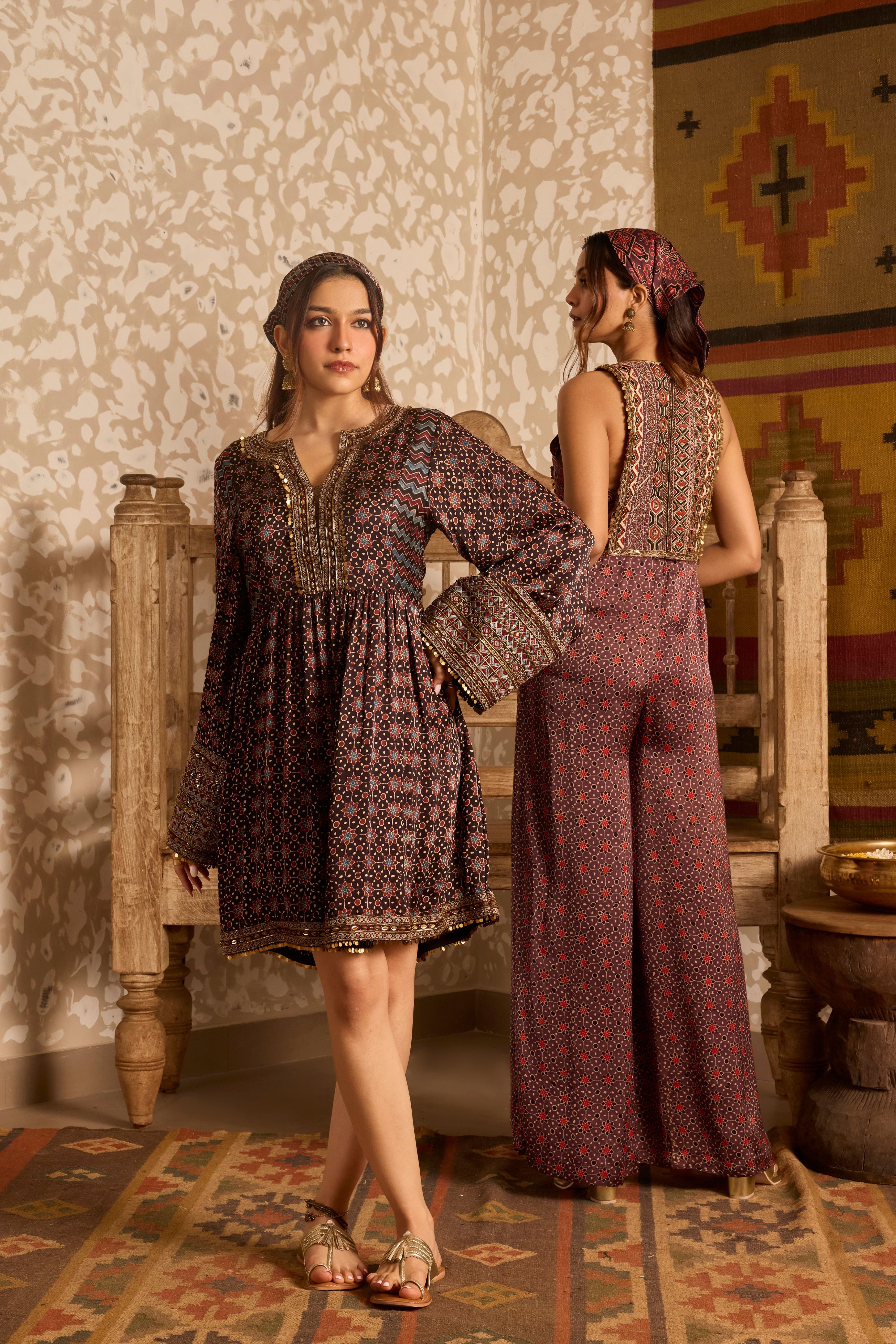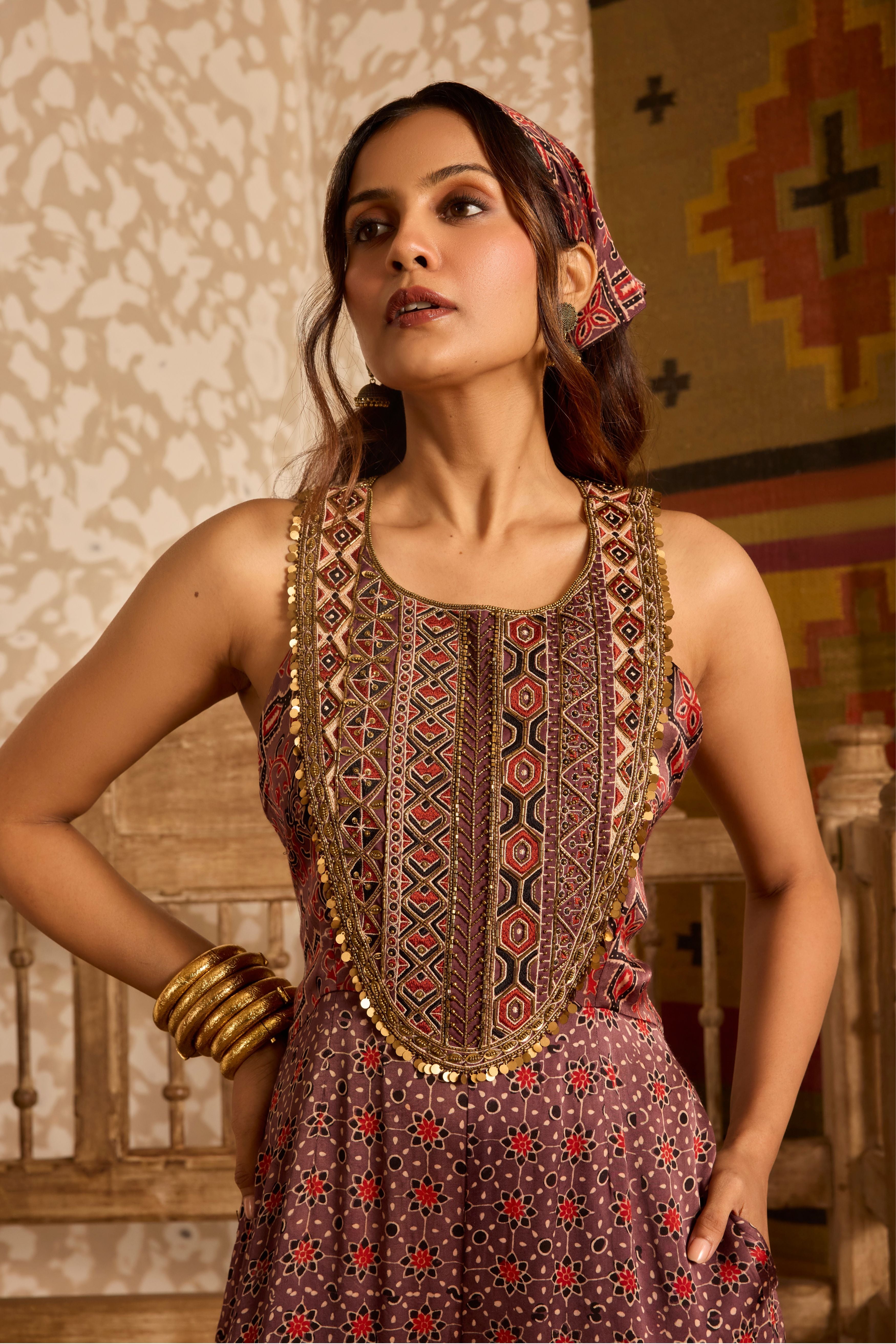 A modern twist on heritage craft, this brown Ajrakh jumpsuit is crafted in luxurious modal satin with dual hand-block prints. The yoke and back feature fine machine thread embroidery and intricate gold cut dana handwork, adding a touch of festive elegance. With its flared silhouette and easy back zip closure, it blends tradition with contemporary style. Handcrafted by Gujarat’s artisans, Ajrakh printing follows a sixteen-step process of washing, dyeing, printing, and drying using eco-friendly dyes and intricate motifs — making each piece truly unique. An ideal choice for festive occasions, weddings, trousseau, and special celebrations.