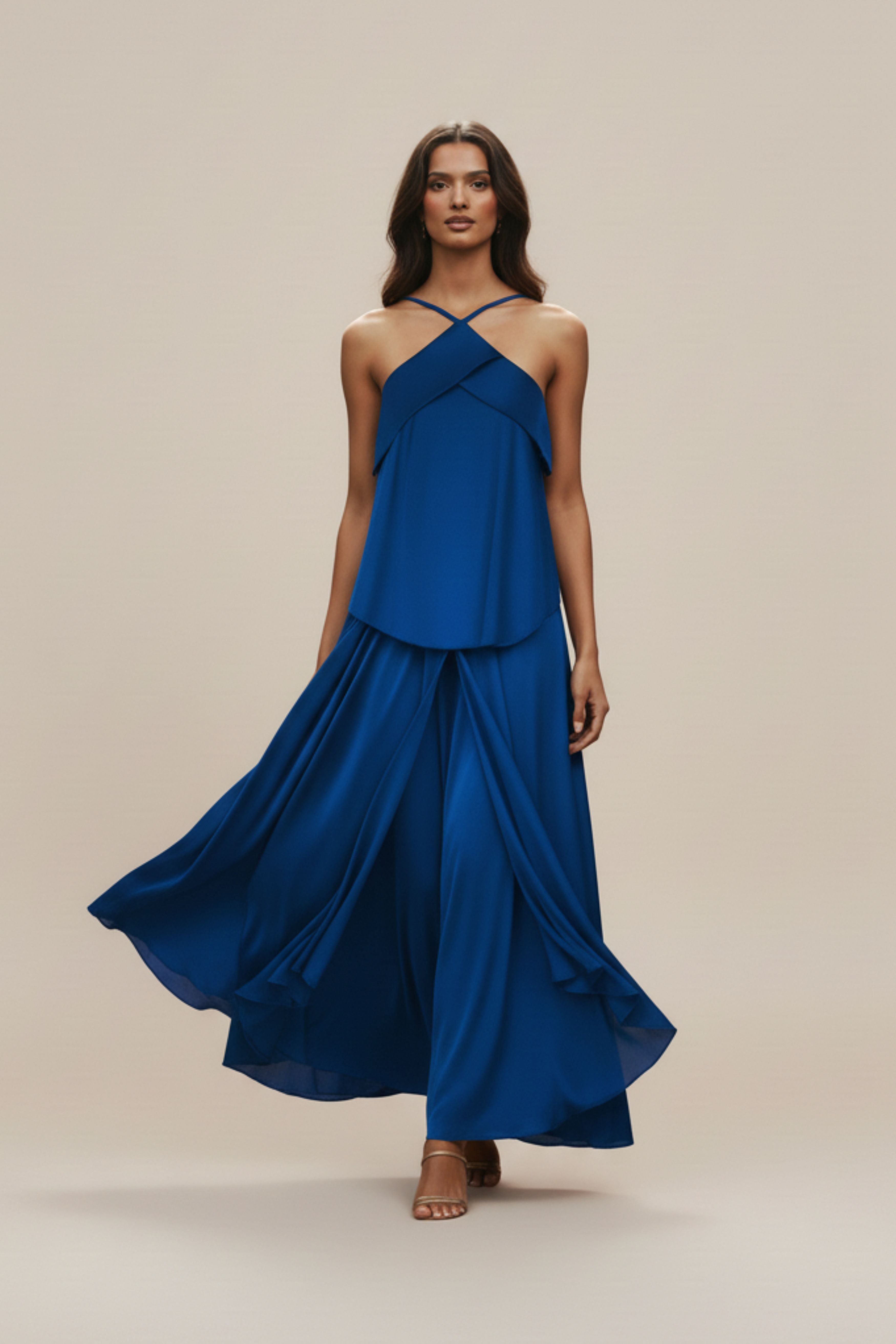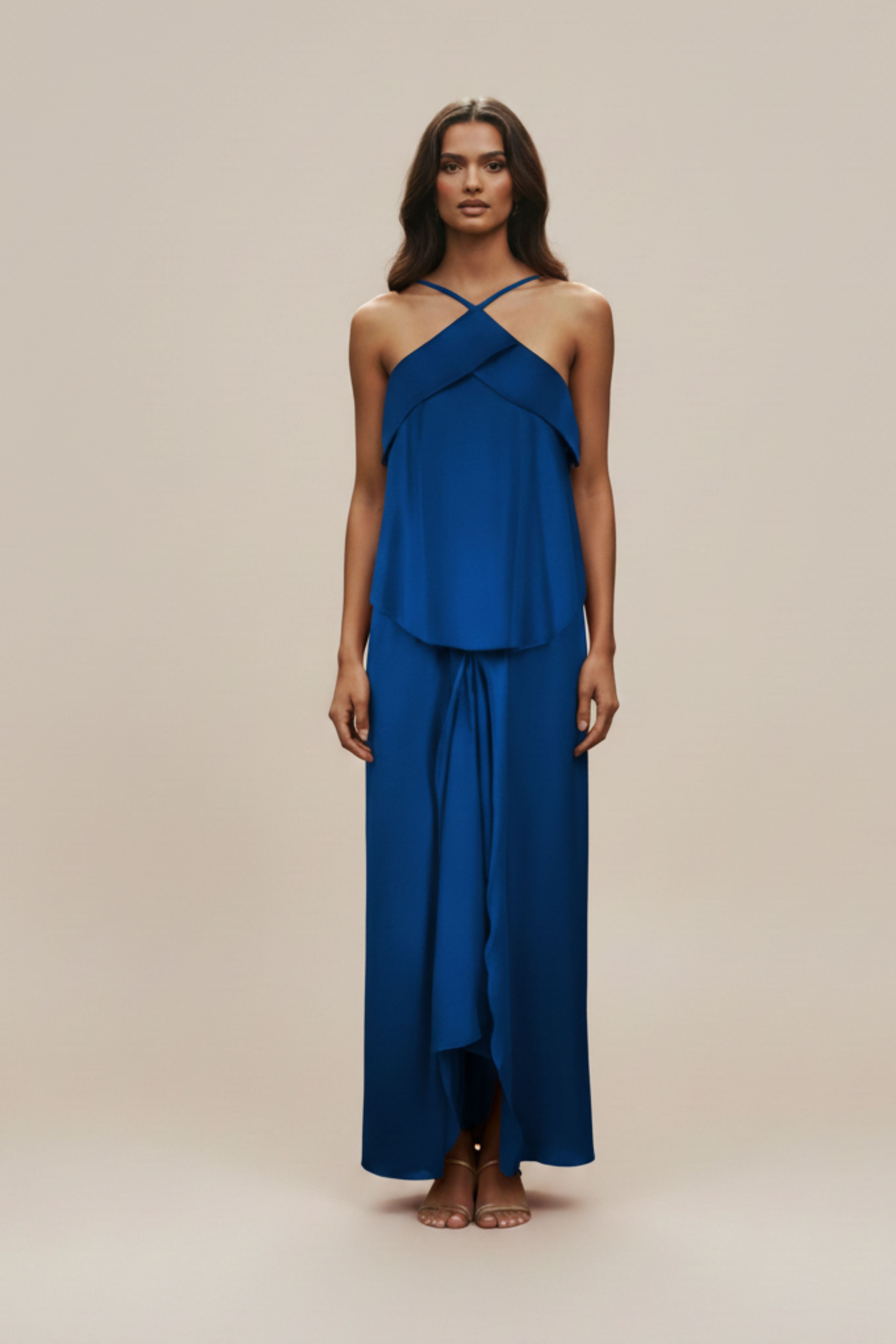 Revire is a dress designed to move with you. Its free-size silhouette is cut from fluid silk that drapes with ease, creating a refined look that feels as comfortable as it is stylish. The standout feature lies in its cross-front halter neckline, adding a contemporary edge to a timeless flow. A layered bodice softens the structure, while the skirt falls into elegant cascading panels, finished with a tie detail for subtle definition. Available in Royal Blue, Revire is the perfect balance of sophistication and ease — ideal for evenings, resort escapes, or any moment that calls for understated allure.