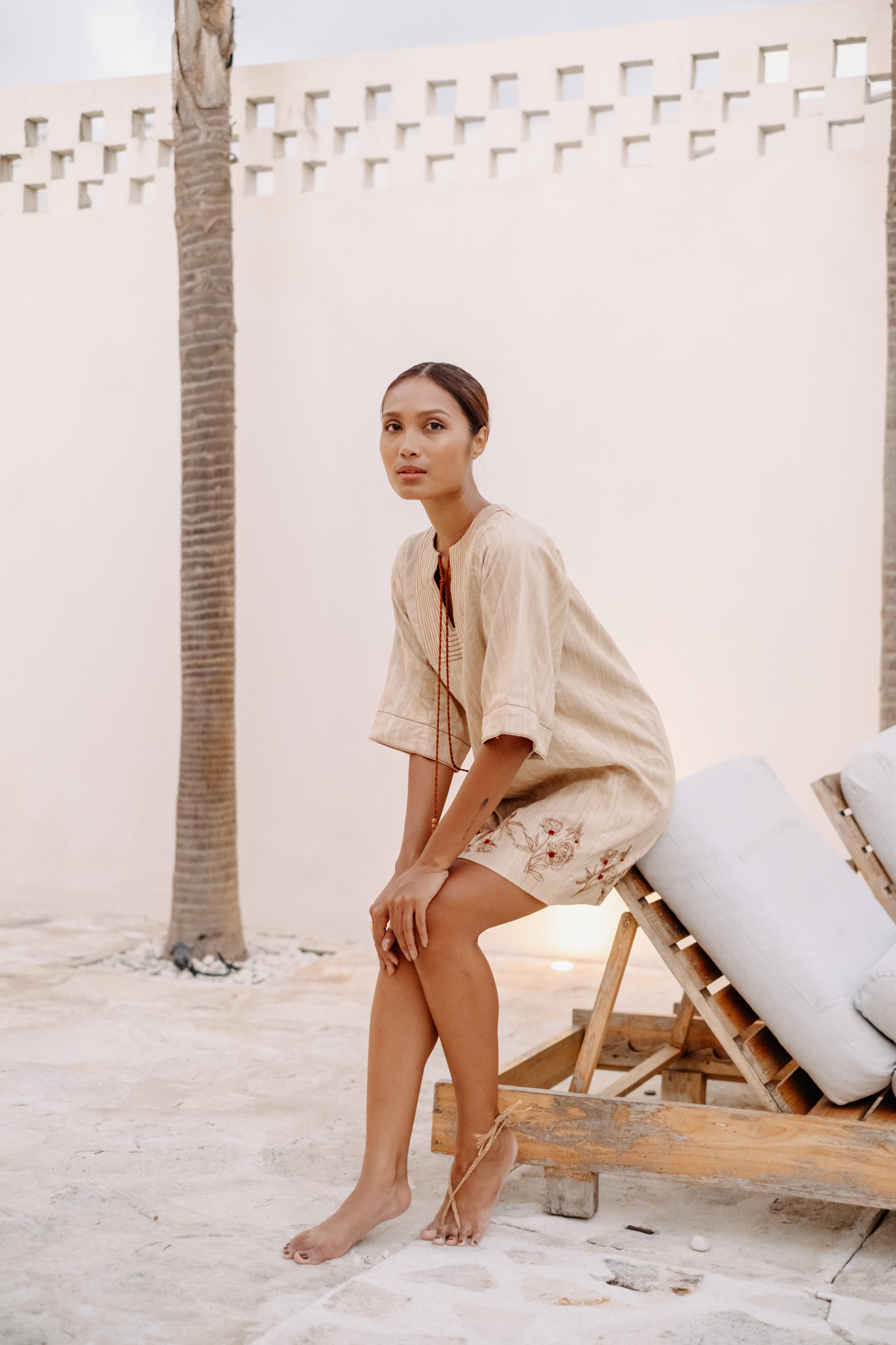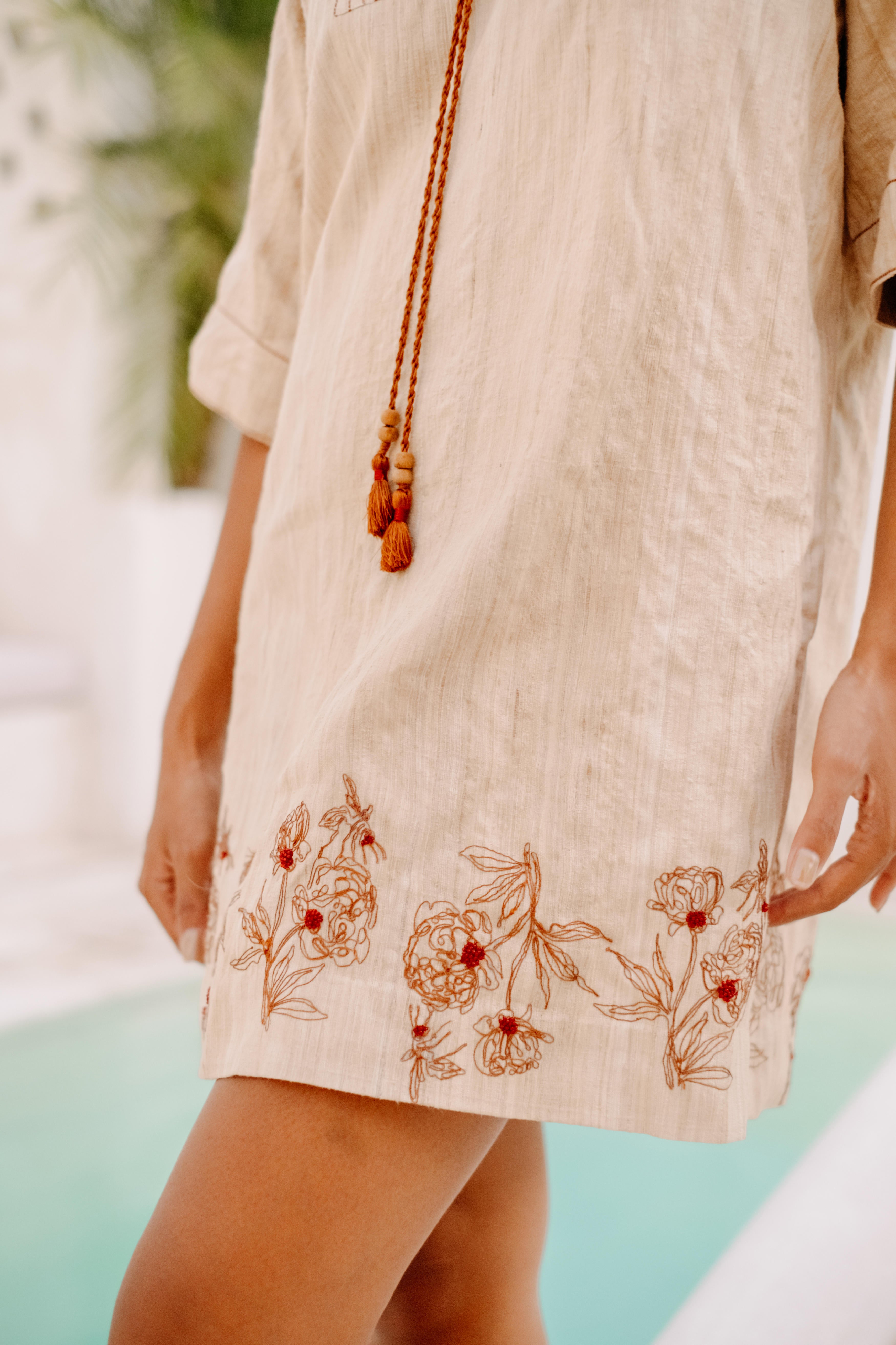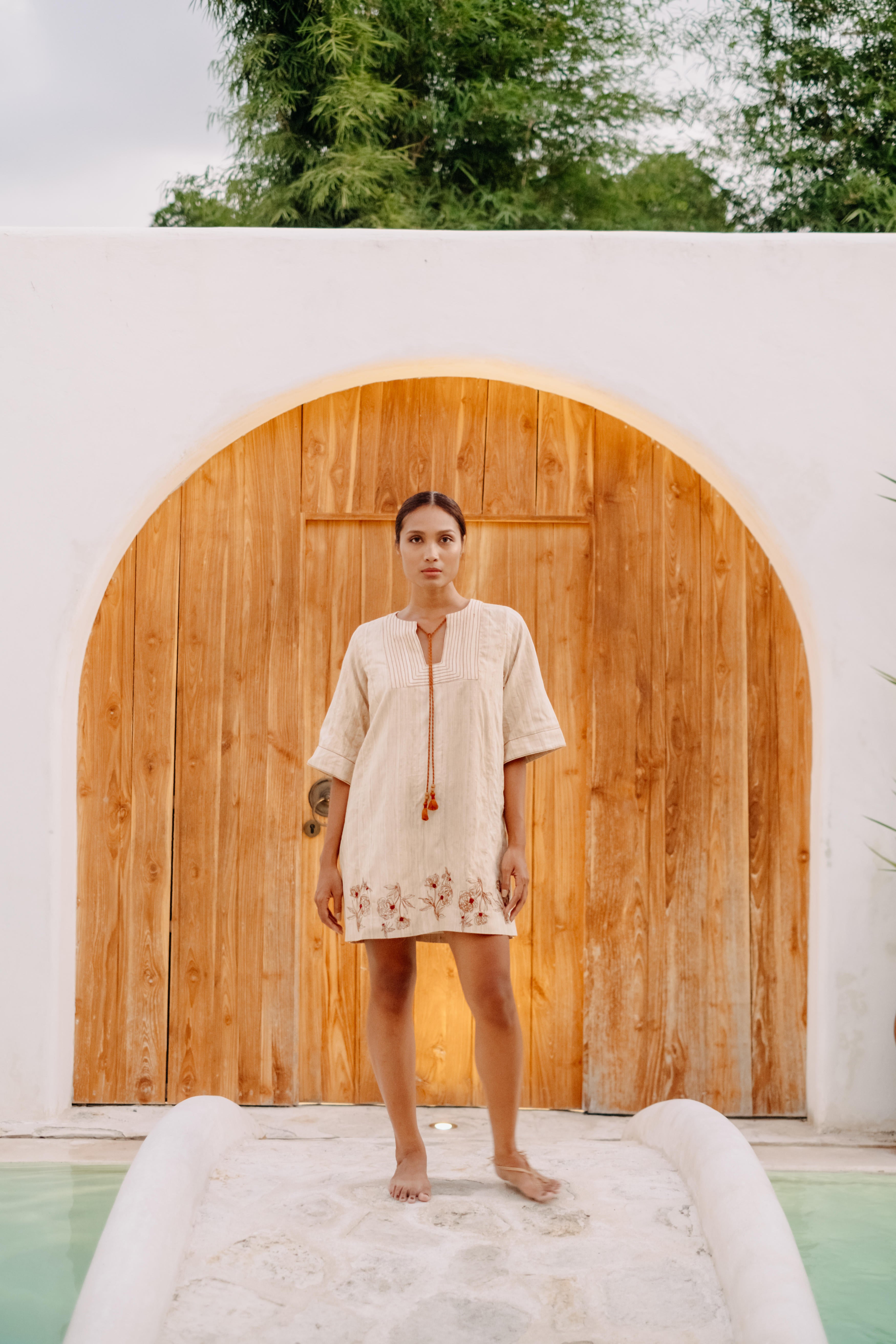 A relaxed fit short dress with embroidery detail at the bottom featuring round v neckline with draw-strings and short relaxed fit sleeves. The dress is highlighted with stitching detail. This product will be exclusively handcrafted for you, making the pattern/texture/color slightly vary from the image shown, due to multiple artisan led techniques and processes involved. Color may also slightly vary due to photographic lighting sources. Length - 33"