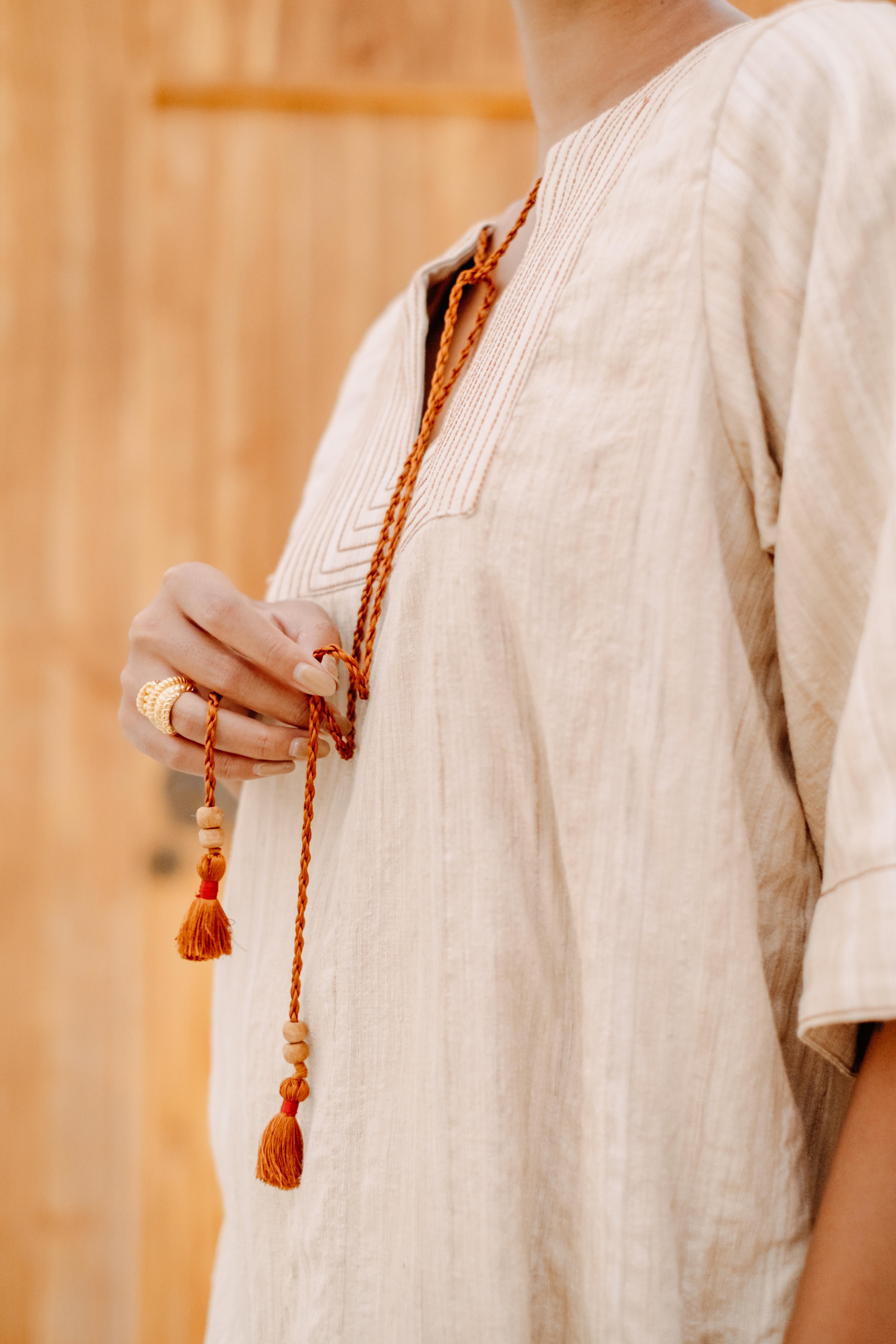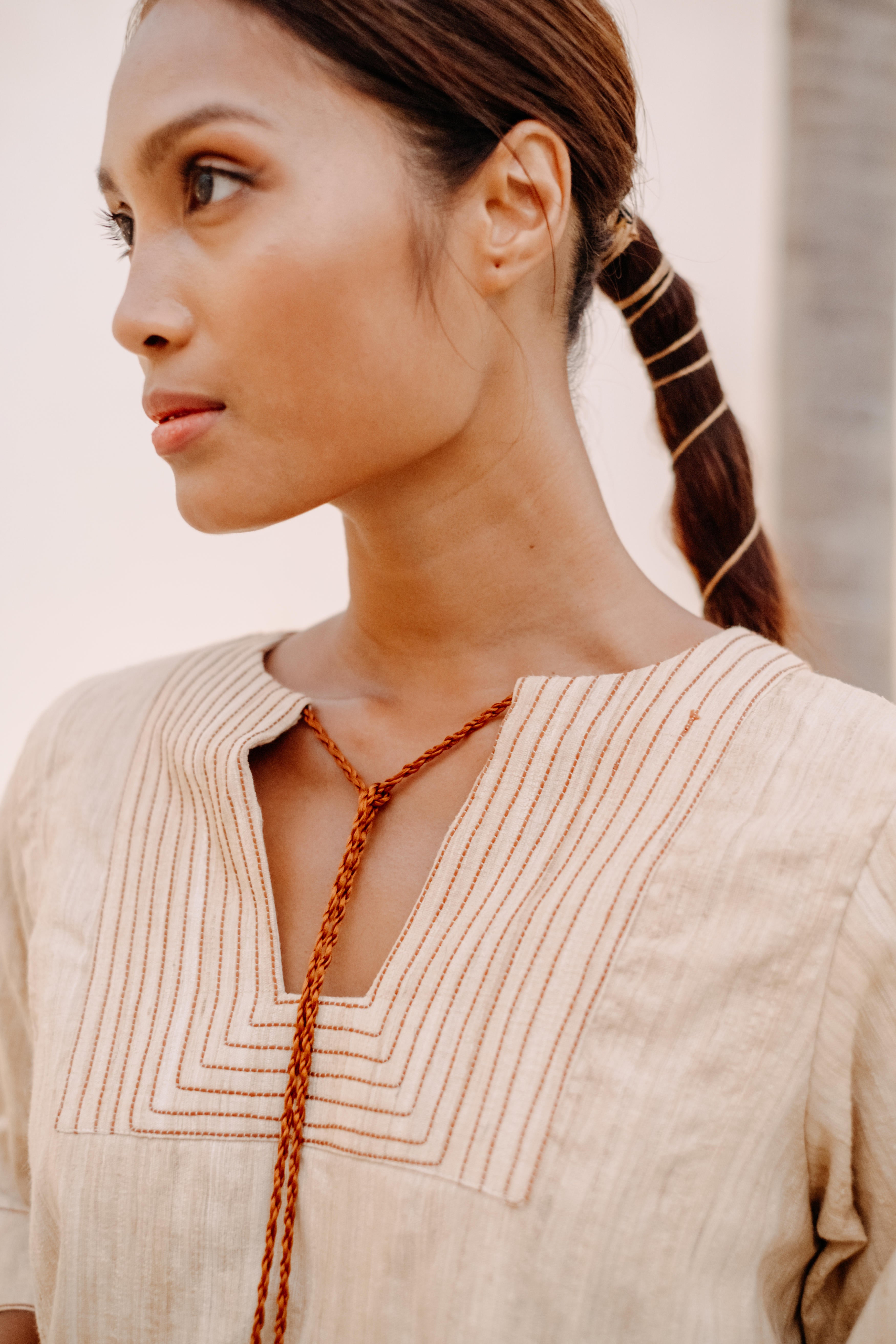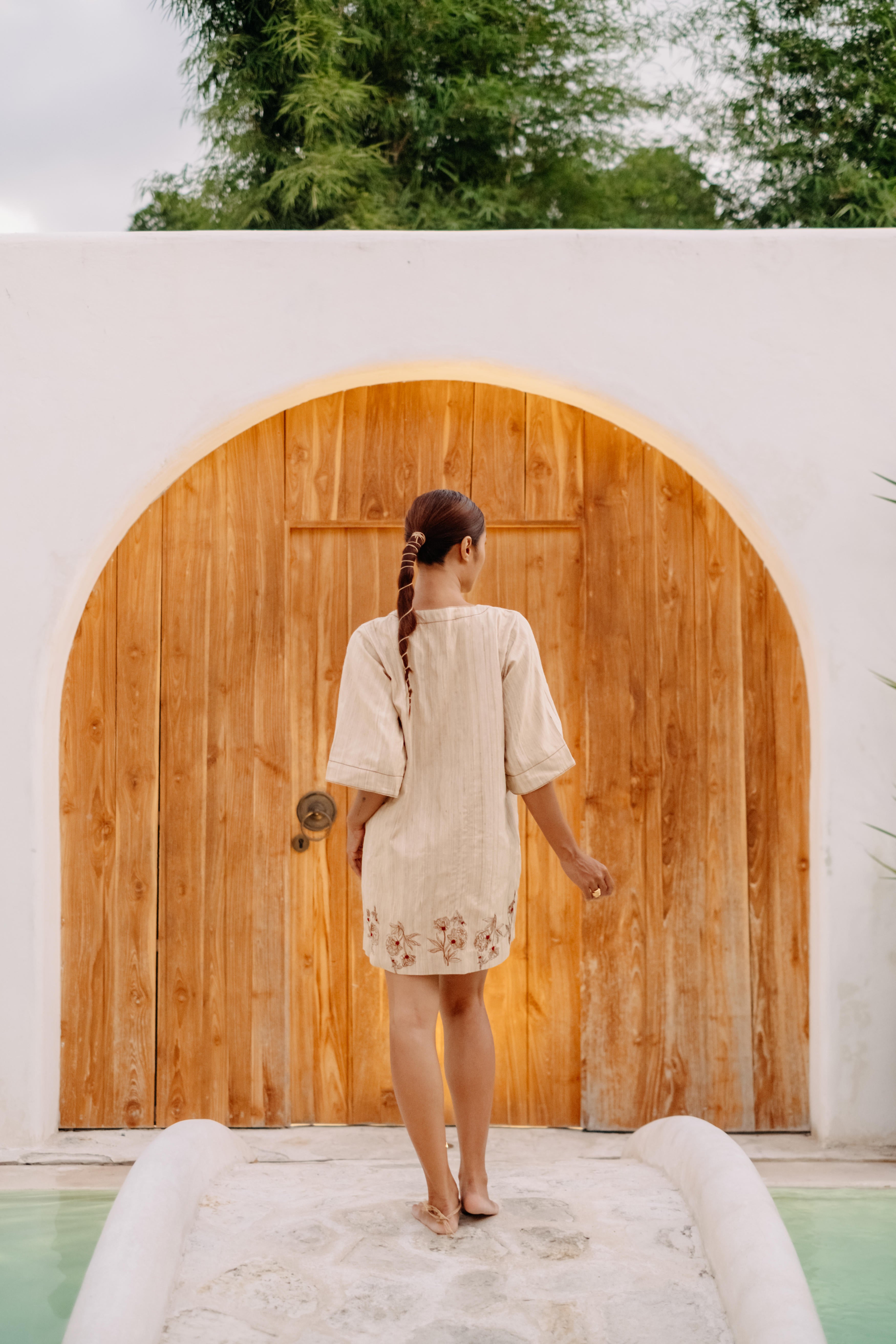A relaxed fit short dress with embroidery detail at the bottom featuring round v neckline with draw-strings and short relaxed fit sleeves. The dress is highlighted with stitching detail. This product will be exclusively handcrafted for you, making the pattern/texture/color slightly vary from the image shown, due to multiple artisan led techniques and processes involved. Color may also slightly vary due to photographic lighting sources. Length - 33"