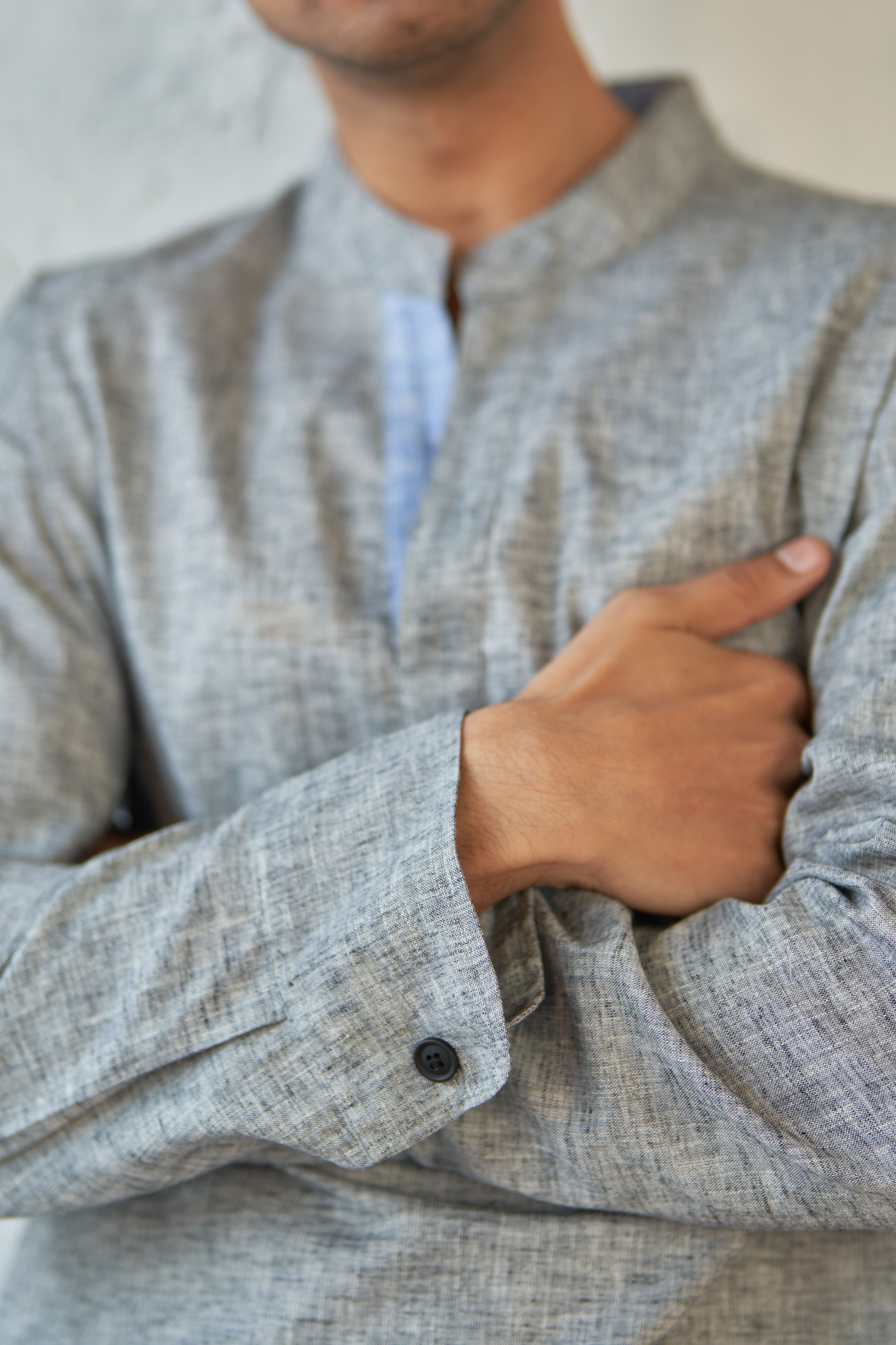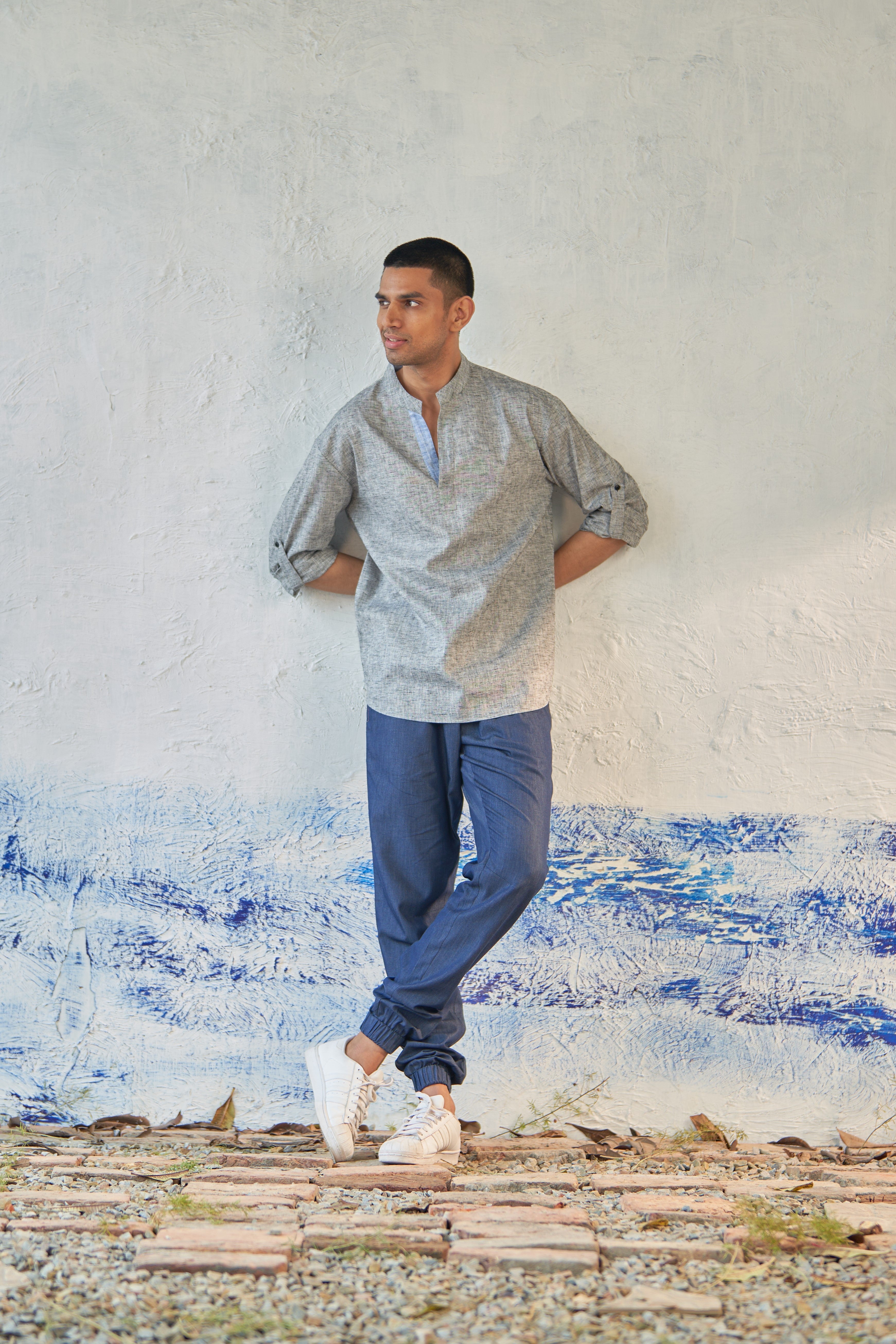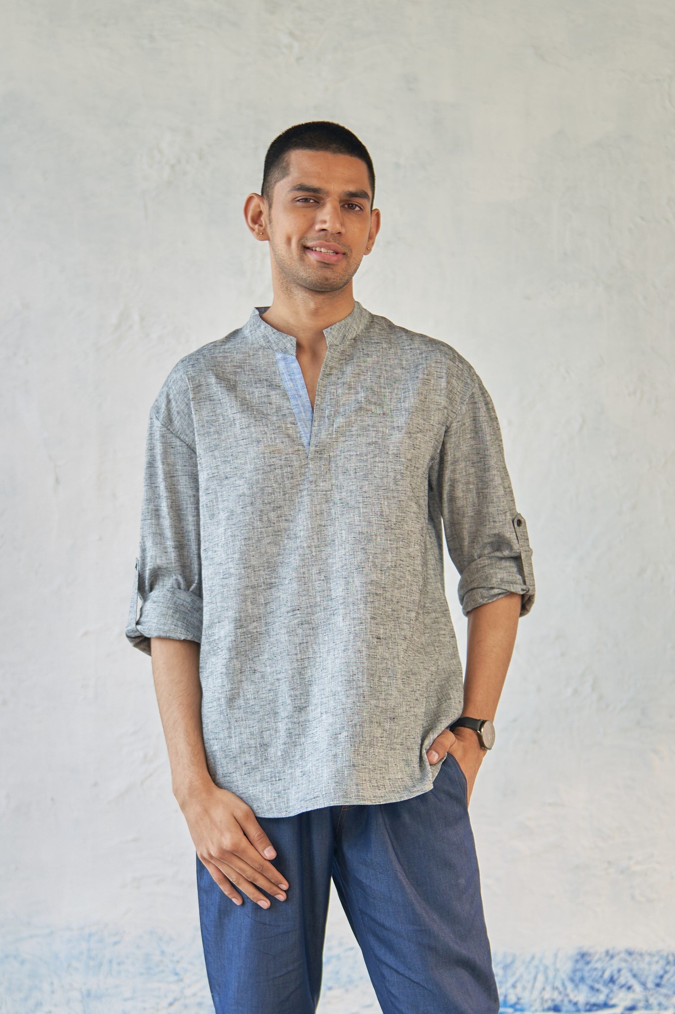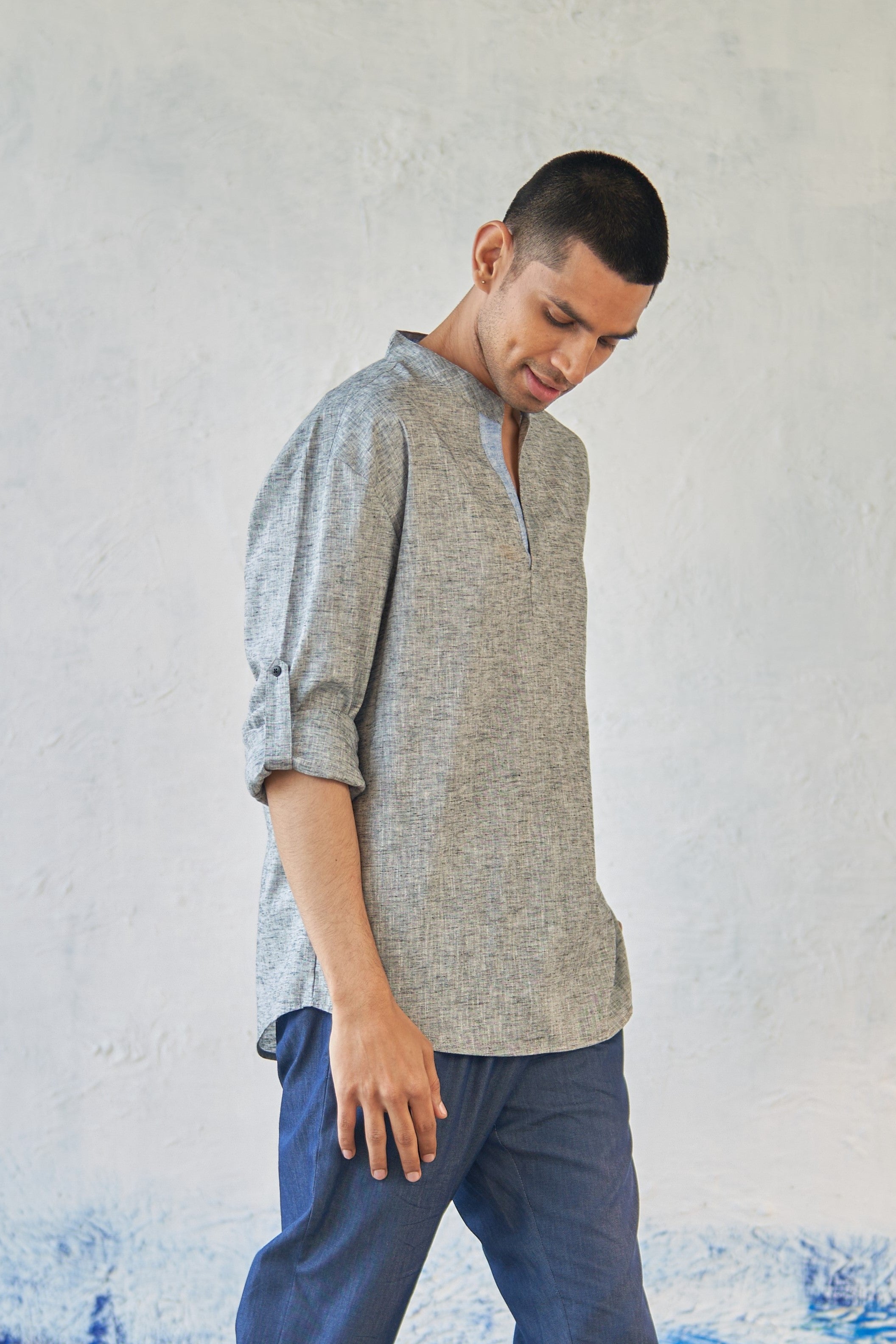 This piece offers a refined take on the classic polo shirt, artfully crafted in textured cotton. Tailored in a relaxed shape with an overlapping placket that creates a stylish v-neck opening. The broad back yoke reflects a shirt fit while enhancing the comfort reminiscent of a kurta. Stride the streets all day long or sit through the workday in effortless style.