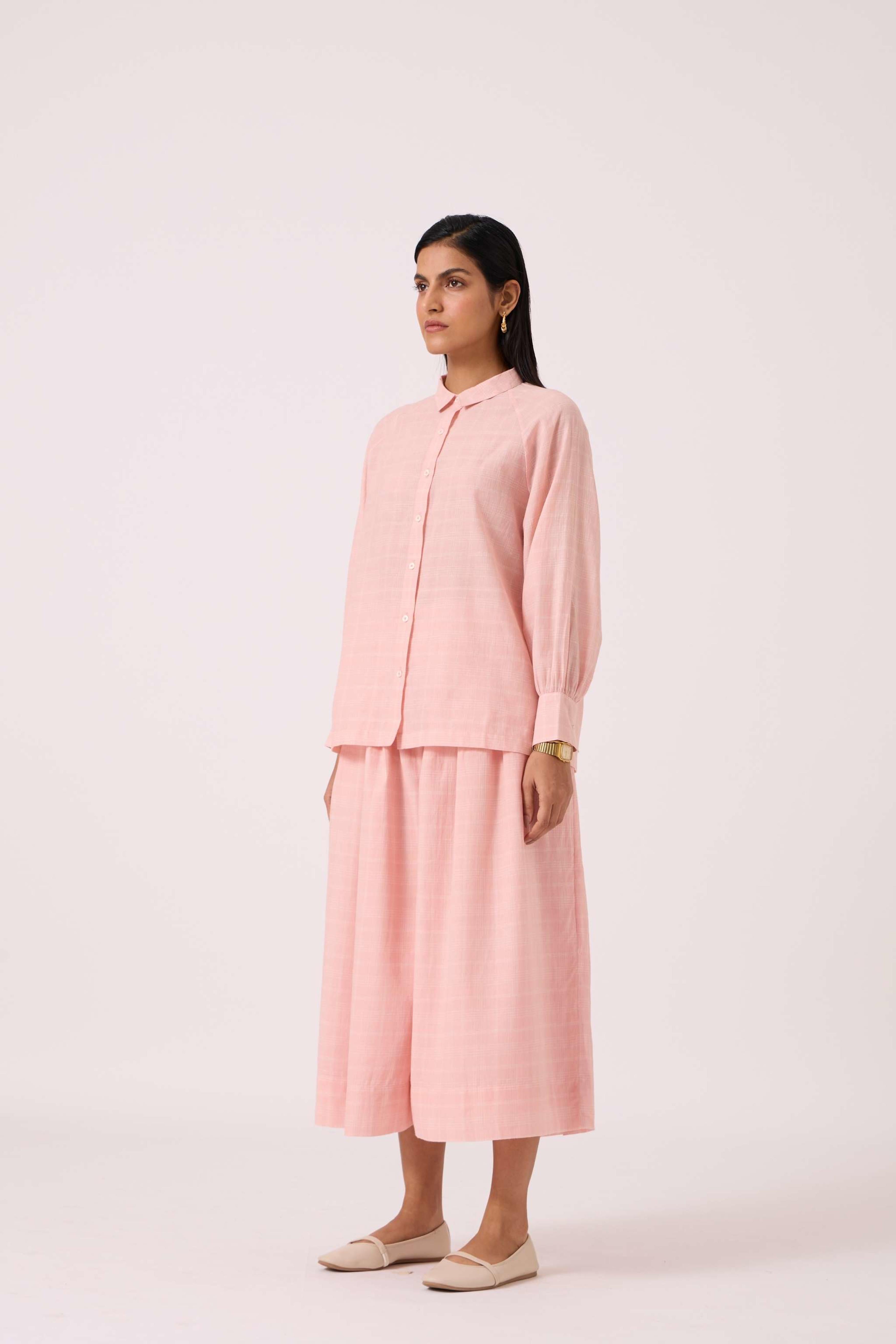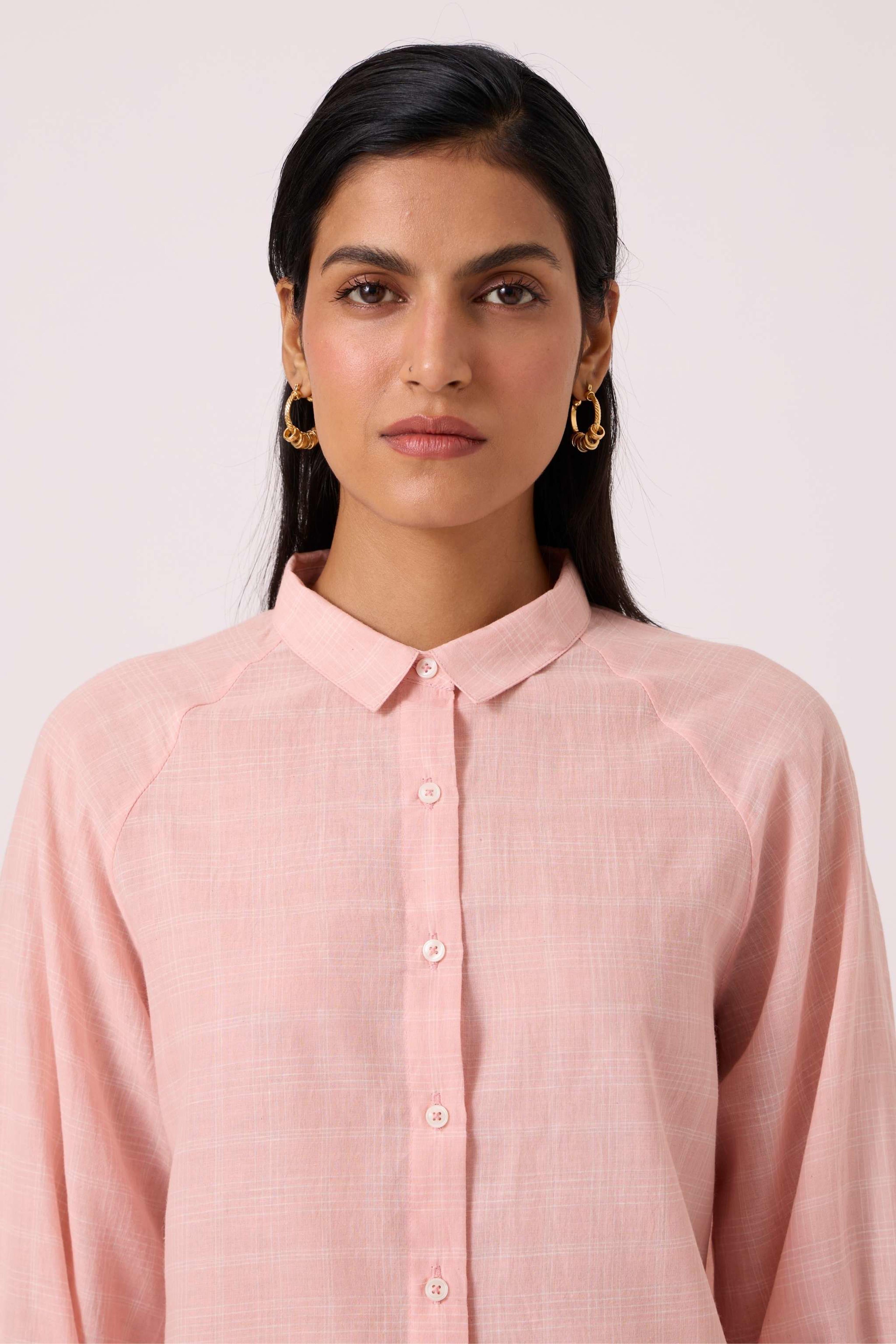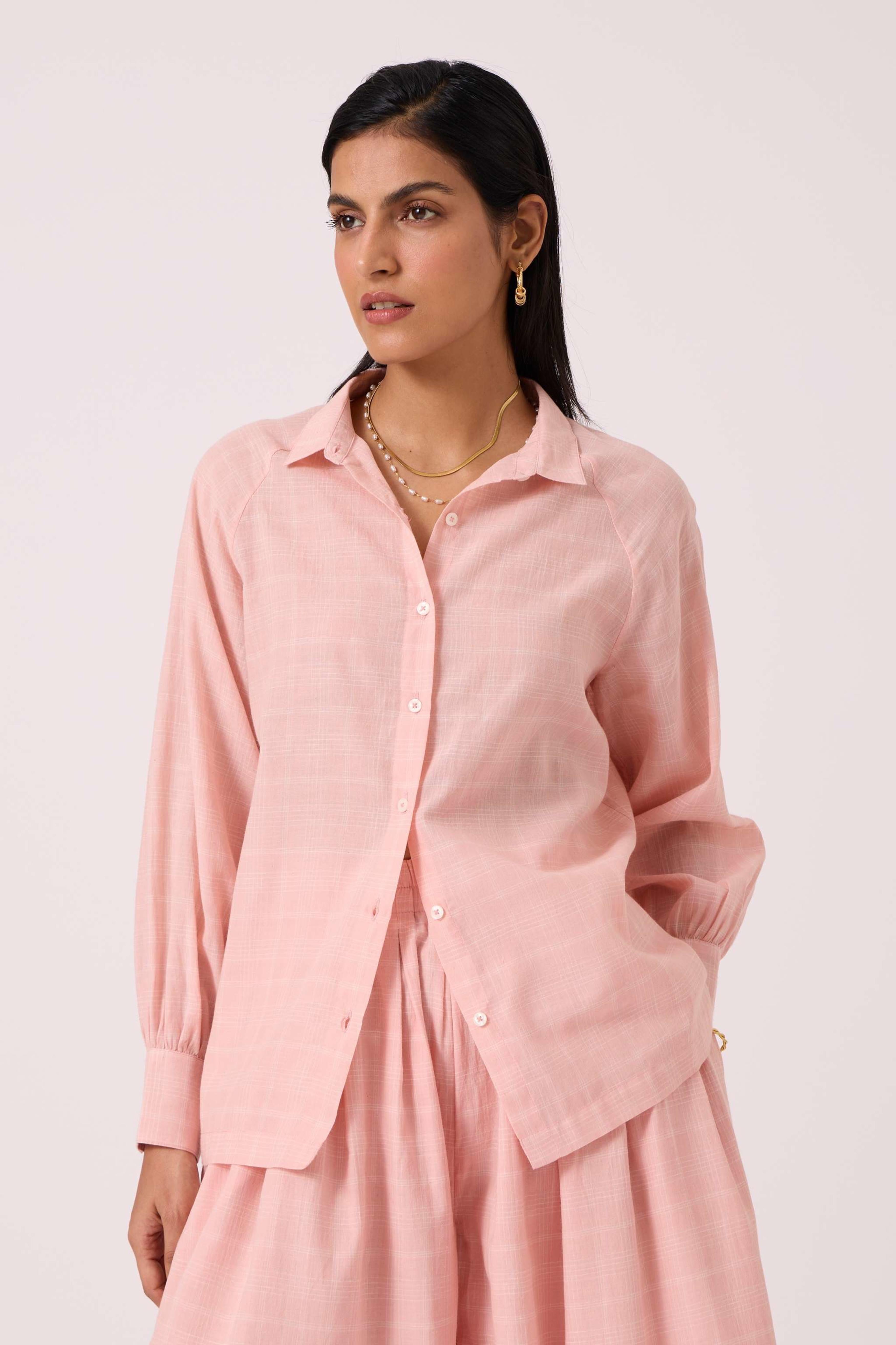 This is a *relaxed-fit shirt* with a *front placket* and button fastening. It features *raglan bishop sleeves* that are finished with a wide cuff. The shirt has a *back yoke with gathers* for added ease and a *slightly curved hemline*. The fabric is a studio-developed design that has been *handwoven by artisans in Bengal*. For sizing reference, the model Chhavi, who is 5'6", is wearing an XS.