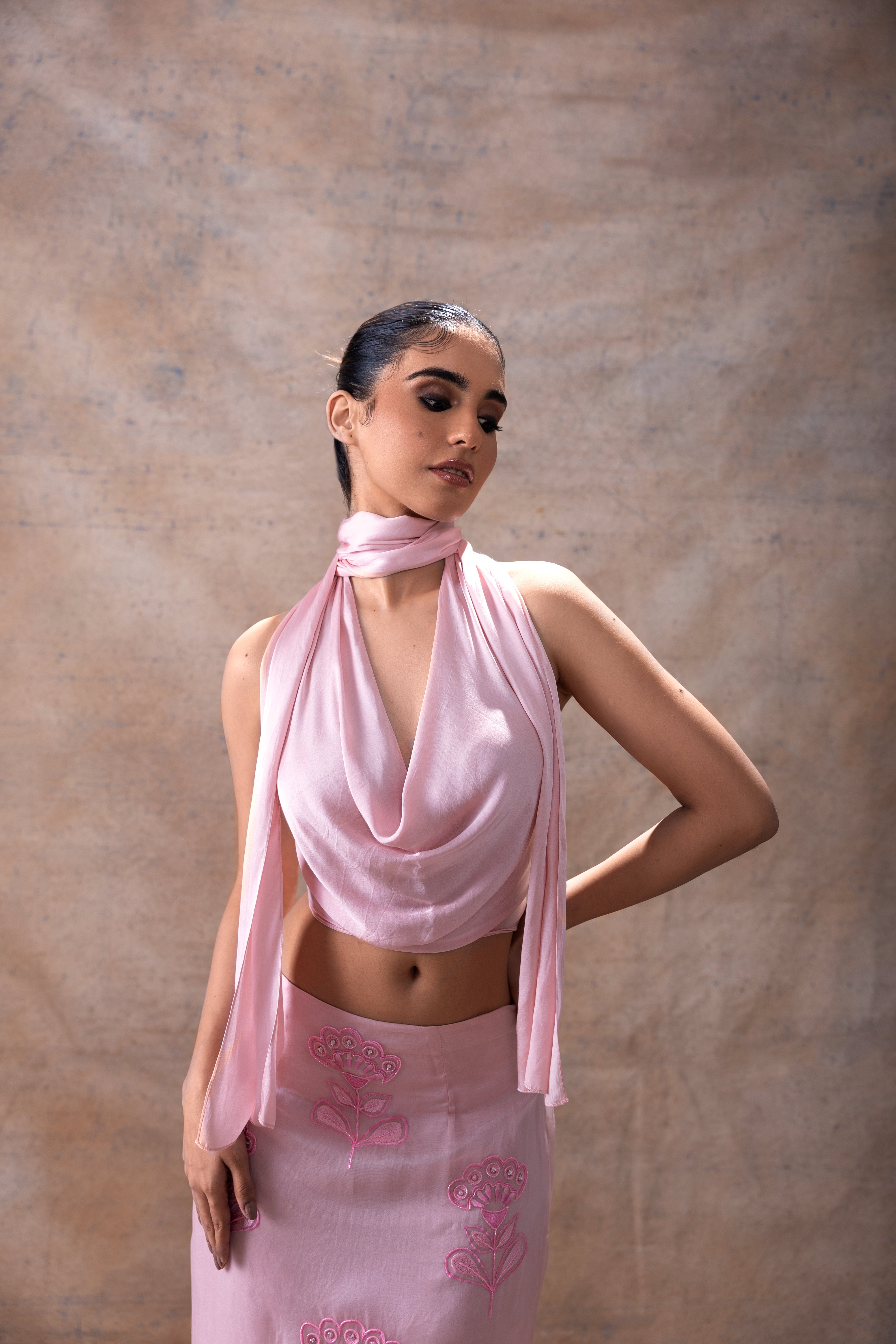 Elevate your festive wardrobe with this chic modal silk cowl neck blouse featuring fabric button fastening at the back, paired with an attached stole that offers versatile styling options. Matched with an intricately embroidered skirt adorned with floral motifs and cut dana work, this set exudes effortless elegance. Designed to be travel-friendly and perfect for destination weddings and festive celebrations, it is lightweight and easy to carry. Ideal for those who seek style and comfort, this outfit combines modern sophistication with traditional craftsmanship.