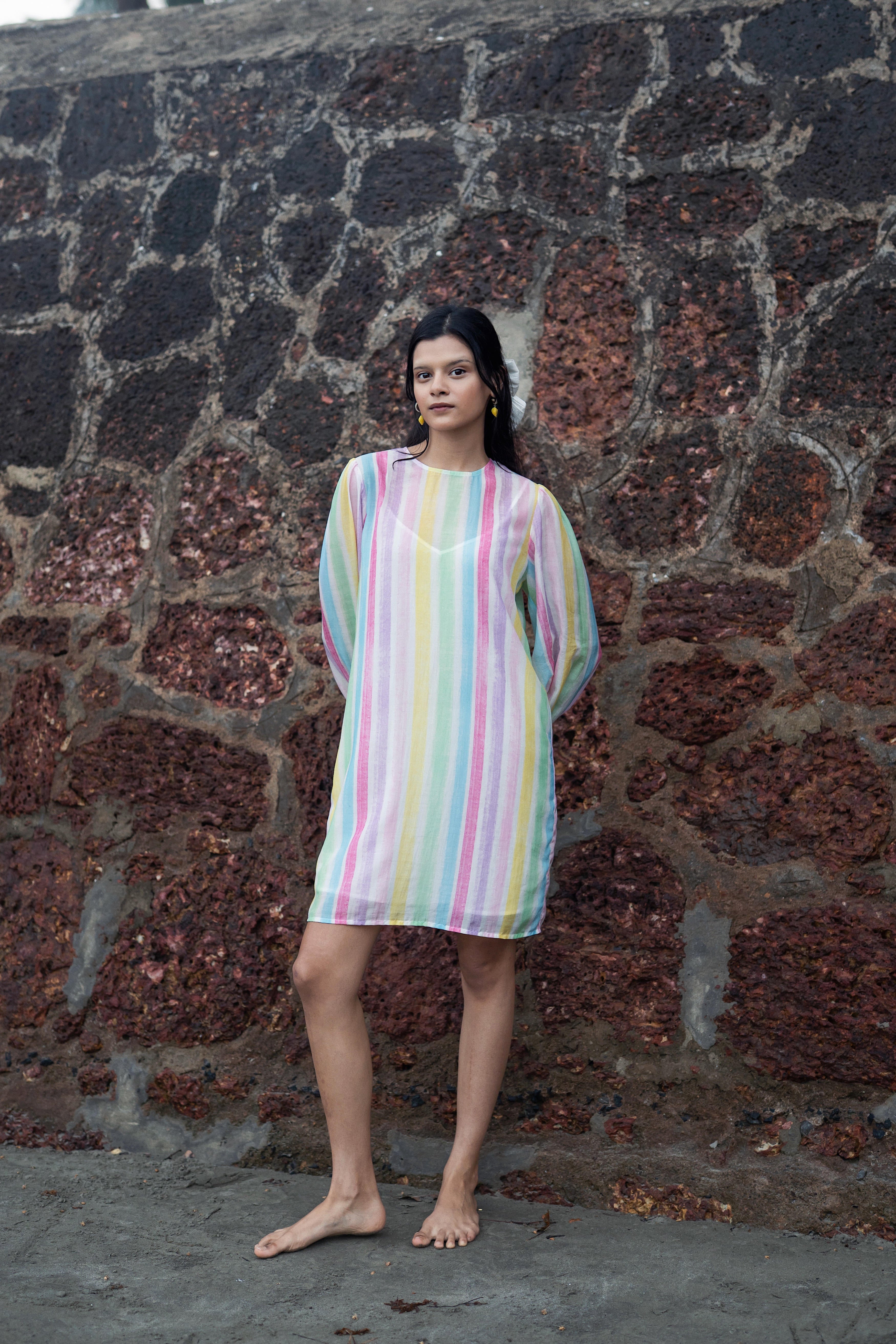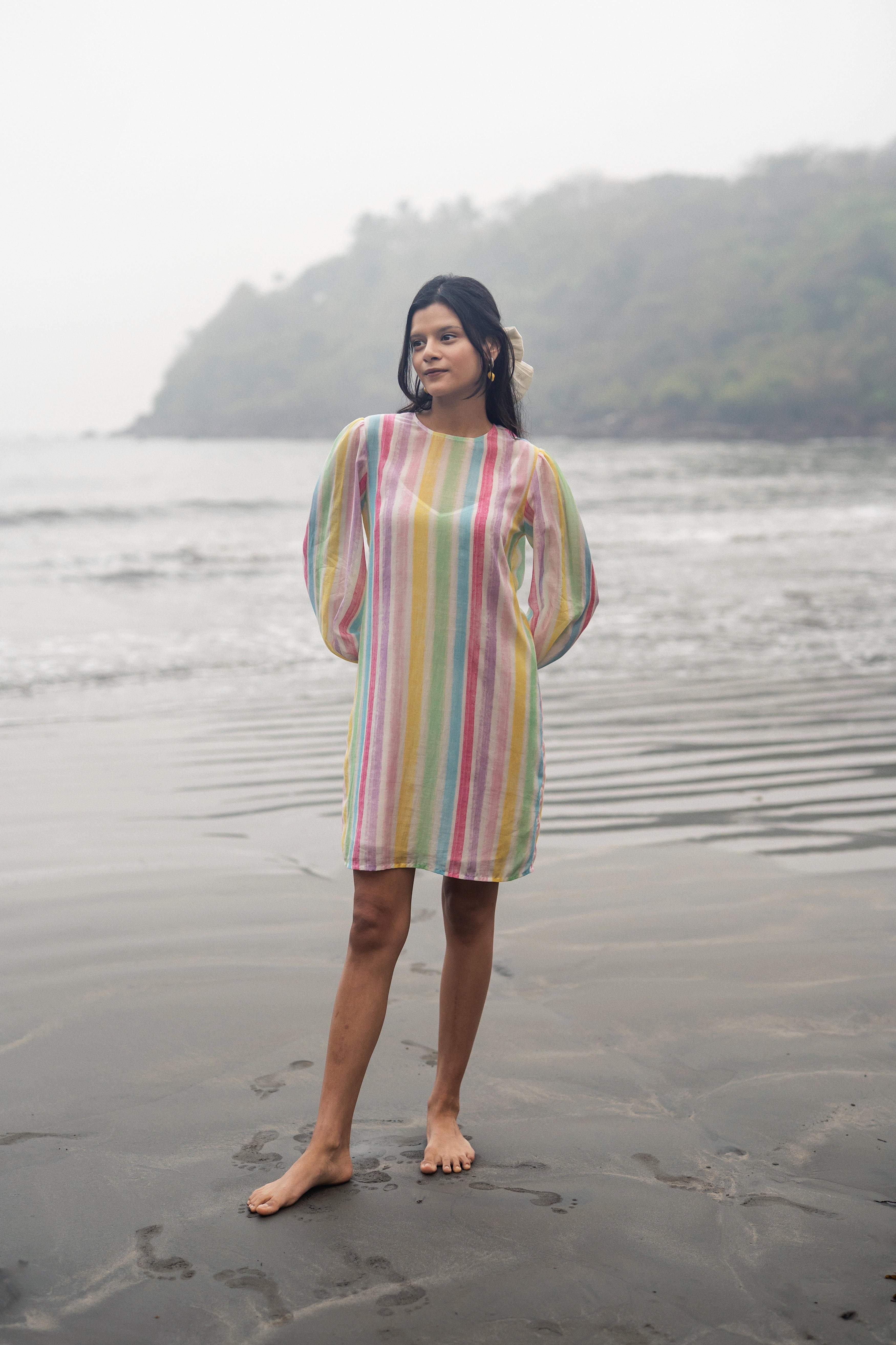 The Zavi Short Dress is made from our Cotton Silk fabrication in our candy print with a mulmul off white slip inside.