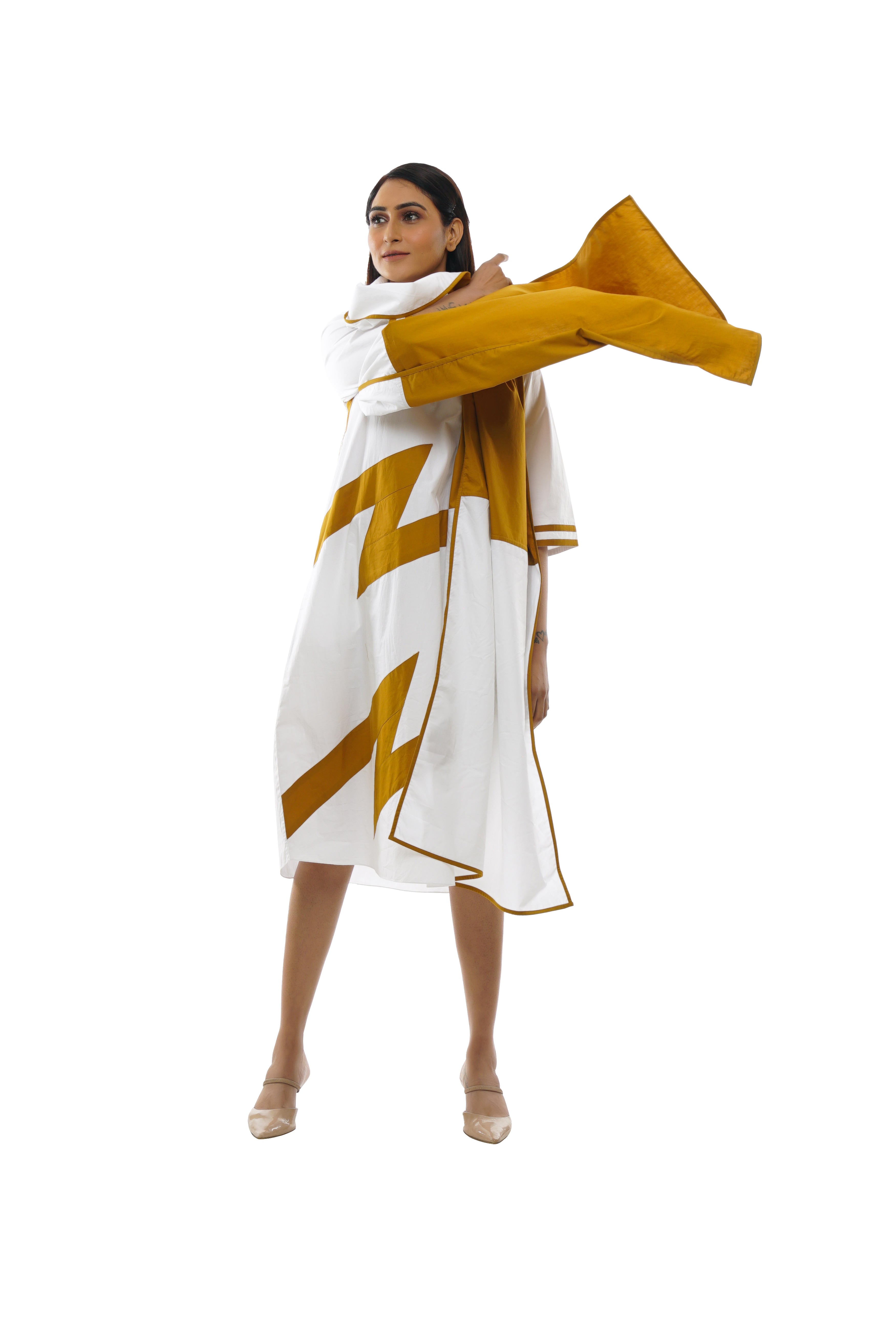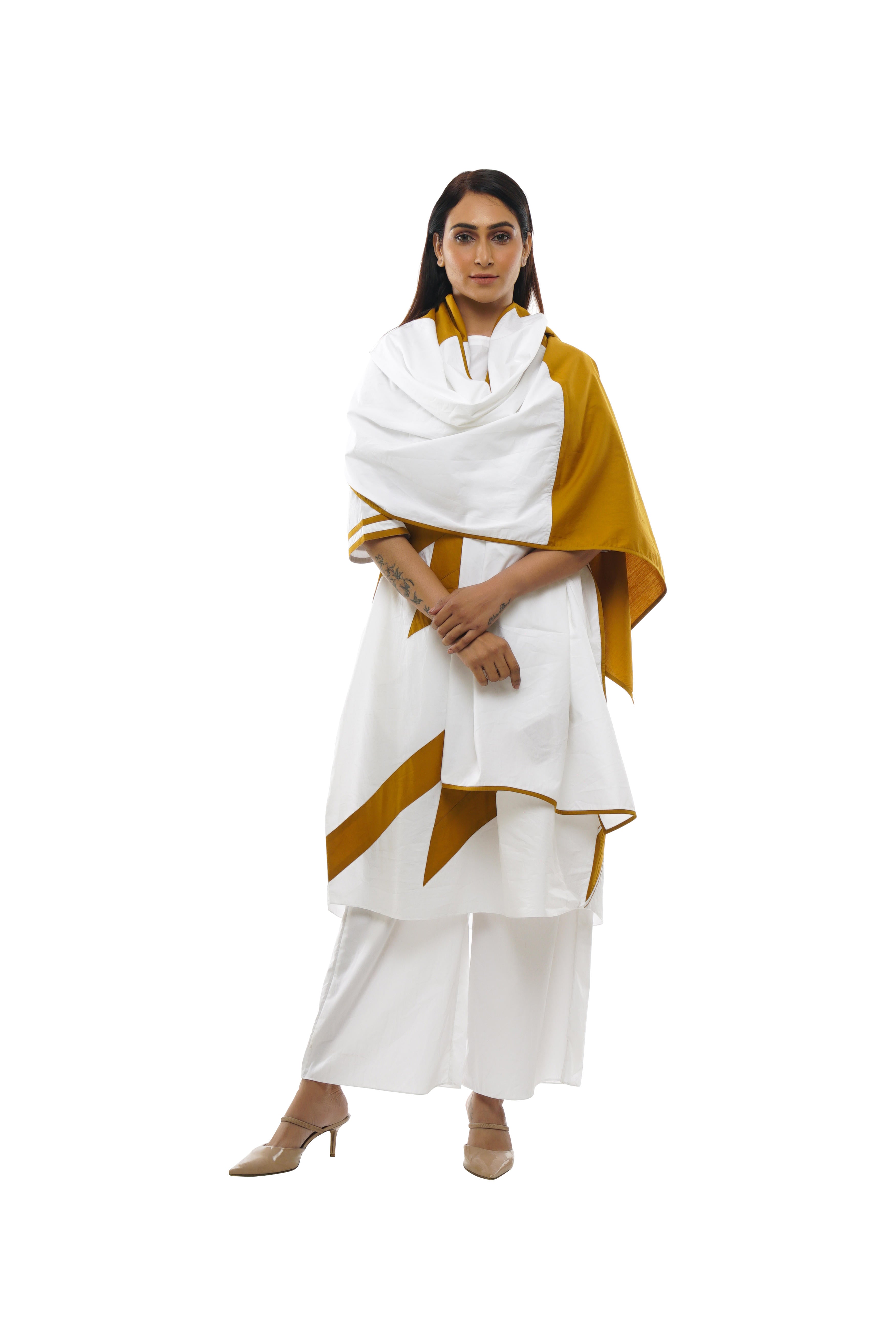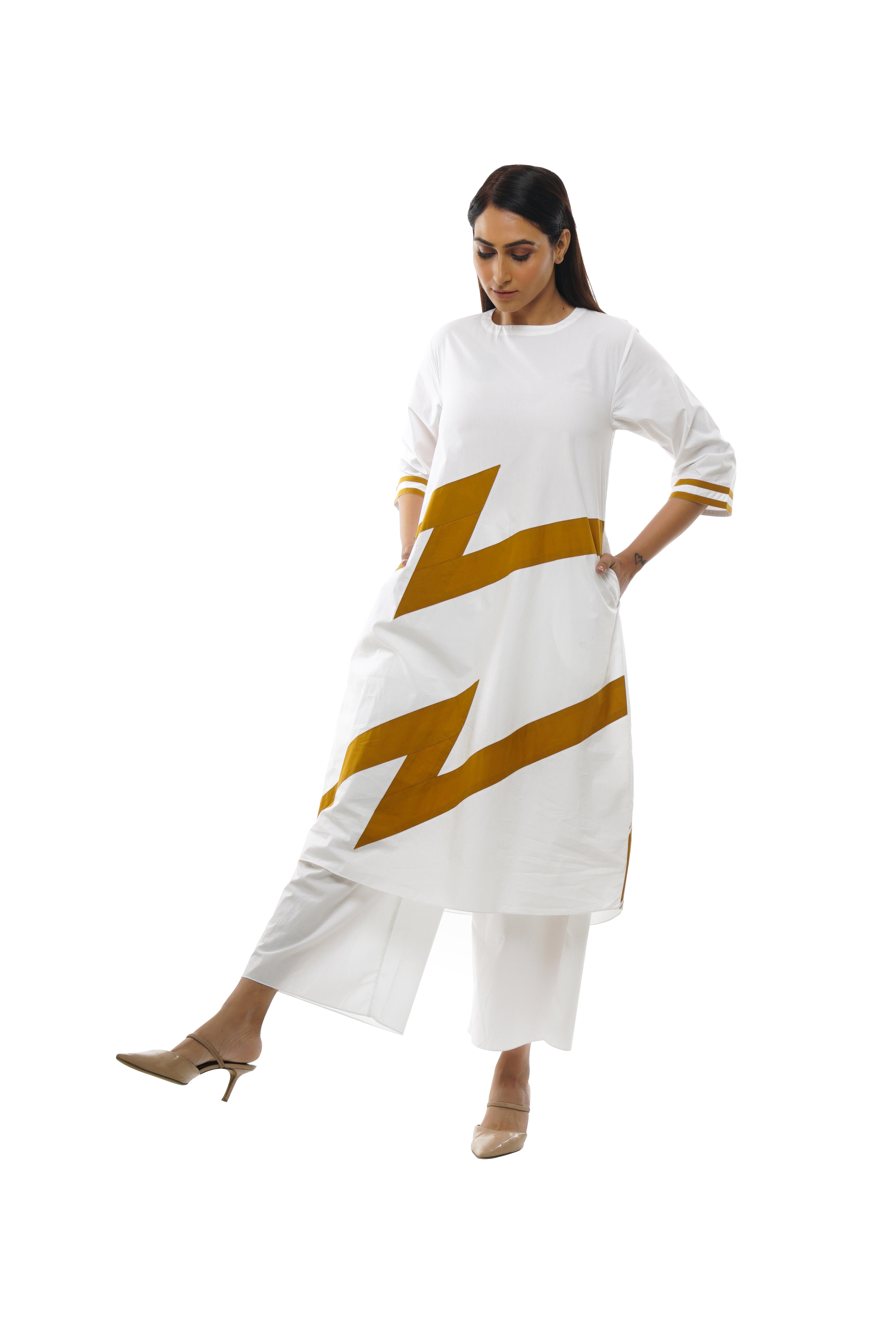 This kurta set is your go-to for structured chic. With the standout Z-shape mustard patti and a tailored white poplin pant, it merges crisp design with ease. A clean palette with graphic contrast — perfect for work days or smart day-outs.