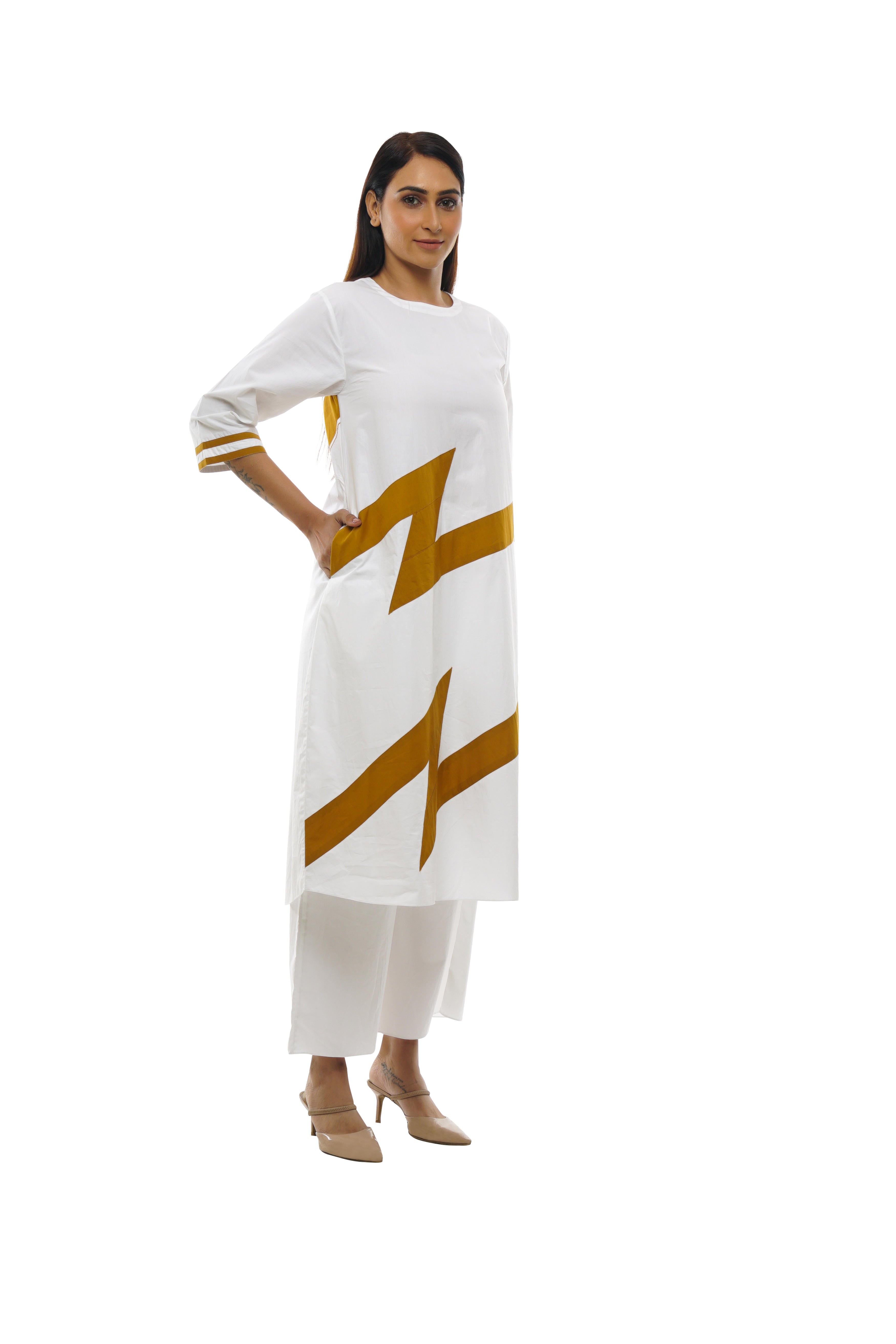 Strike the perfect balance between bold and graceful in this three-piece suit. The iconic Z-shape patti on the kurta pairs seamlessly with wide-leg trousers and a matching dupatta in mustard and white — for a complete look that turns heads with minimal effort.