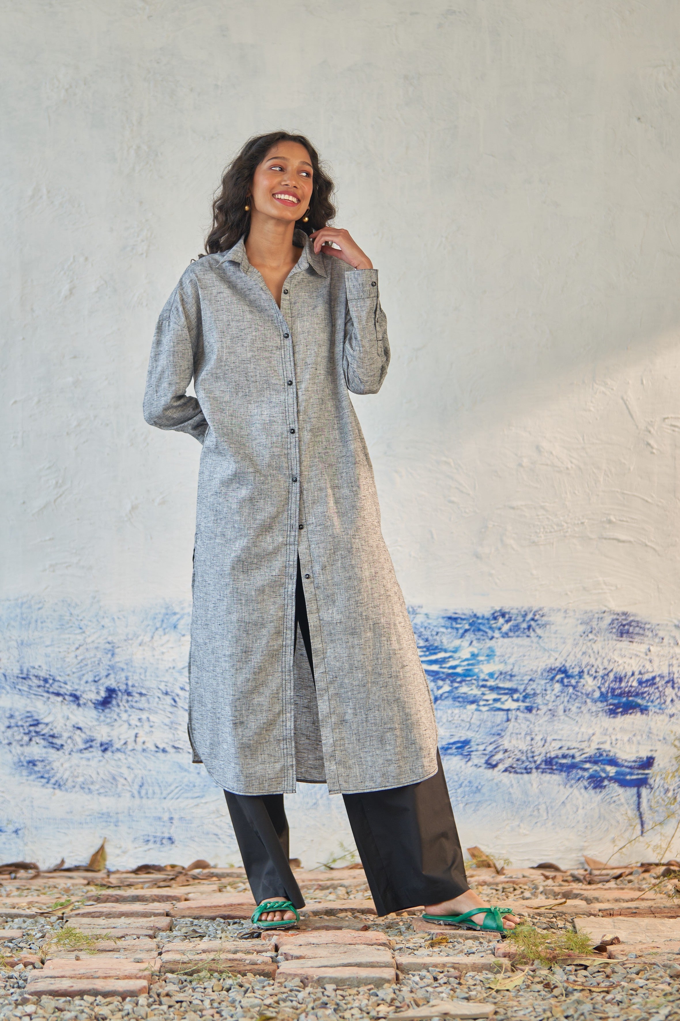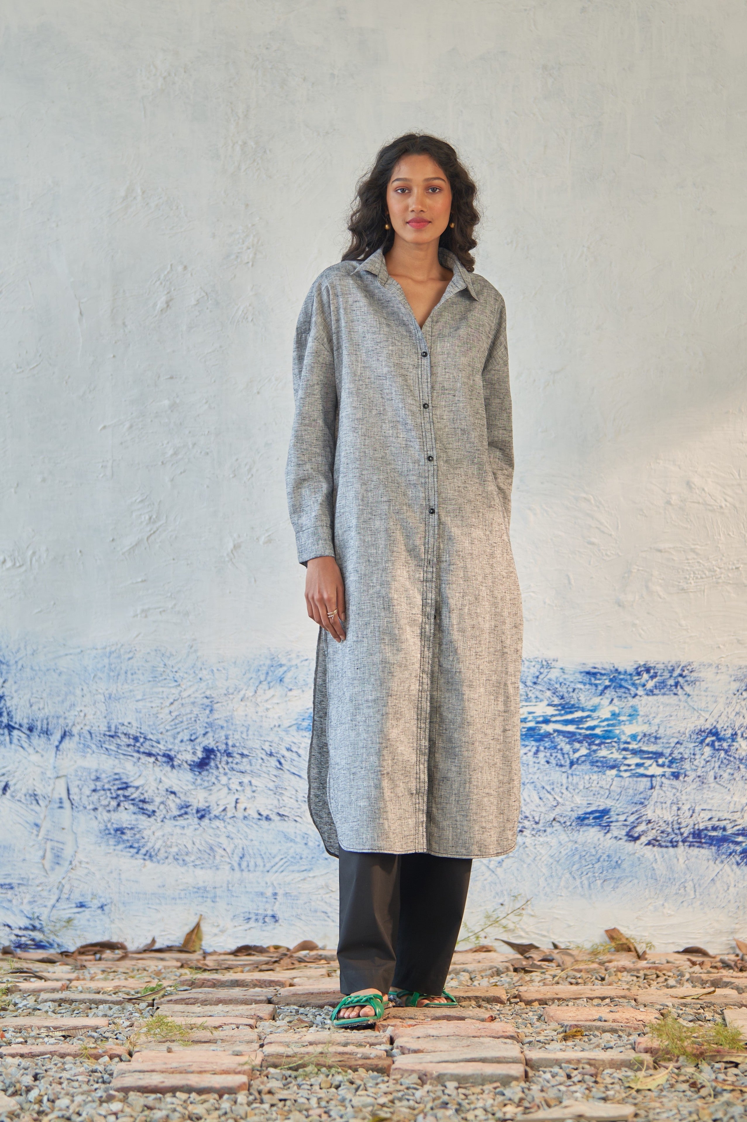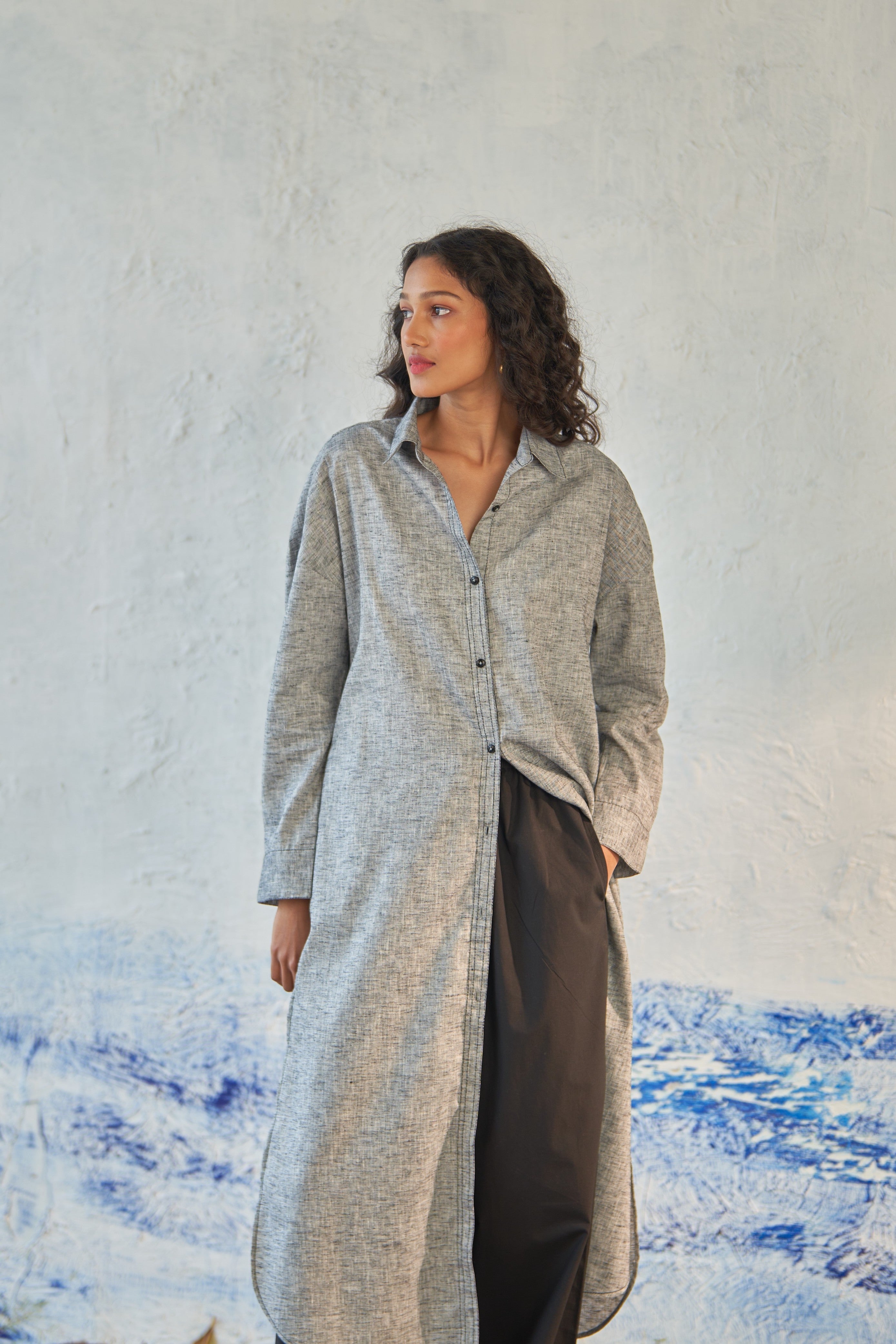 Easily adaptable to any ensemble, this versatile long shirt is a wardrobe essential. Wear it as a stylish overlay or pair it with loose pants for a relaxed look. Boasting an oversized fit, drop shoulders, and side slits, it effortlessly embodies the casual charm perfect for any laid-back setting.