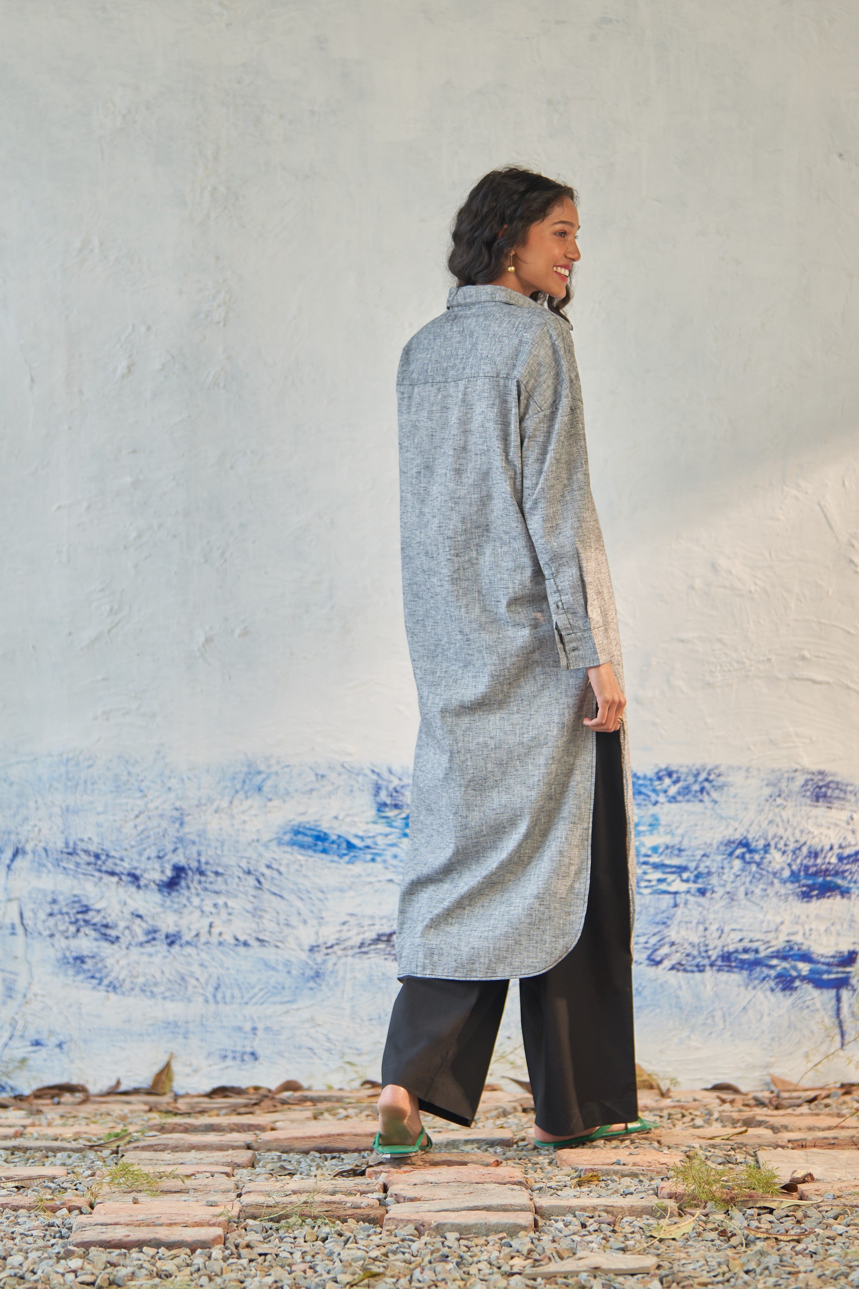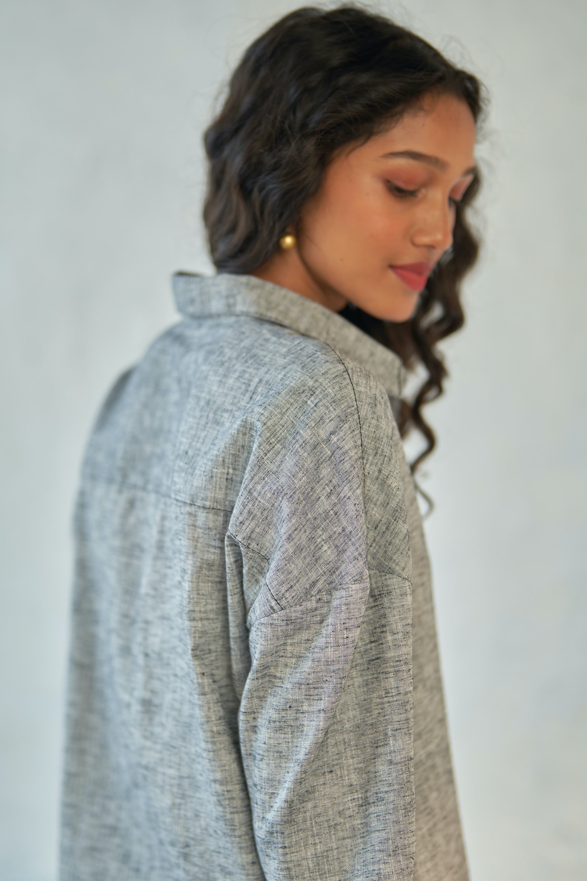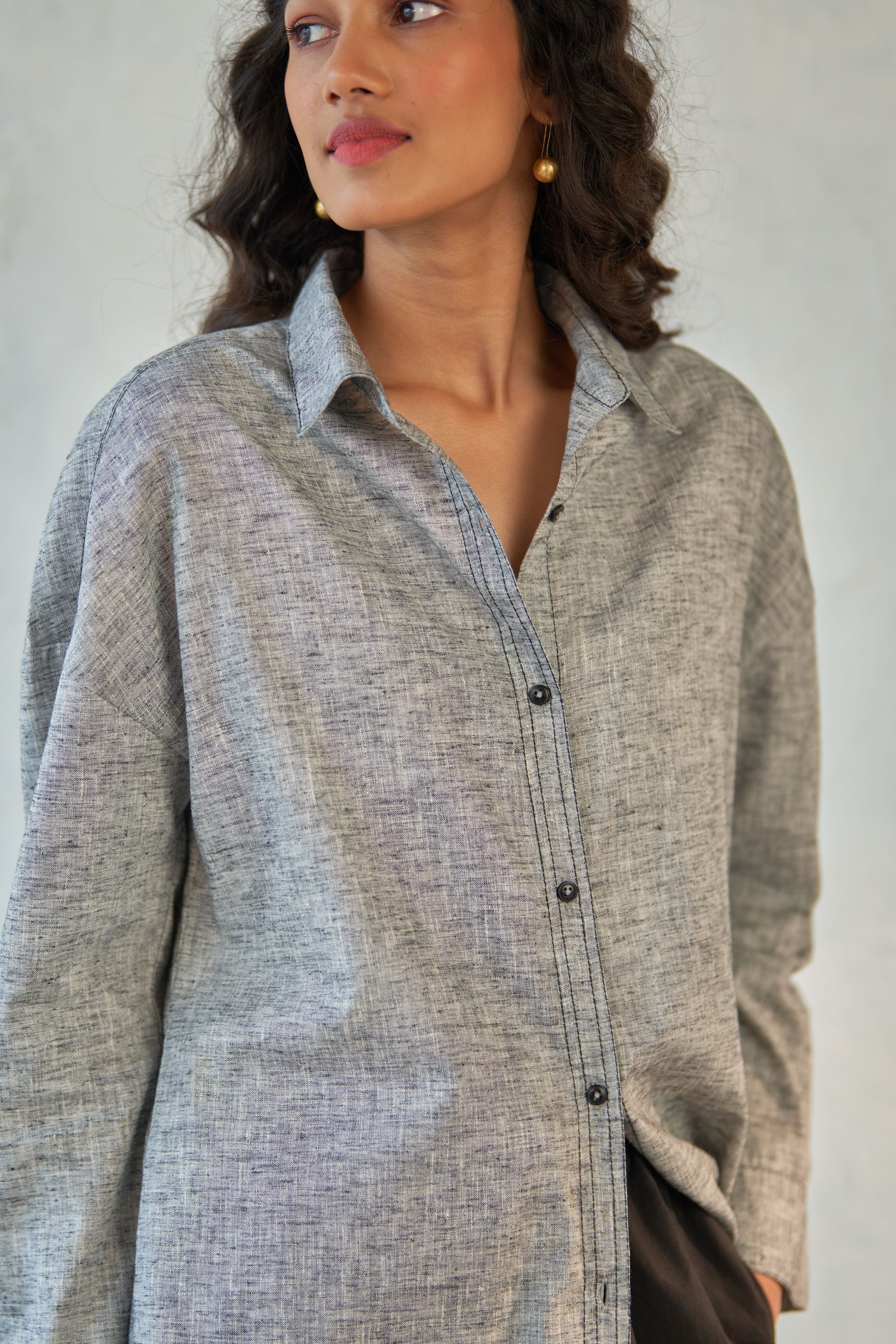 Easily adaptable to any ensemble, this versatile long shirt is a wardrobe essential. Wear it as a stylish overlay or pair it with loose pants for a relaxed look. Boasting an oversized fit, drop shoulders, and side slits, it effortlessly embodies the casual charm perfect for any laid-back setting.