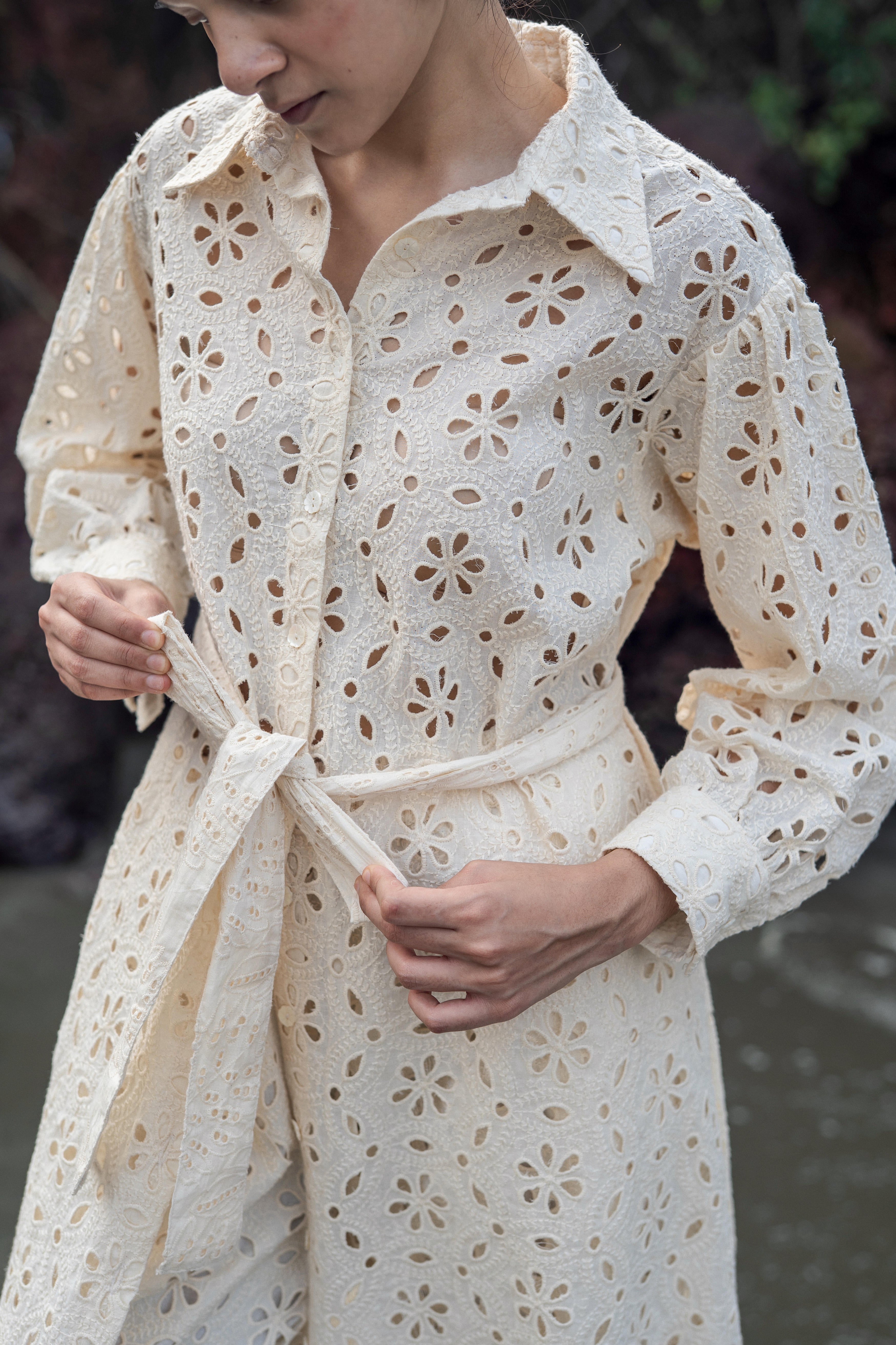 The Zinnia embroidered dress is made of hakoba embroidered fabric. It is a button down dress with a belt attachment which can be styled in multiple ways.