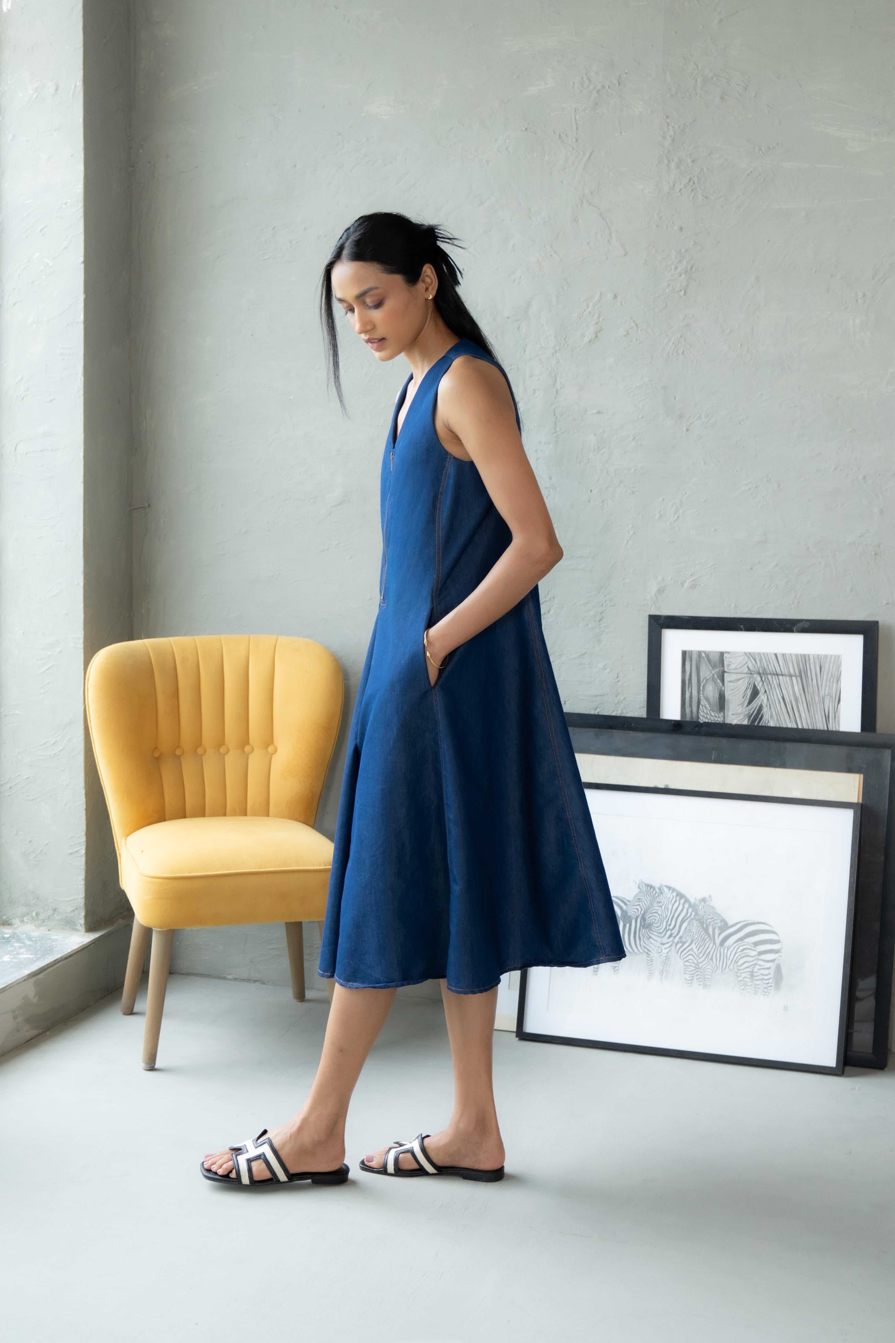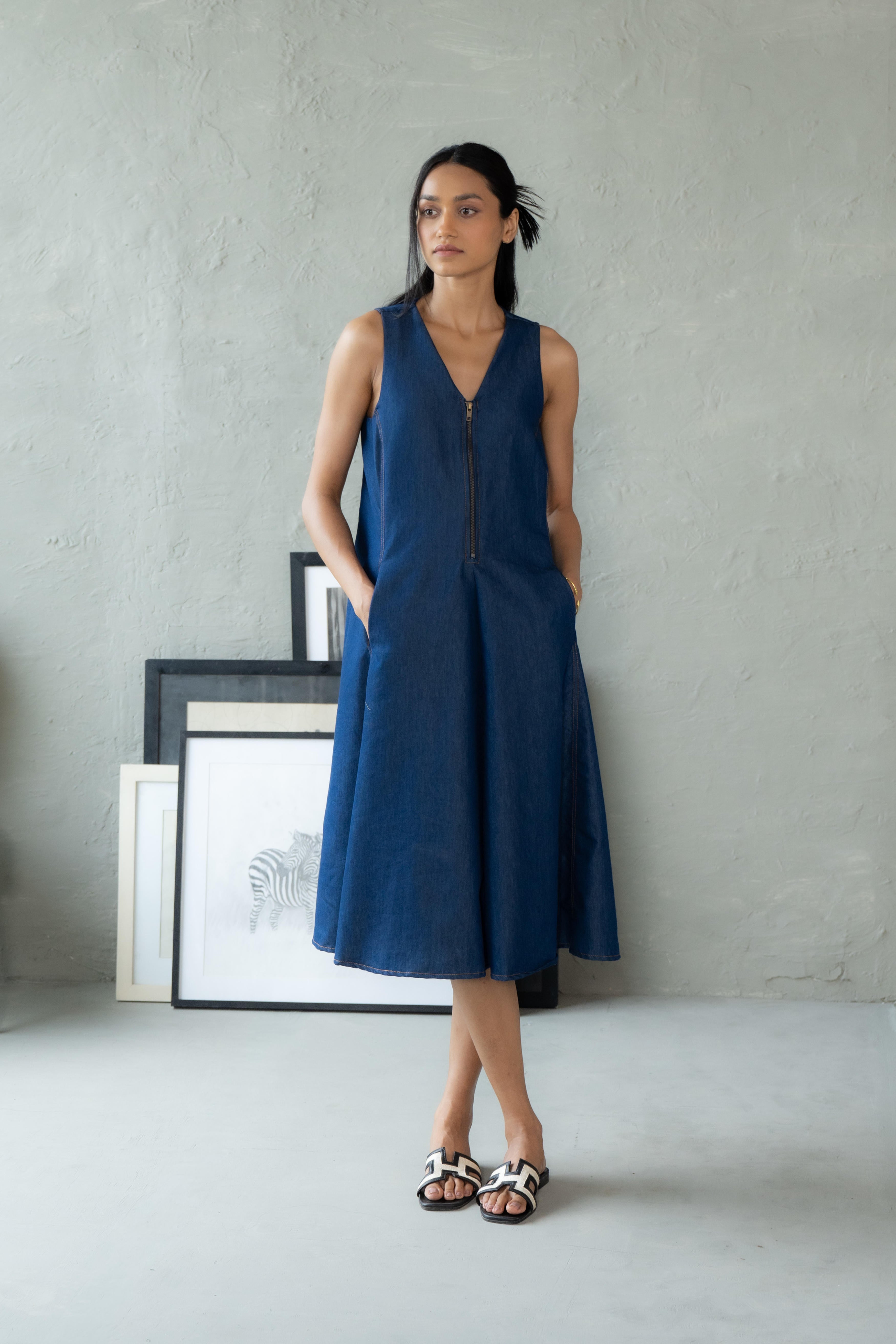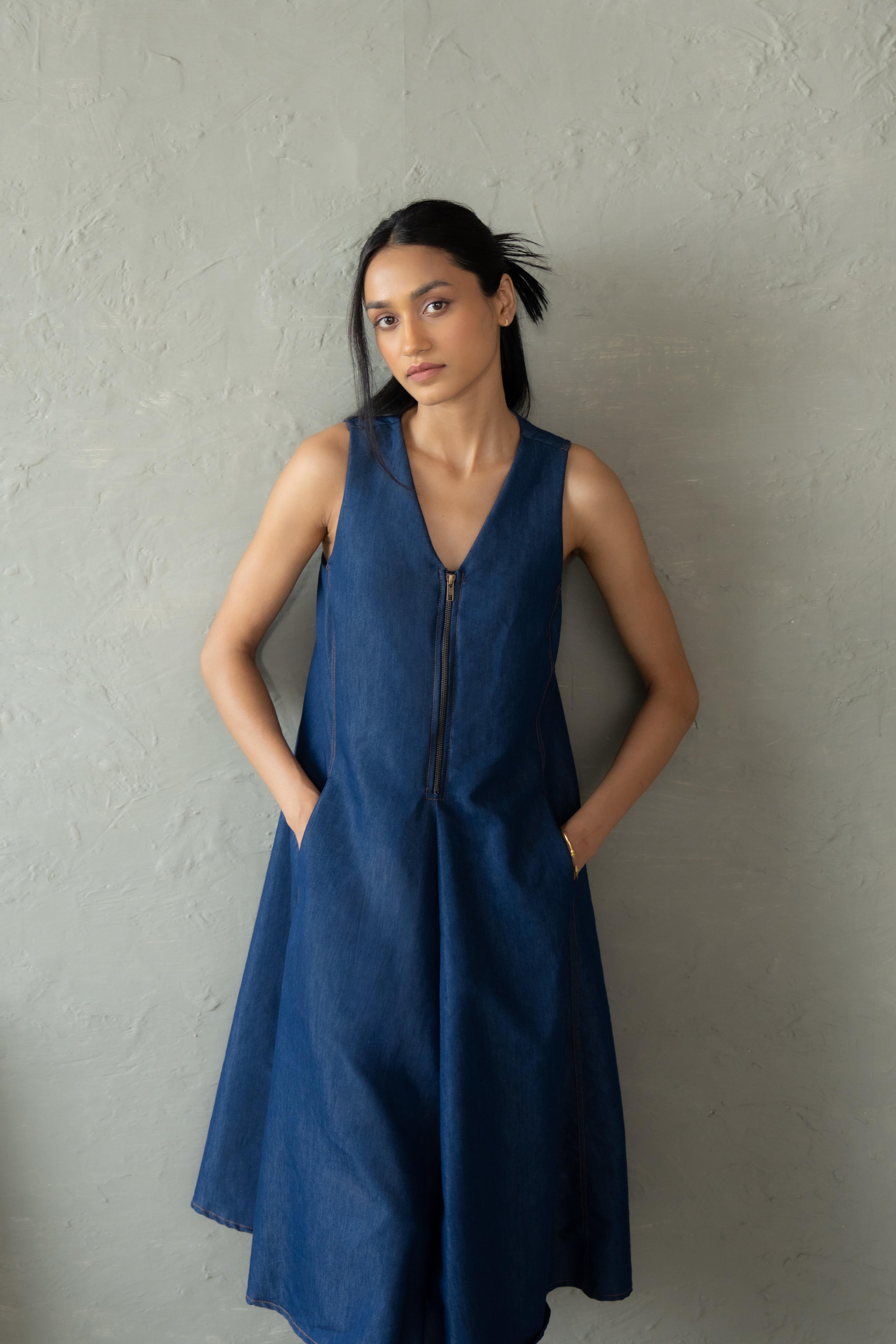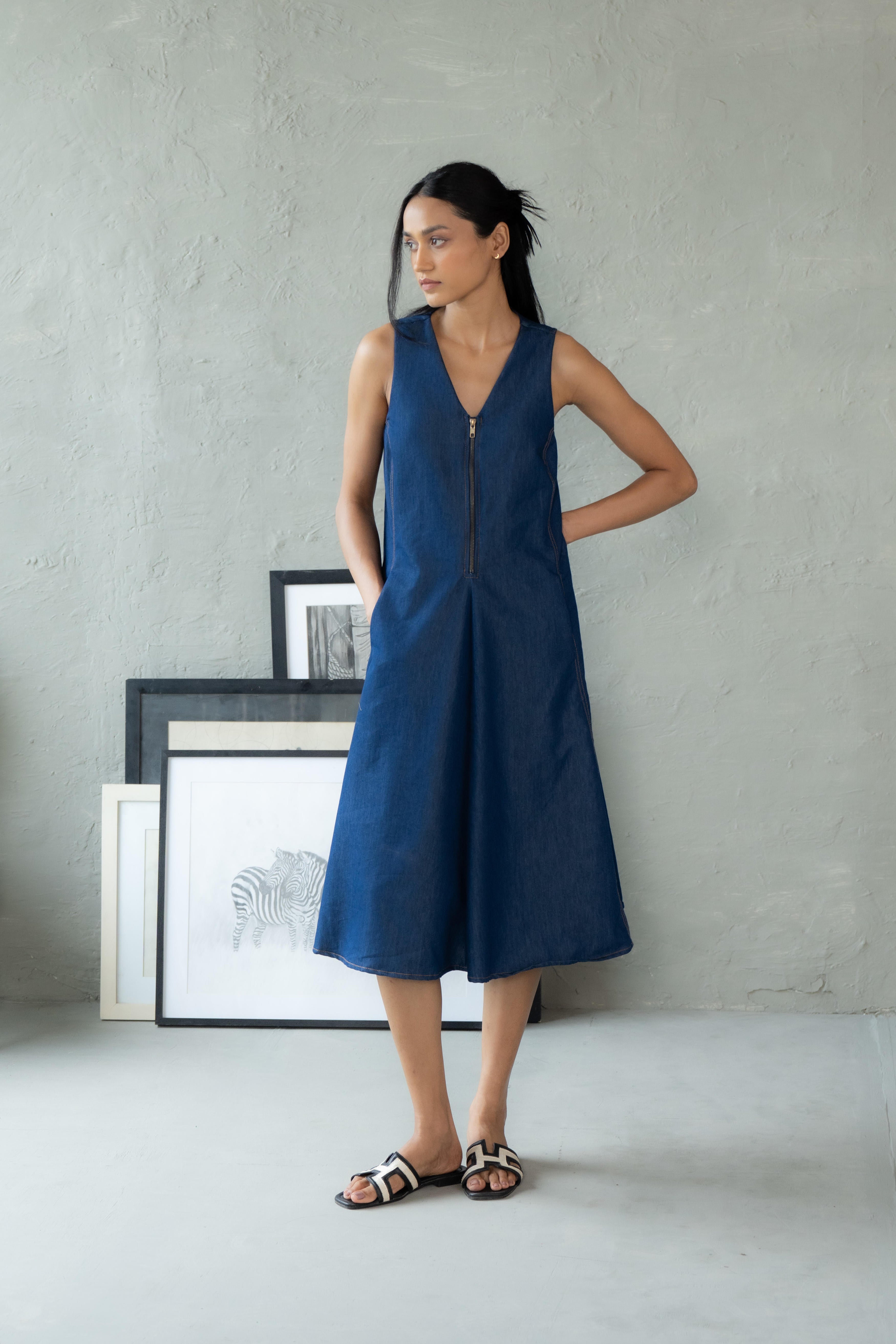Cut in a clean, contemporary silhouette, this V-neck denim dress features a sleek metal front zipper for a modern edge. The highlight lies in its angular armhole cuts at both front and back, giving the dress an architectural character and standout appeal. Falling to a flattering midi length, it balances casual ease with statement detailing — perfect for day-to-evening transitions. Model is 5.9".