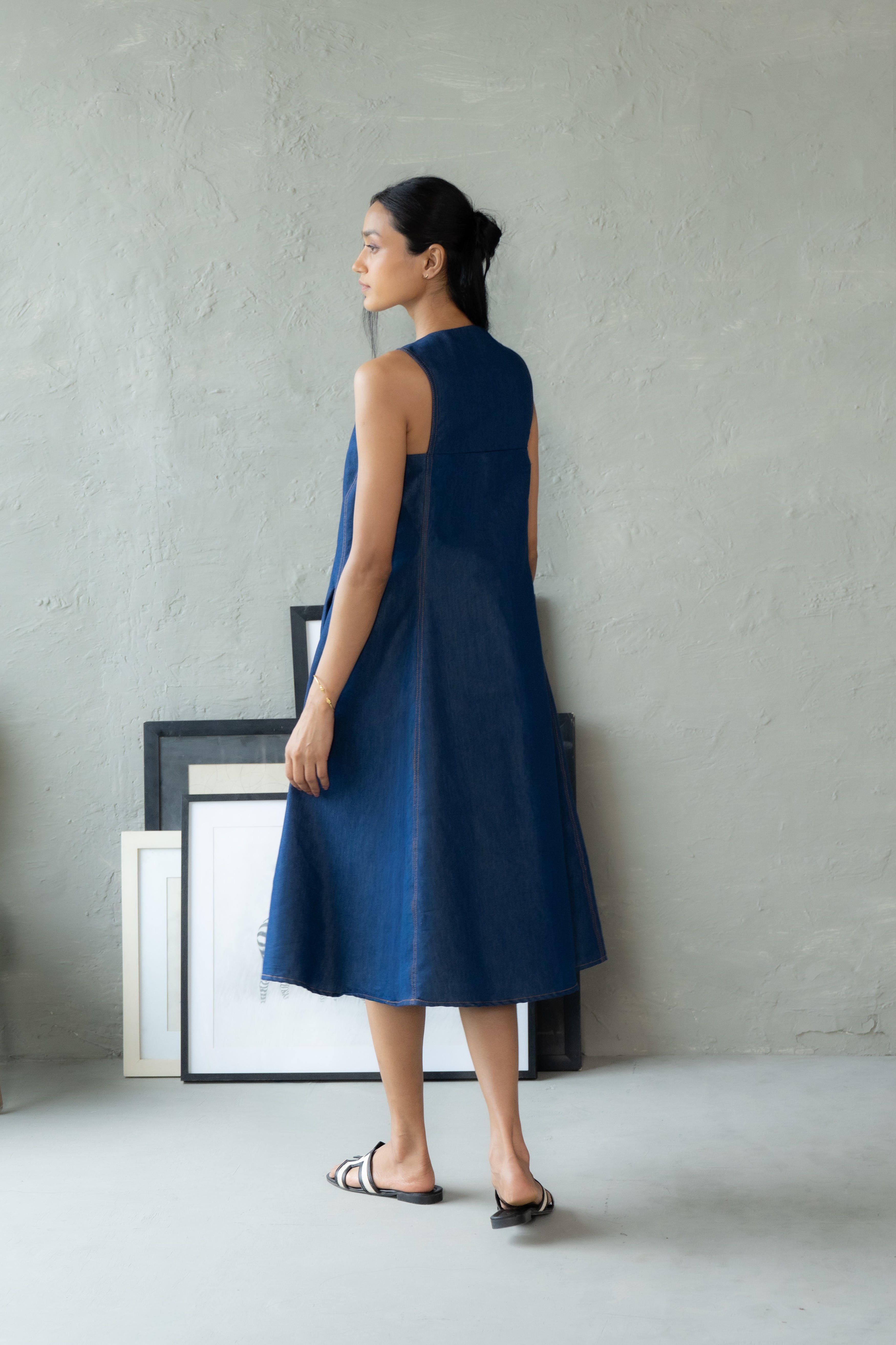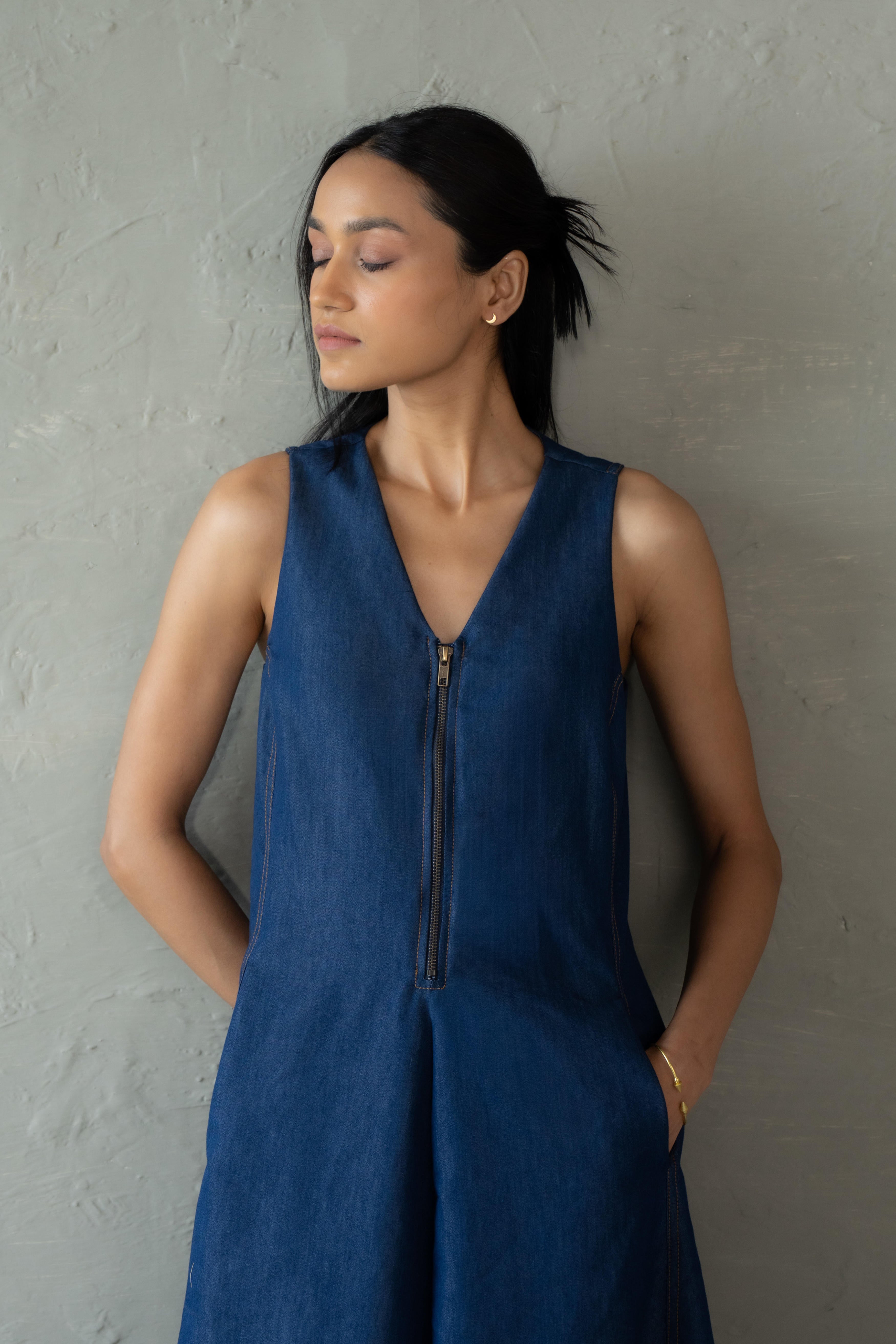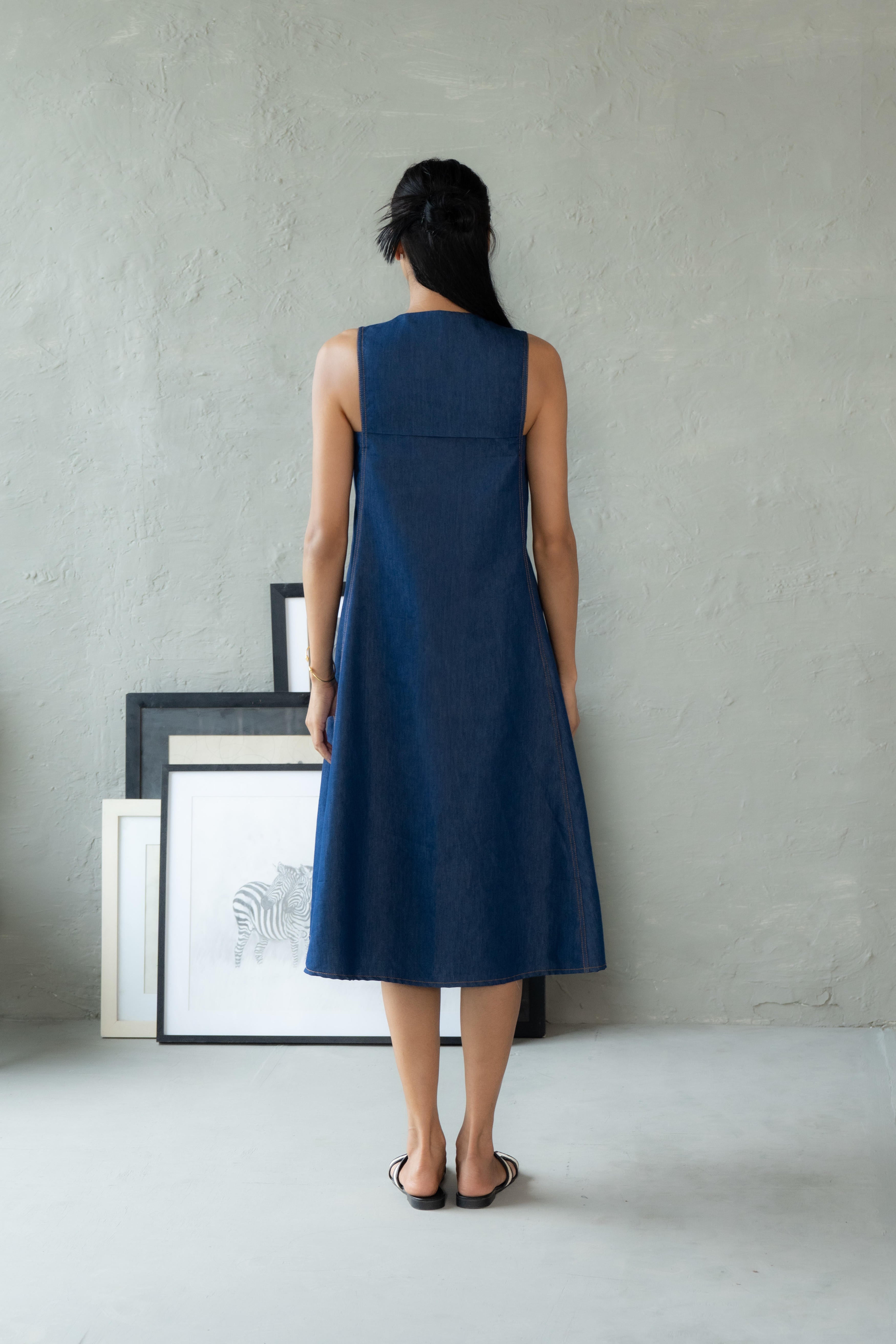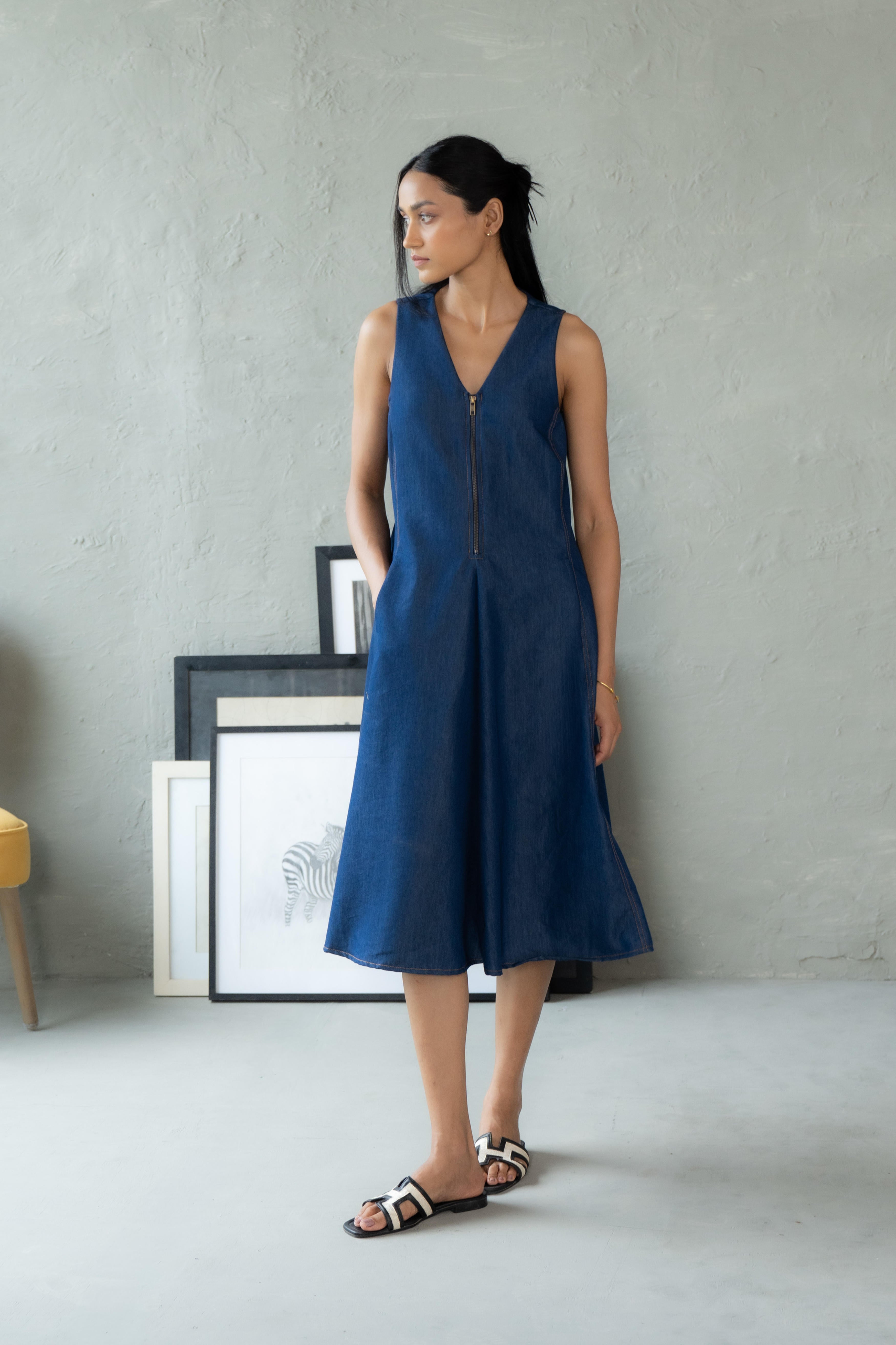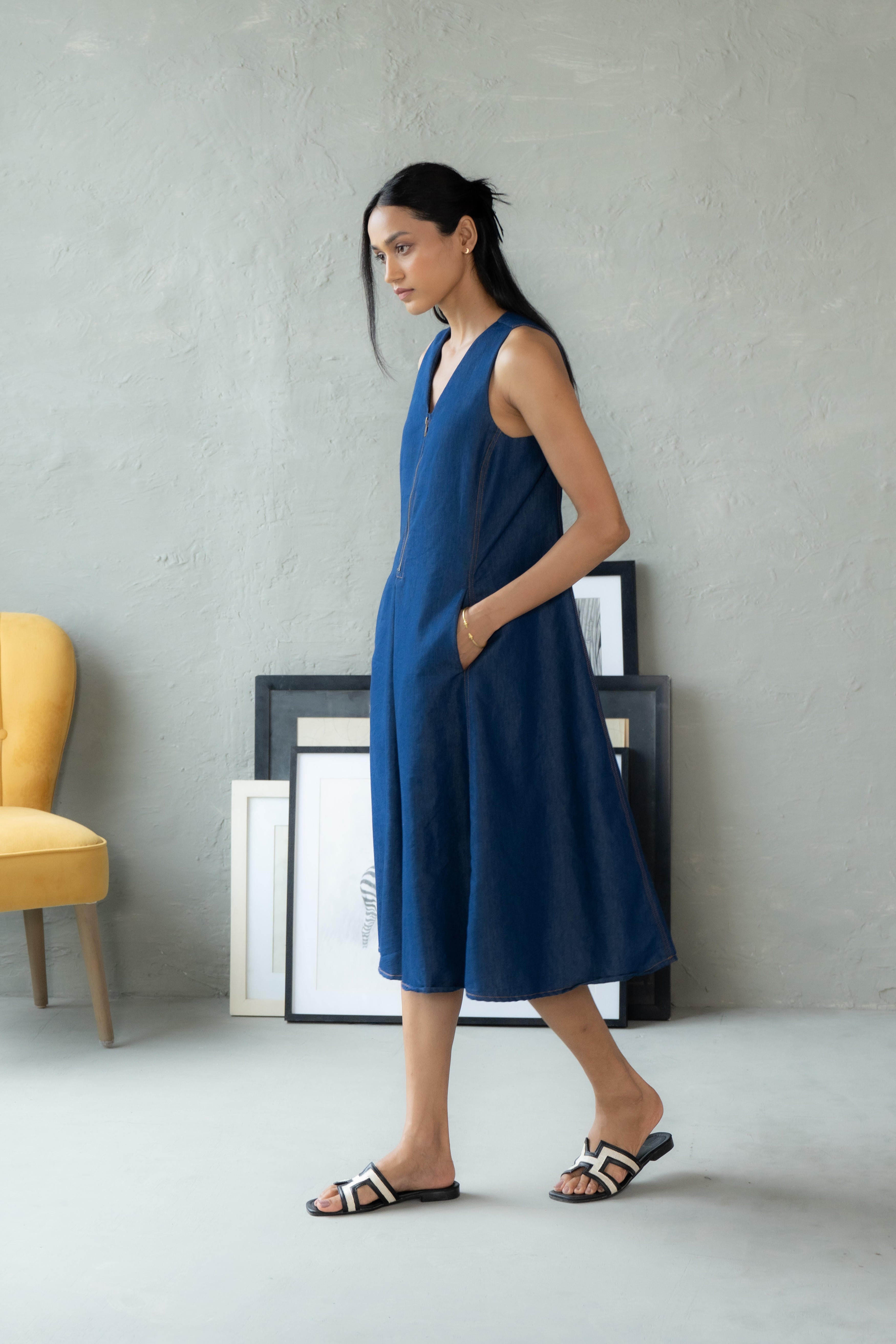 Cut in a clean, contemporary silhouette, this V-neck denim dress features a sleek metal front zipper for a modern edge. The highlight lies in its angular armhole cuts at both front and back, giving the dress an architectural character and standout appeal. Falling to a flattering midi length, it balances casual ease with statement detailing — perfect for day-to-evening transitions. Model is 5.9".