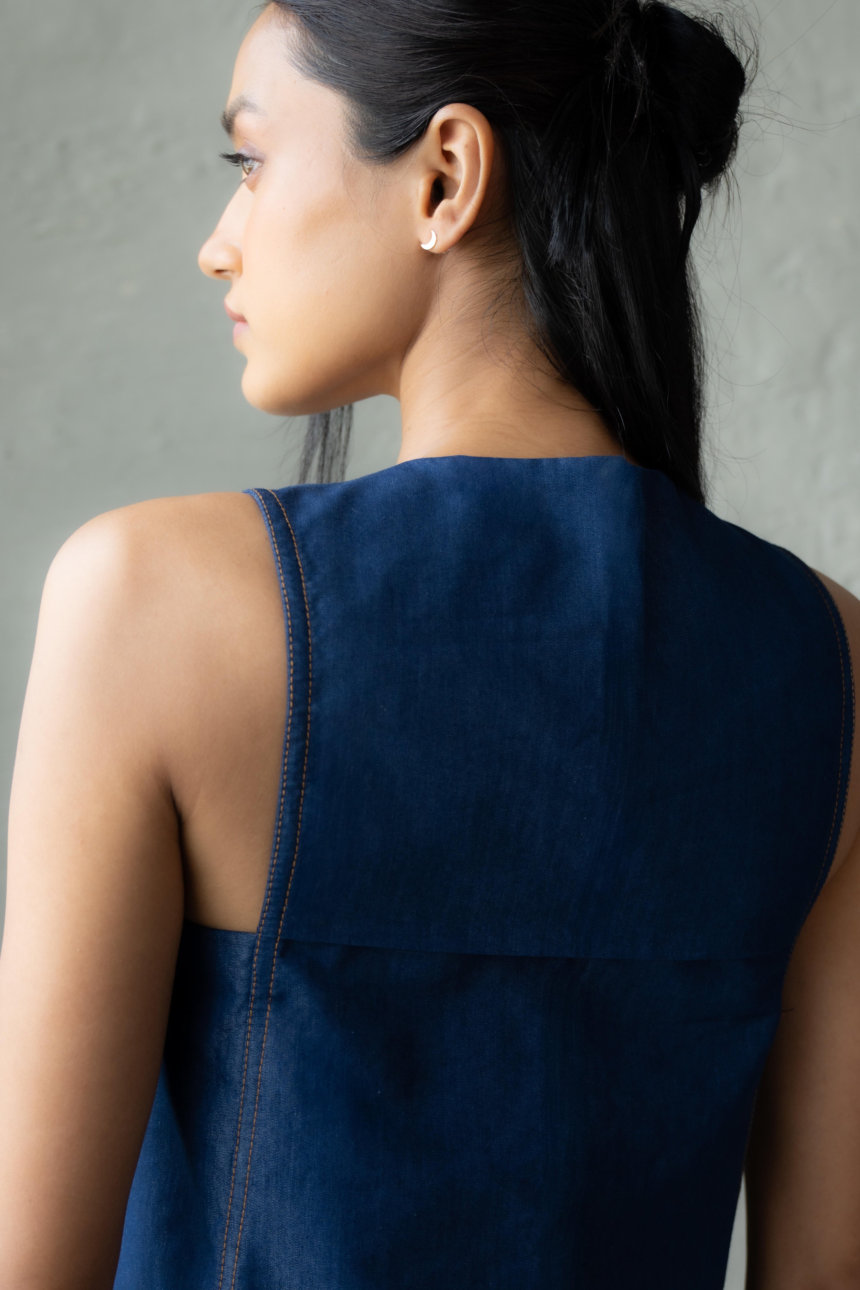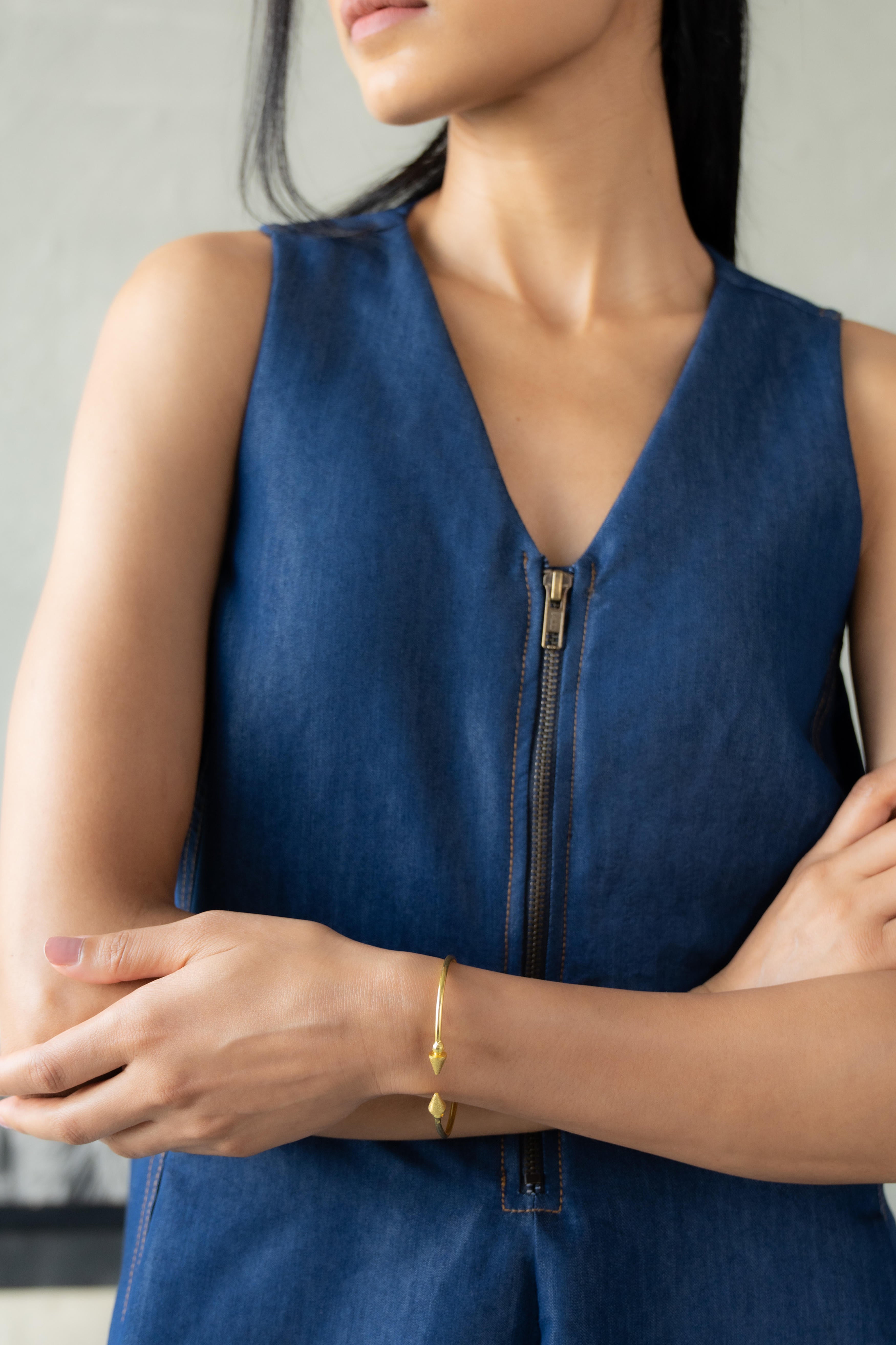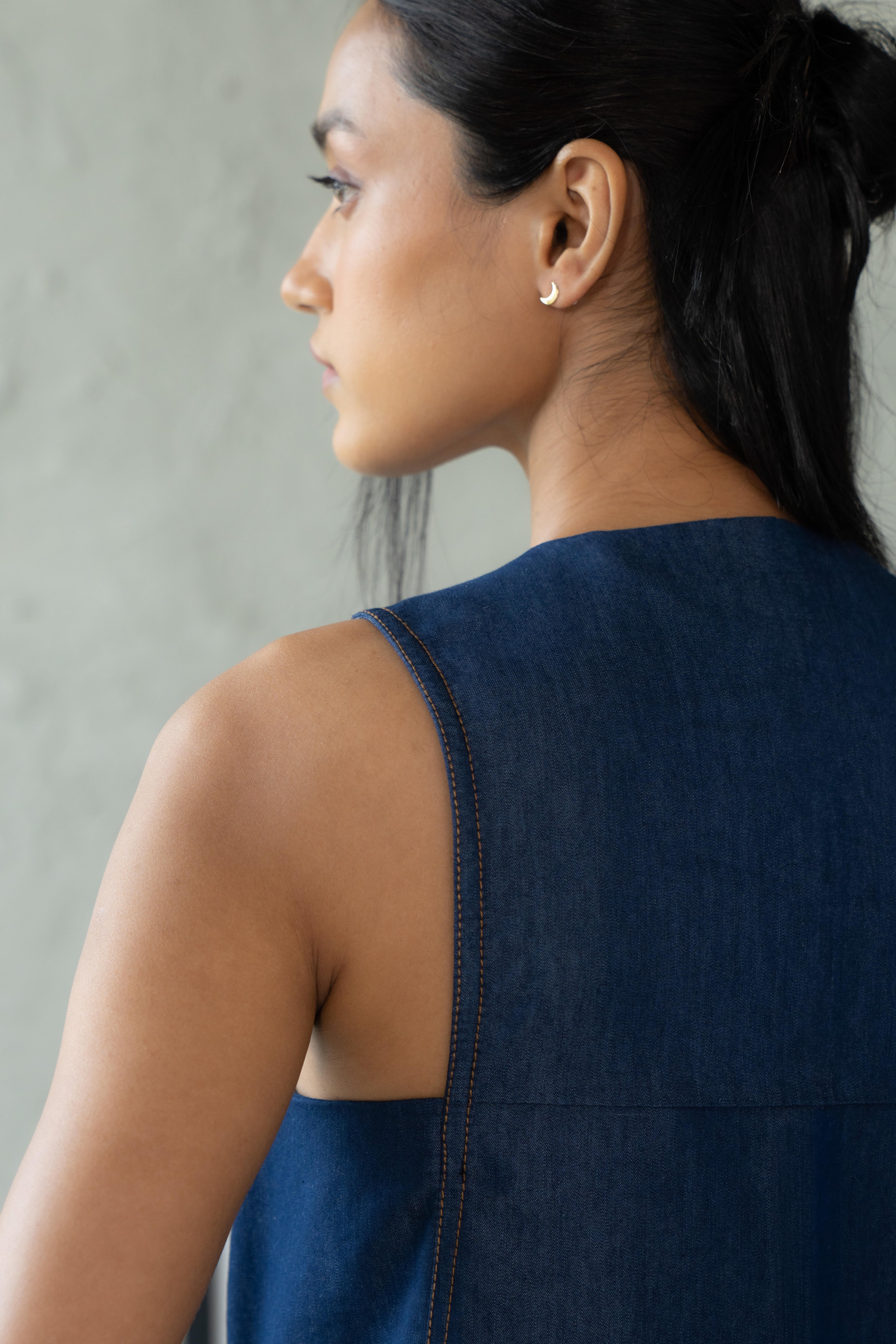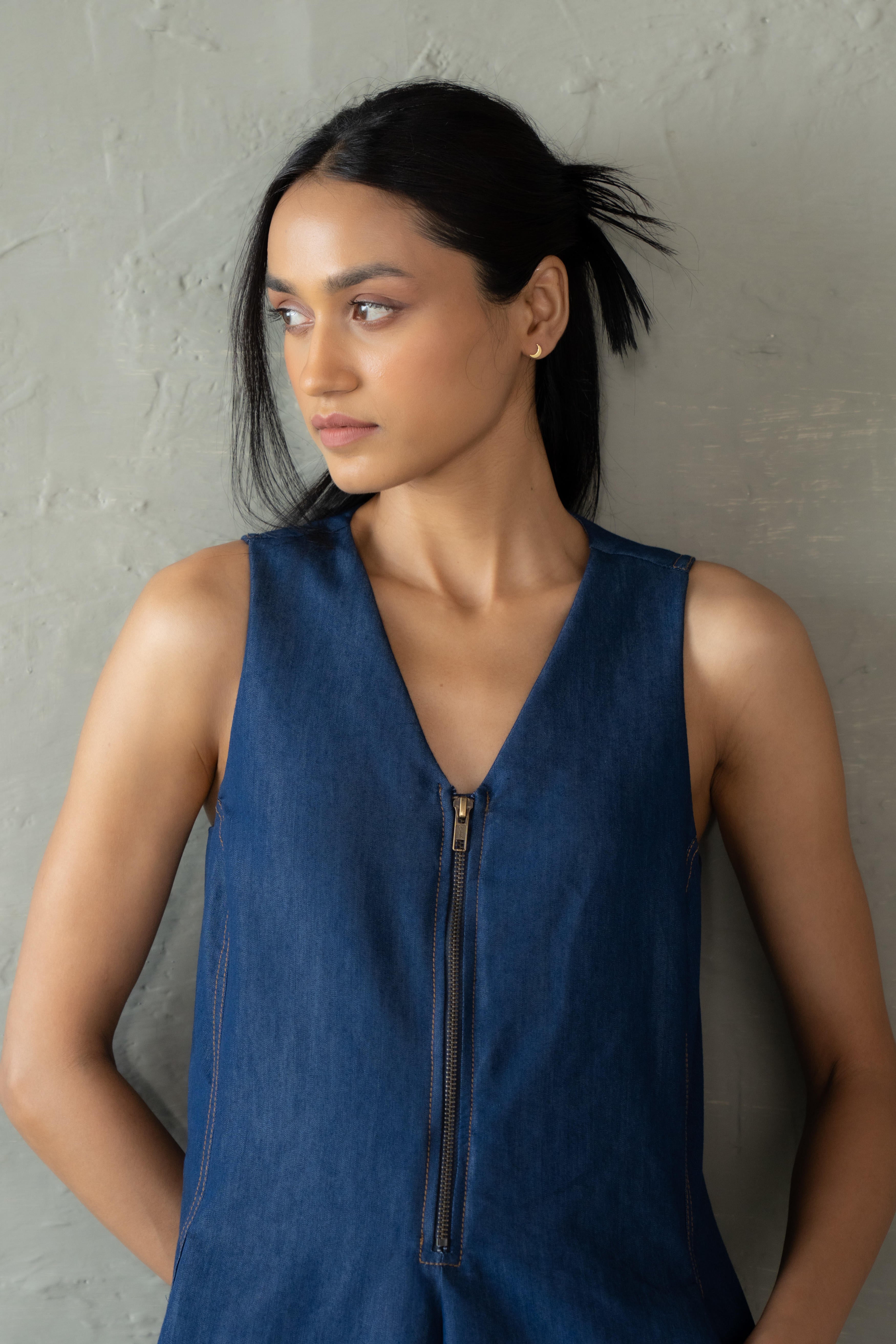 Cut in a clean, contemporary silhouette, this V-neck denim dress features a sleek metal front zipper for a modern edge. The highlight lies in its angular armhole cuts at both front and back, giving the dress an architectural character and standout appeal. Falling to a flattering midi length, it balances casual ease with statement detailing — perfect for day-to-evening transitions. Model is 5.9".