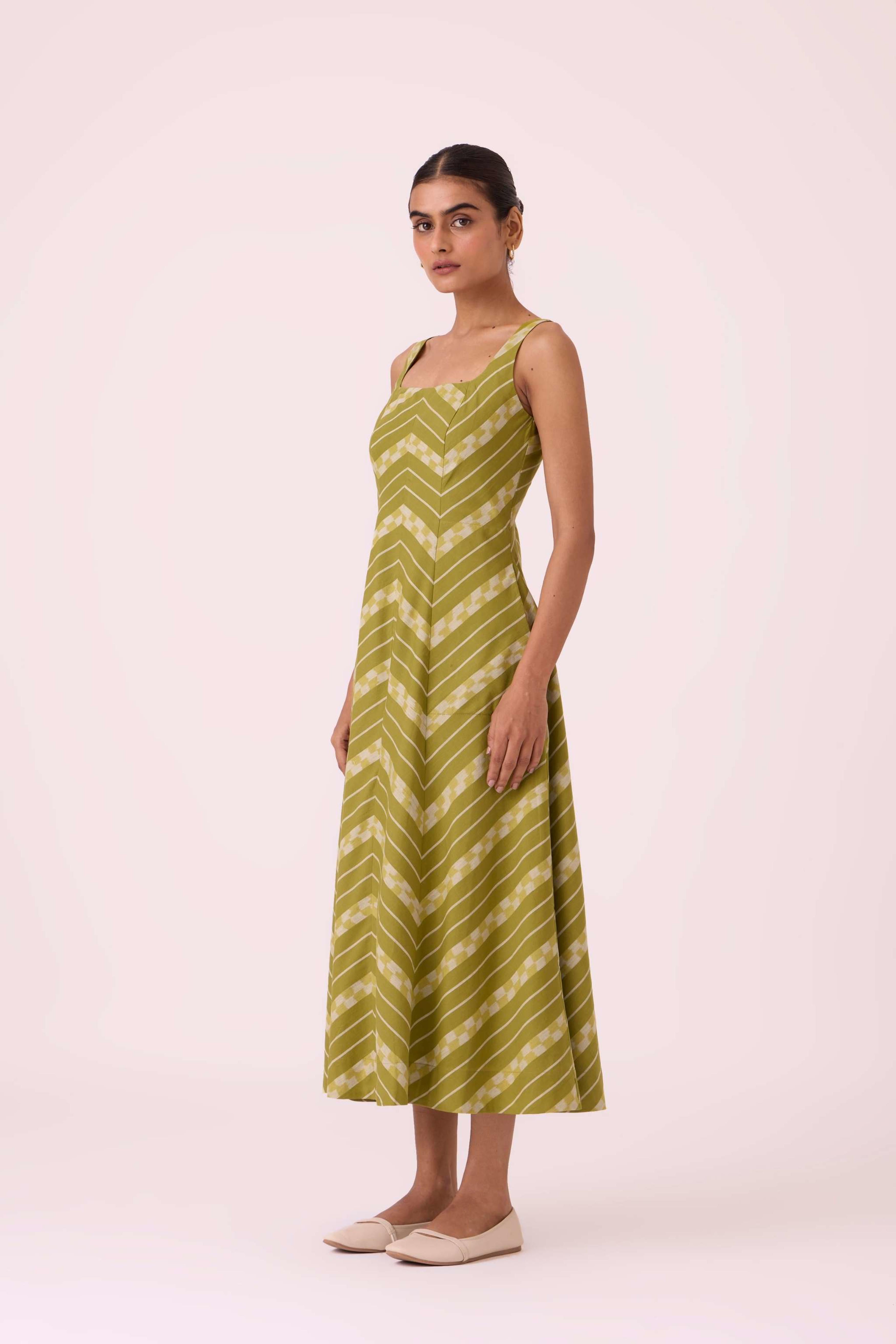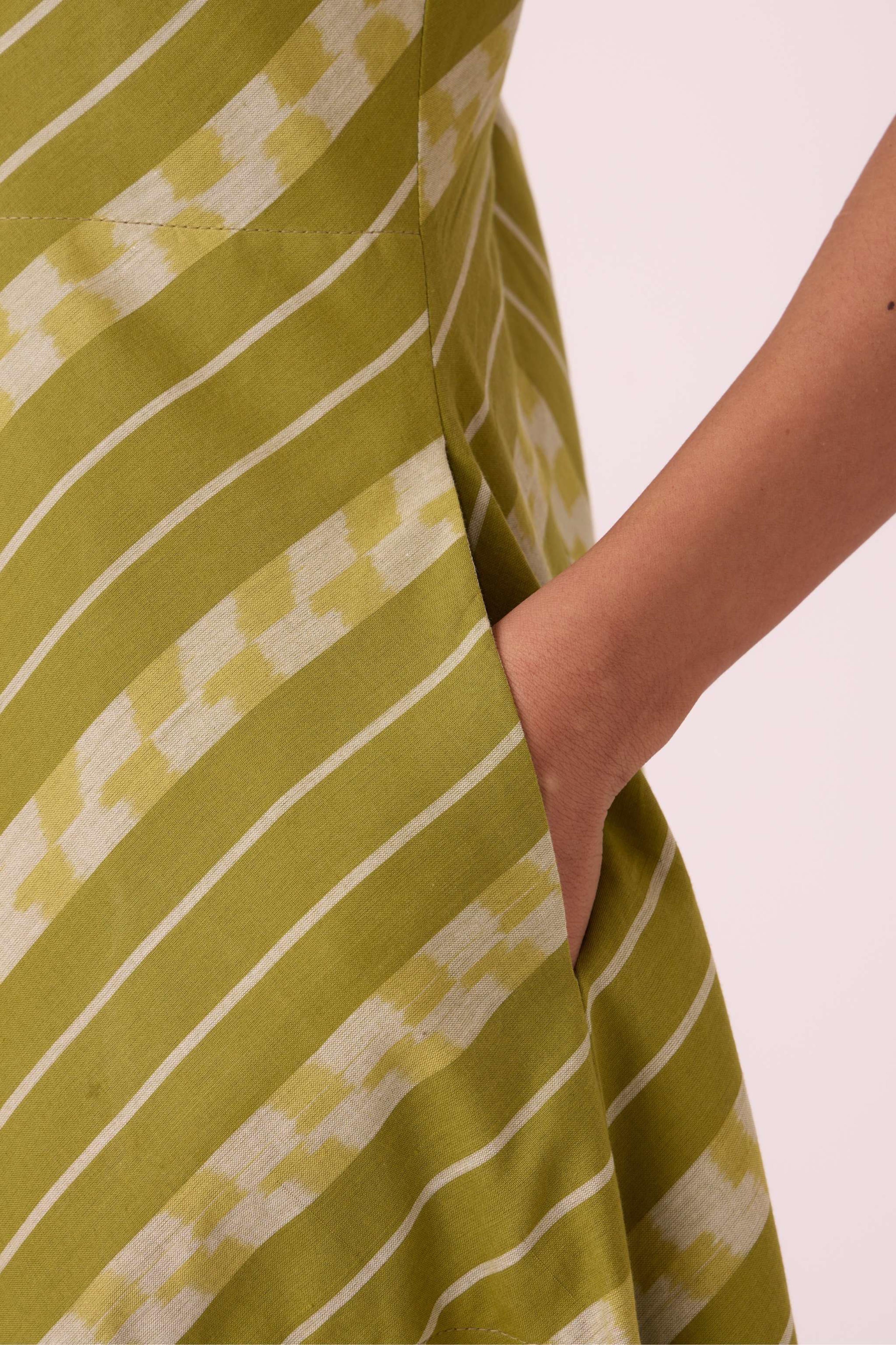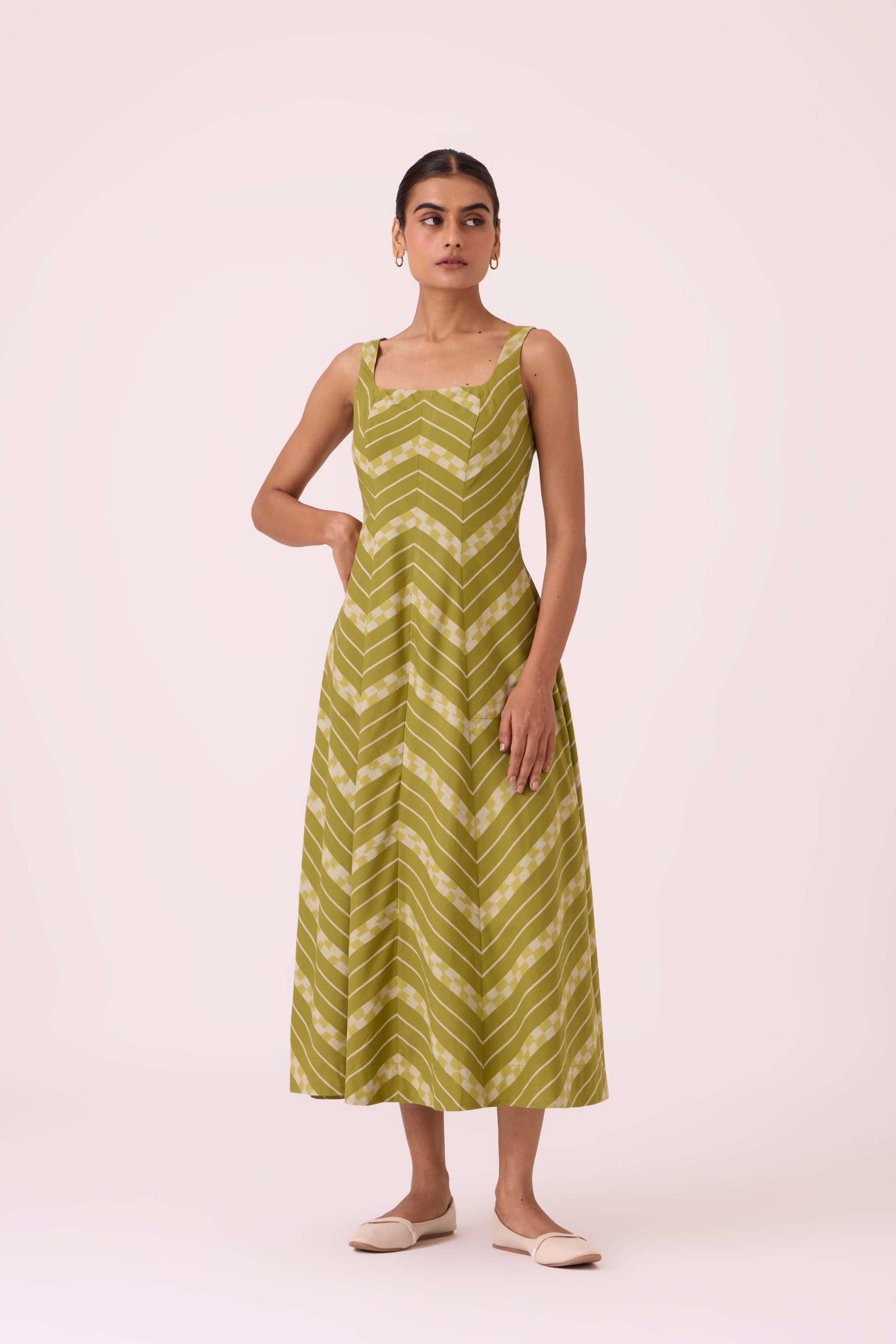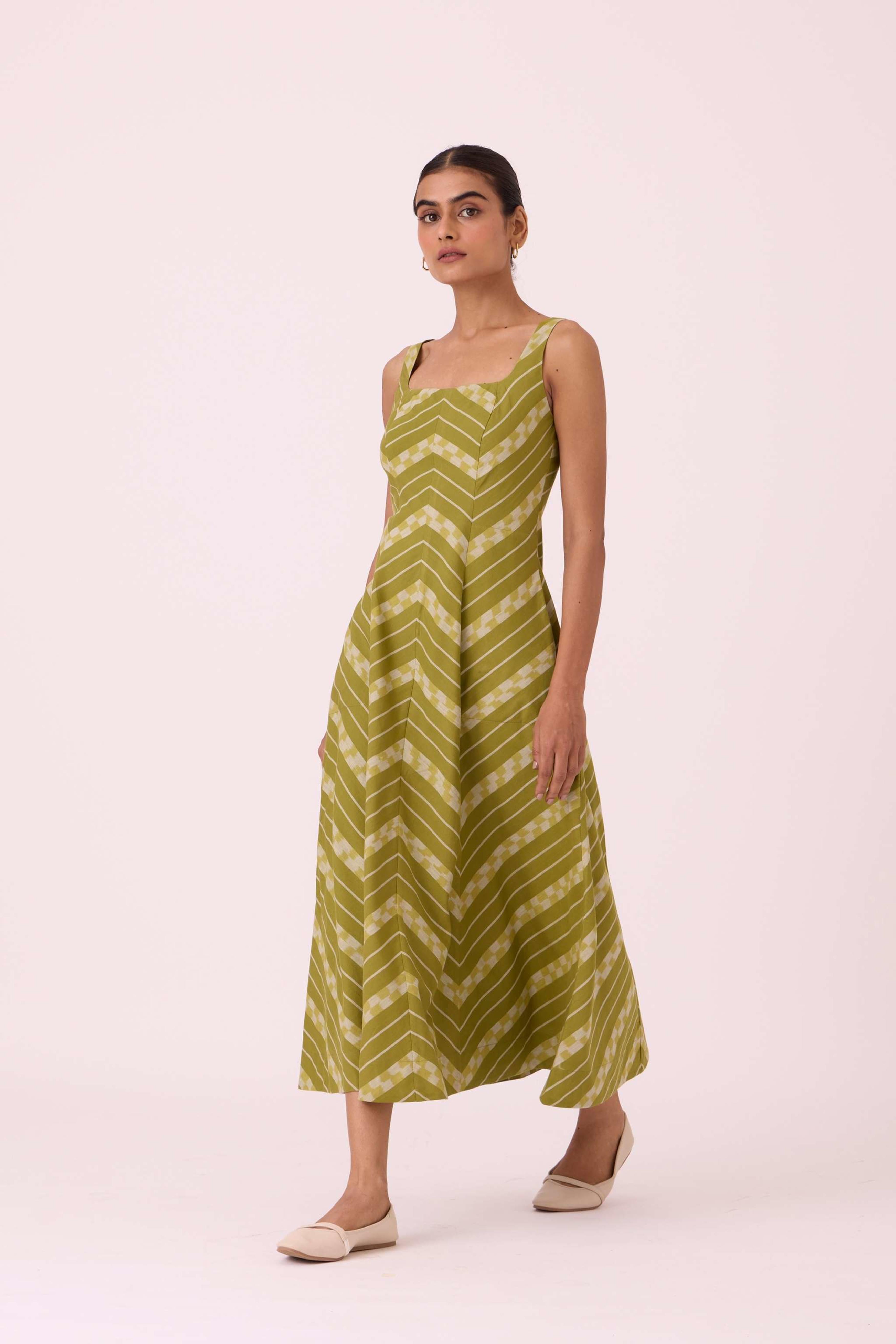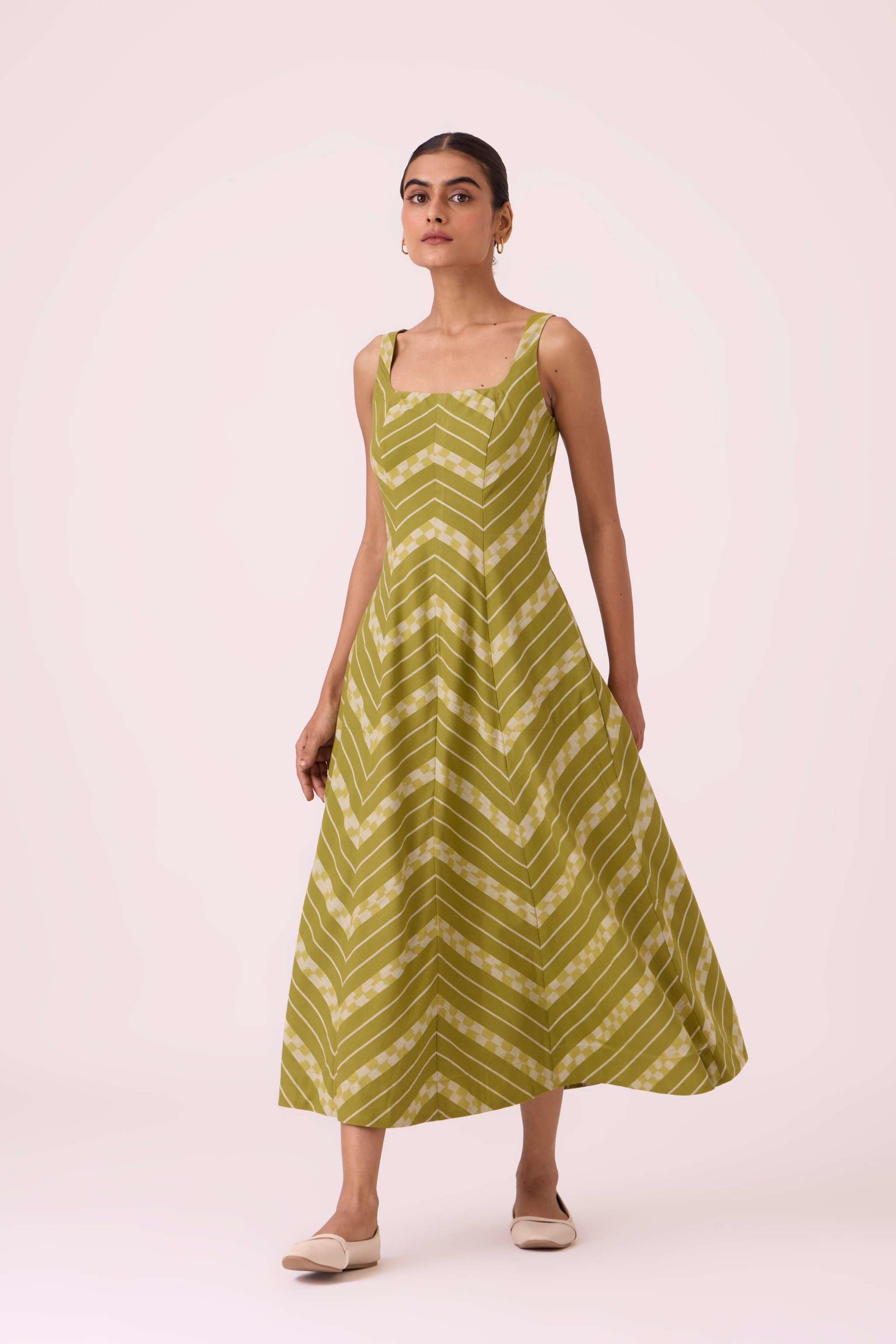 This *slim-fit dress* features a *square neck* and a *fit-and-flare shape* with *panelled* construction. It includes convenient *in-seam pockets* and a *side zip*. The dress is also *fully lined* for comfort. The fabric is an *Ikat design* that is *handwoven by artisans in Telangana*, and any slight irregularities are a natural result of the handmade process. For sizing, Chhavi, who is 5'6", is wearing an XS.