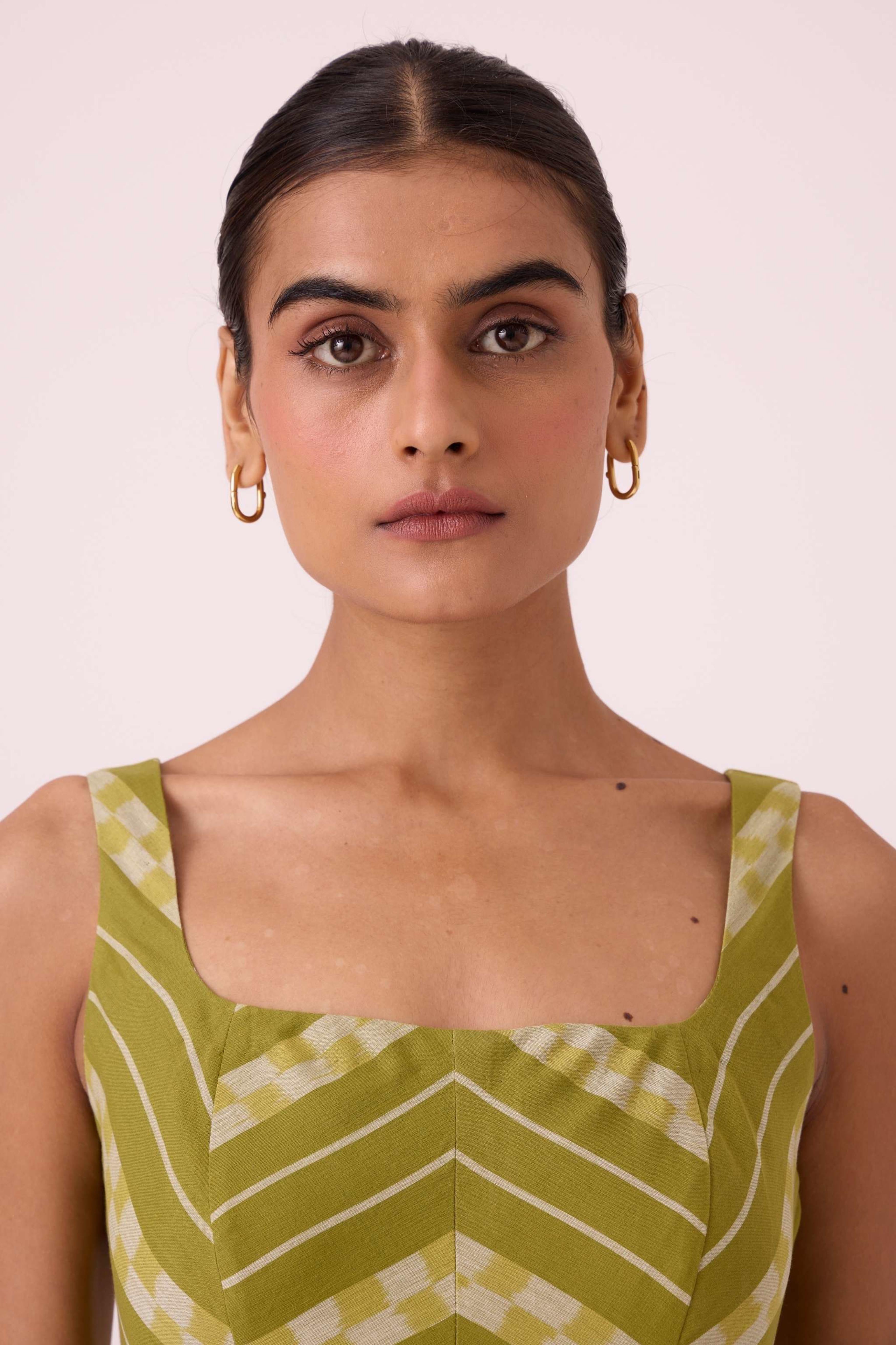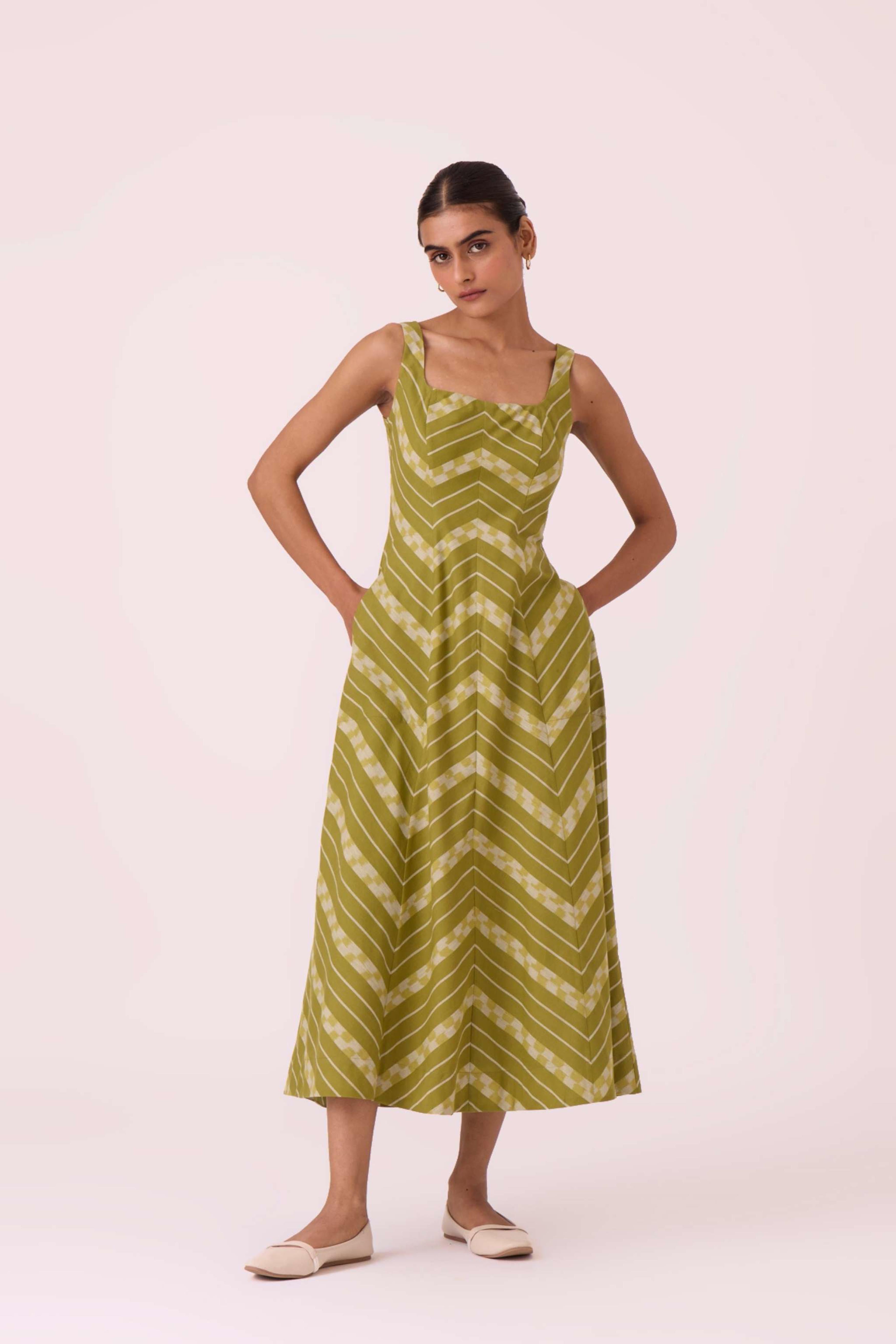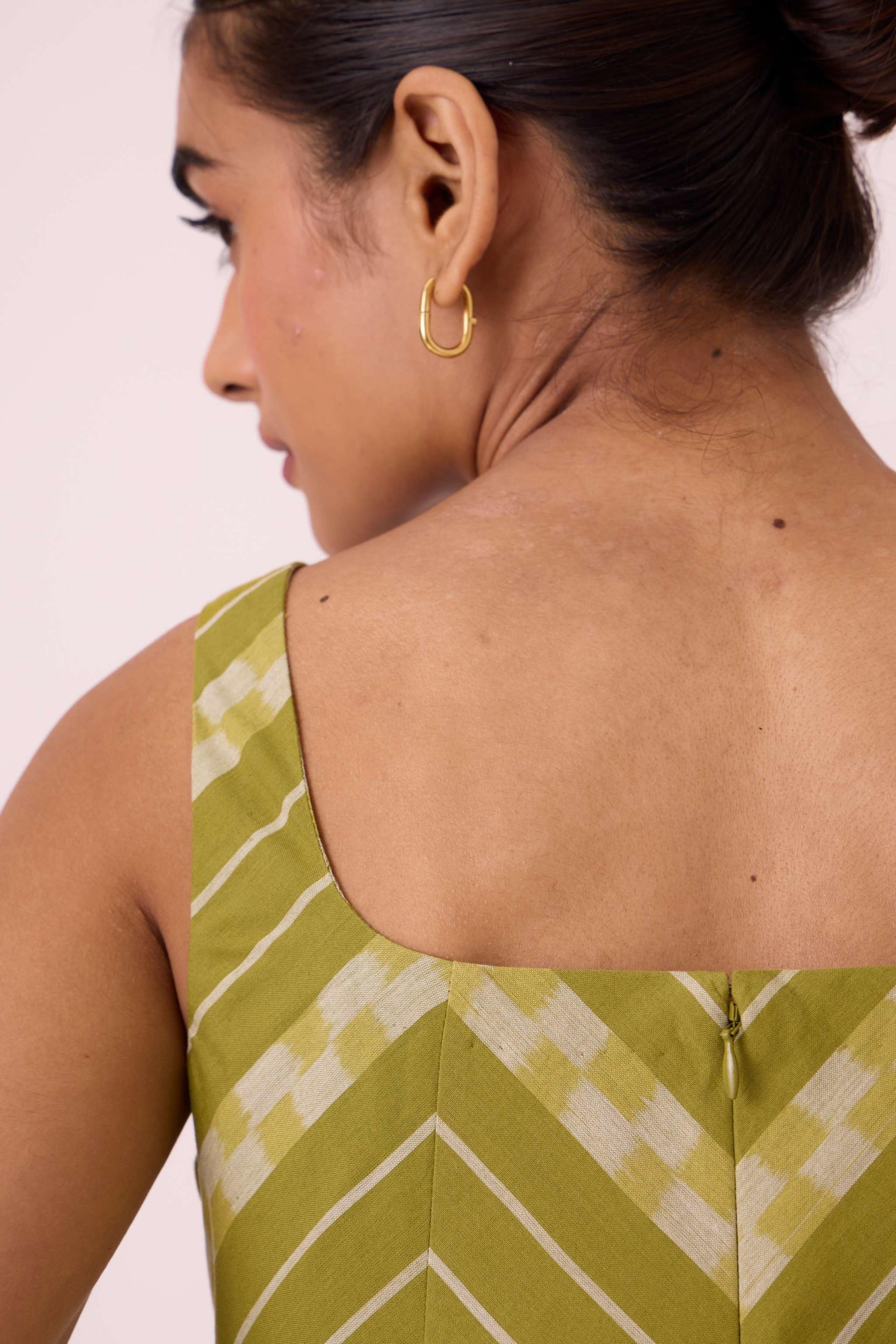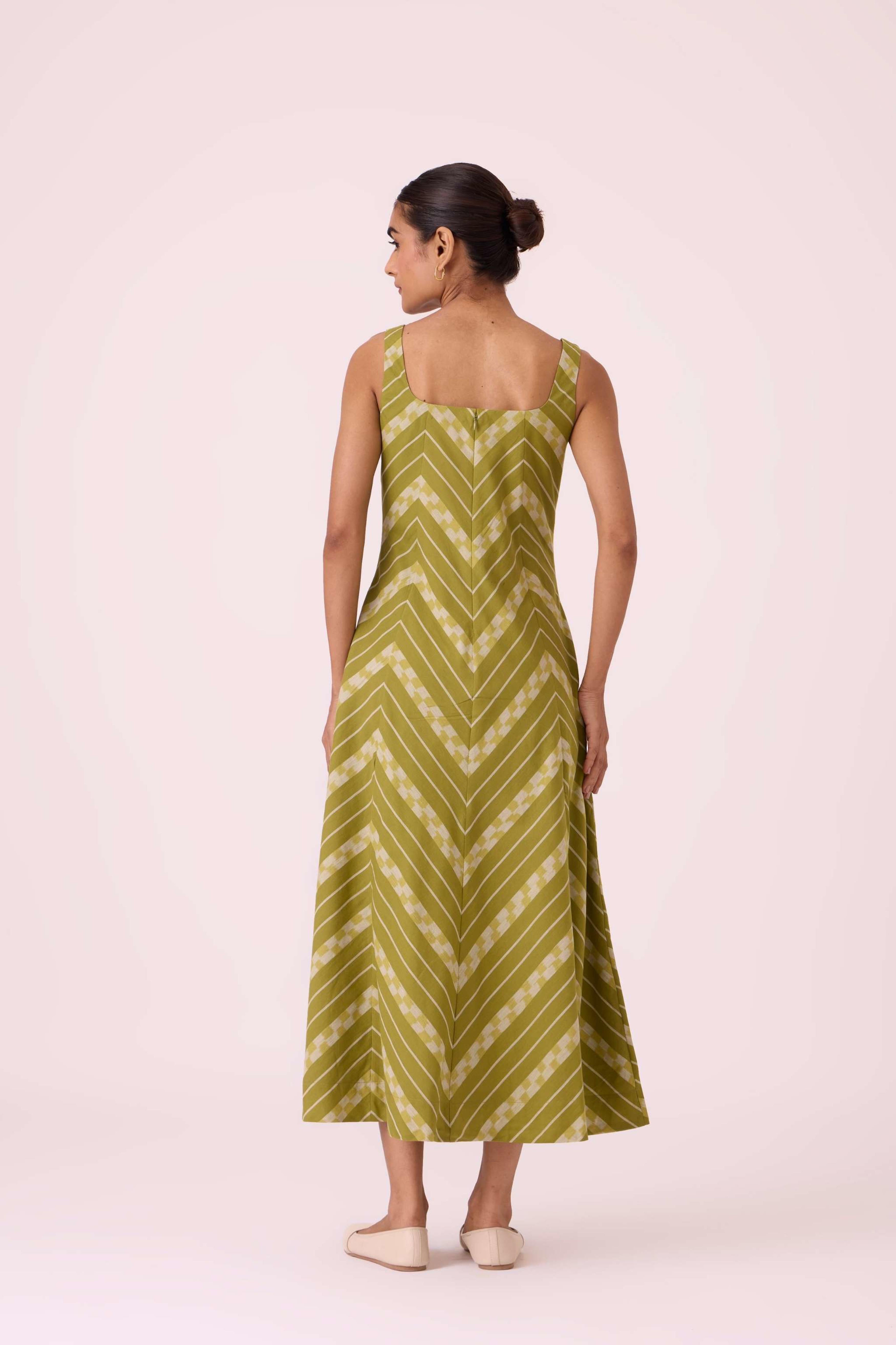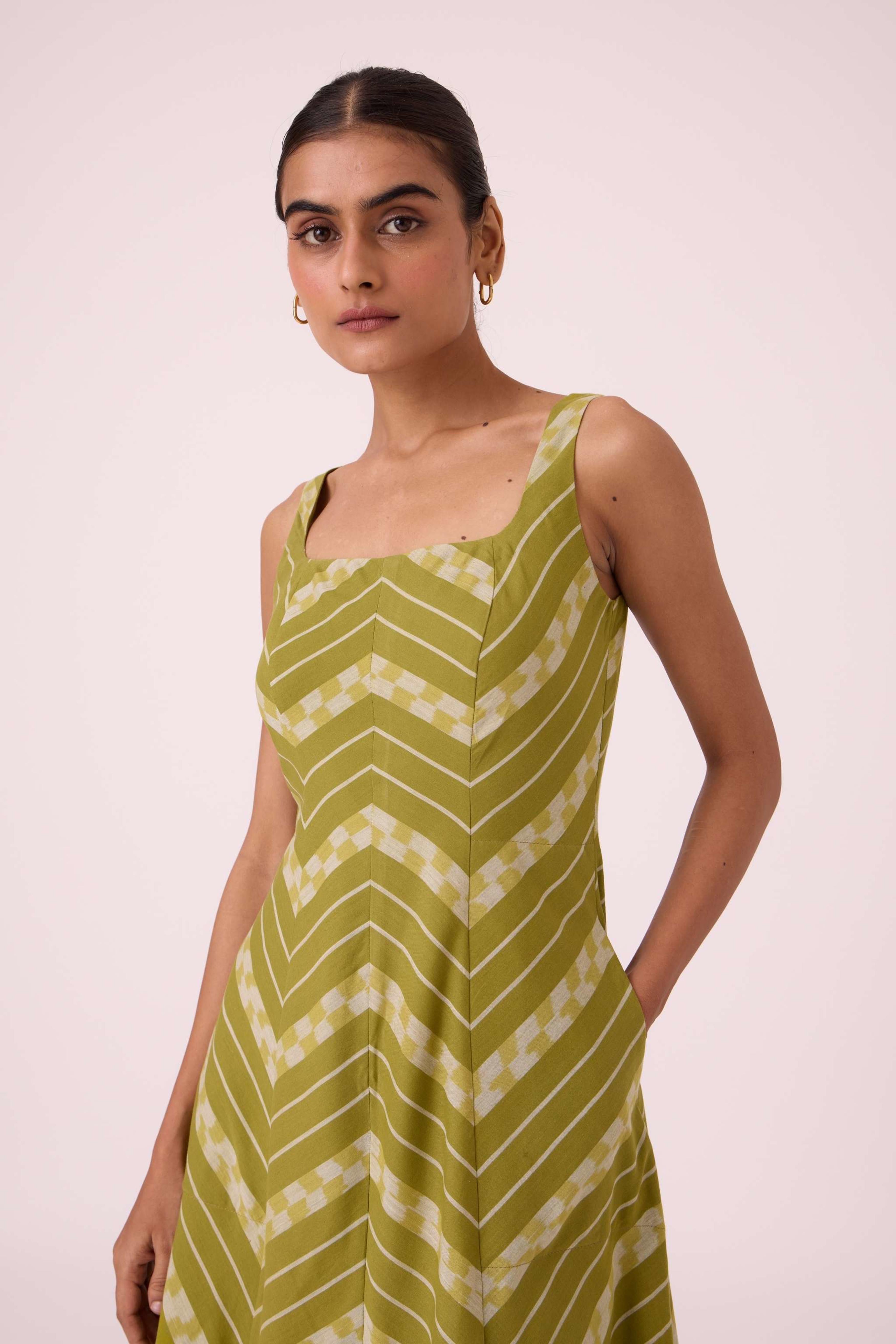 This *slim-fit dress* features a *square neck* and a *fit-and-flare shape* with *panelled* construction. It includes convenient *in-seam pockets* and a *side zip*. The dress is also *fully lined* for comfort. The fabric is an *Ikat design* that is *handwoven by artisans in Telangana*, and any slight irregularities are a natural result of the handmade process. For sizing, Chhavi, who is 5'6", is wearing an XS.