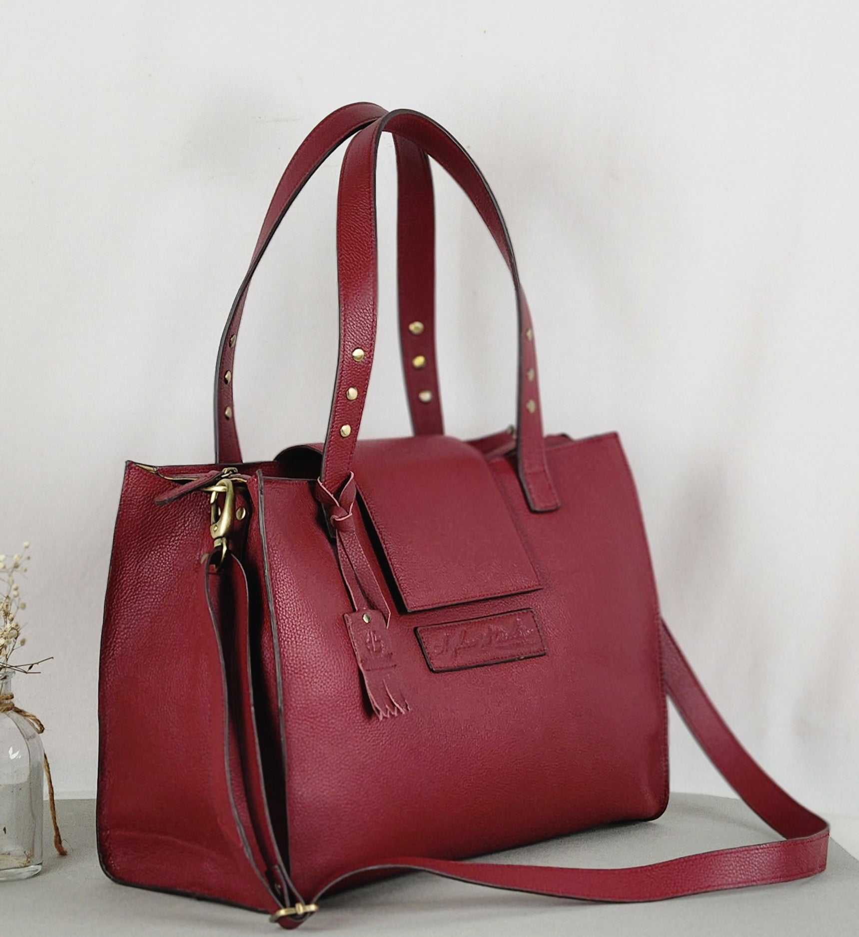 This minimalist structured tote is a perfect balance between form and function. She can comfortably fit a14″ laptop, documents and essentials. Pulling double duty as a work tote or a fun bag with the pack. Features a solid bottom, lined with our signature “HS” logo printed. A cotton zipper pocket and two small pockets, open slip pocket and one main compartment with top closure. It also has a zipper and a flap with a magnetic snap button hardware that is brushed antique.